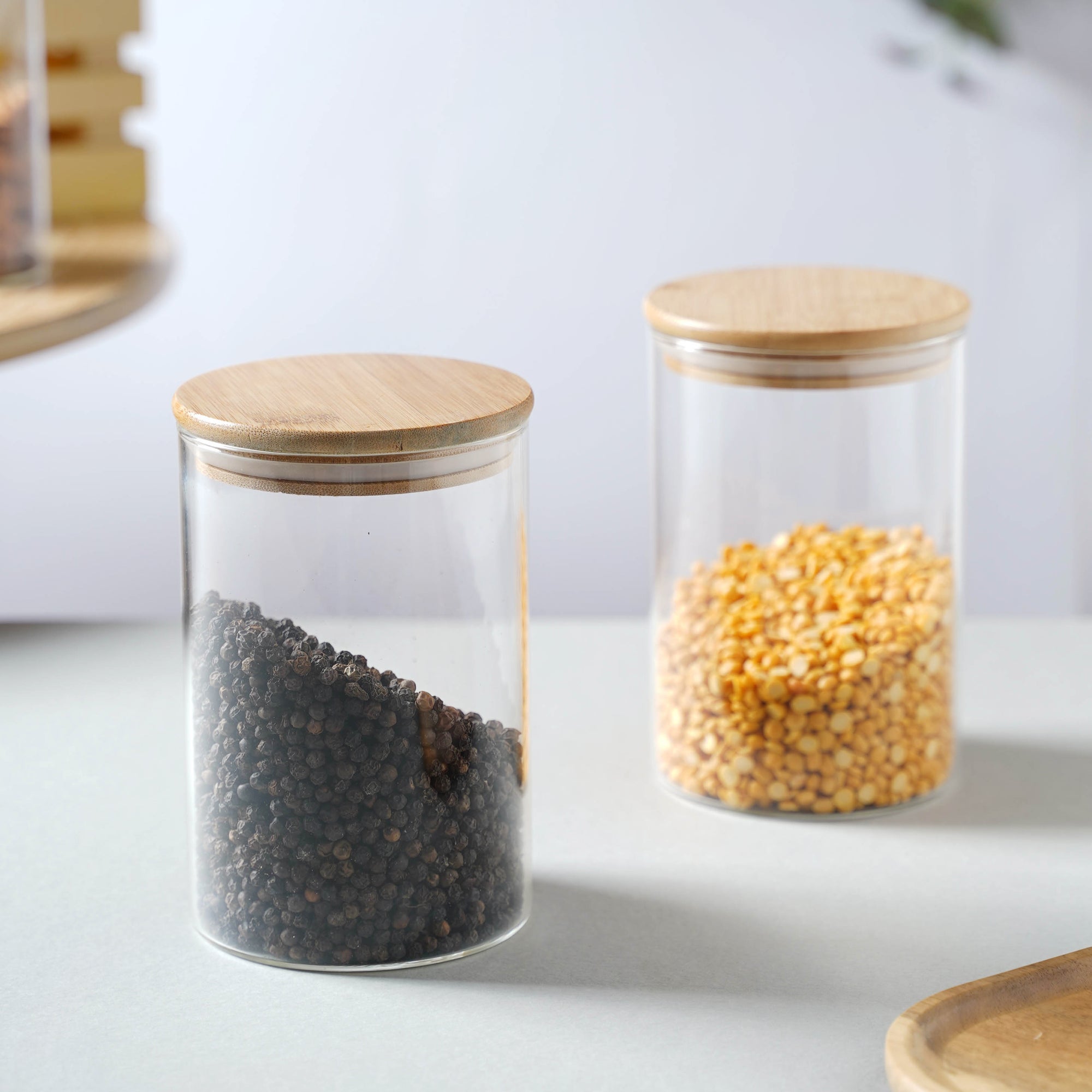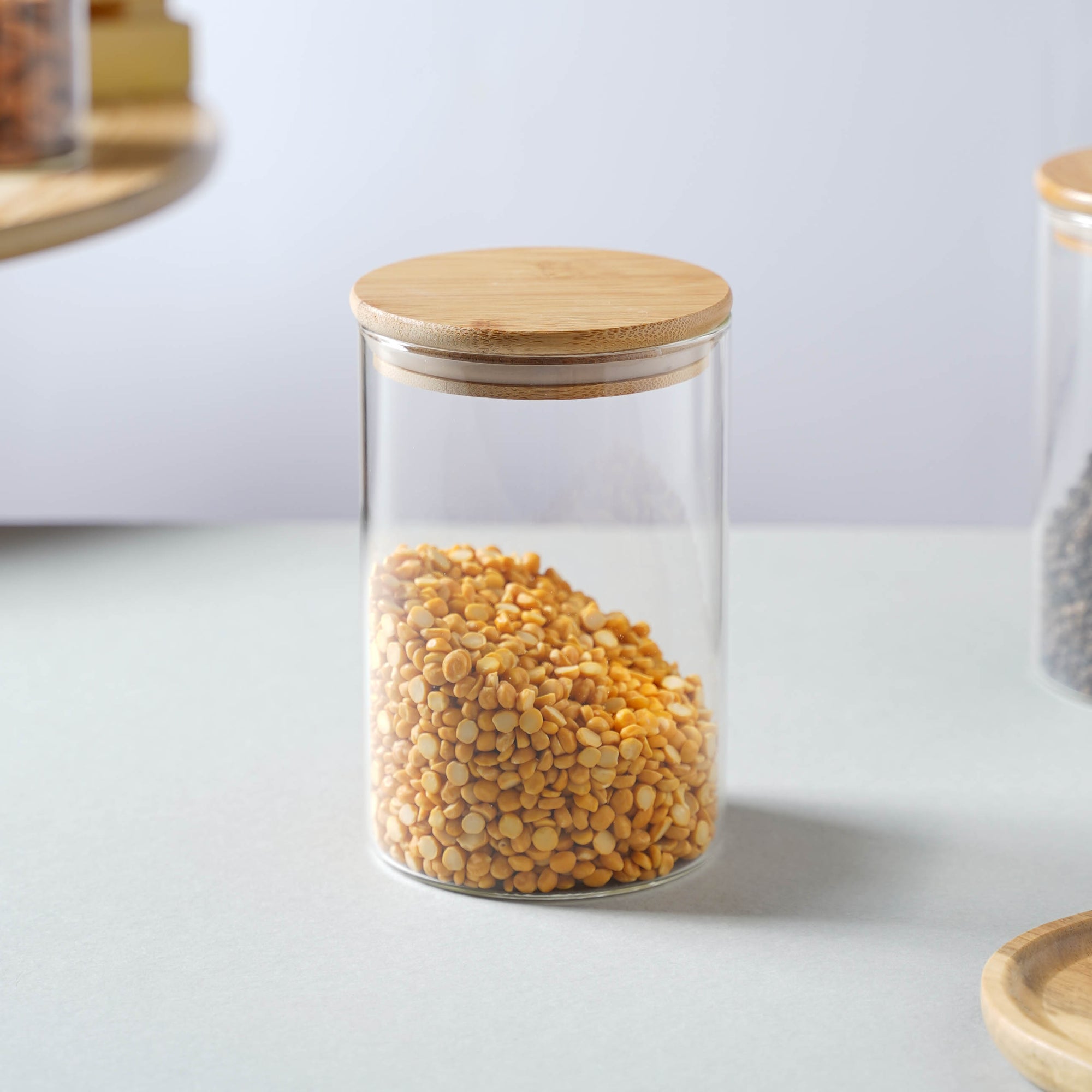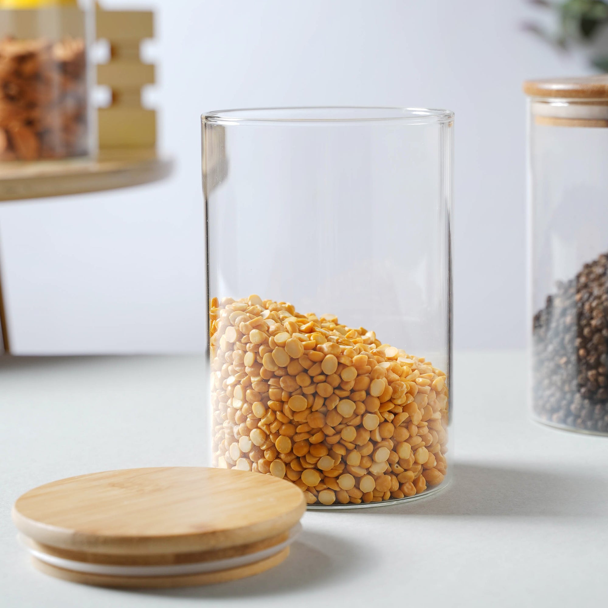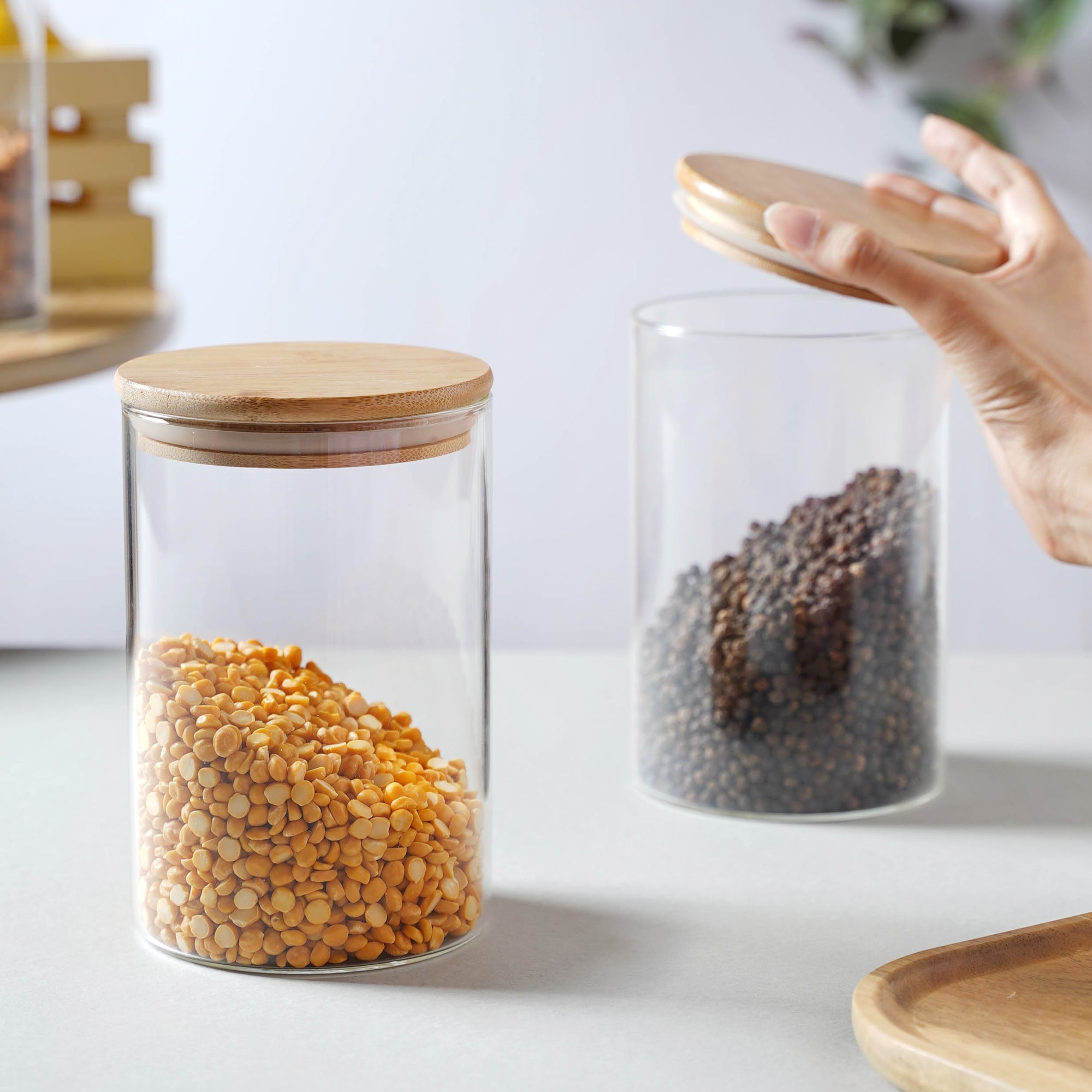 The airtight borosilicate glass jar with a natural wooden lid has a capacity of 1100ml. The jar can be utilized for storing dry fruits, dry snacks, quick bites, puffed rice, or any other snack of one's choice. The jars are very useful, easy to clean, and ideal for safely packing food. The candy jar is the apt solution for all grocery stacking needs. The containers come handy when there are guests at home and one does not have to run to the kitchen every now and then to get them some snacks because the elegant-looking bottle jars are already adorning the table.