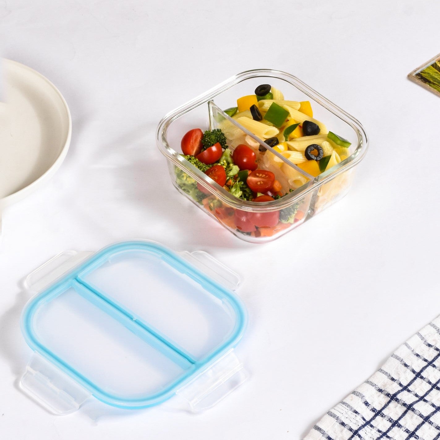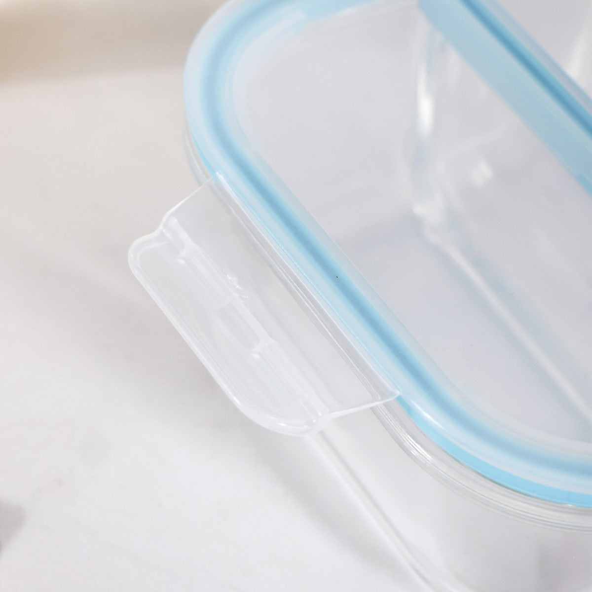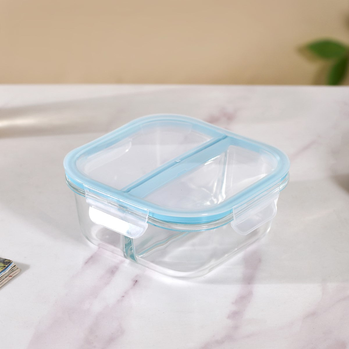 Food-safe & lead-free High borosilicate glass Non-toxic & eco-friendly Airtight top lid Clip locks on 4 sides Lid with a silicone ring 2 separate compartments Inter-compartment leak-proof Square in shape Microwave-safe Transparent design Easy to clean Ideal for gifting