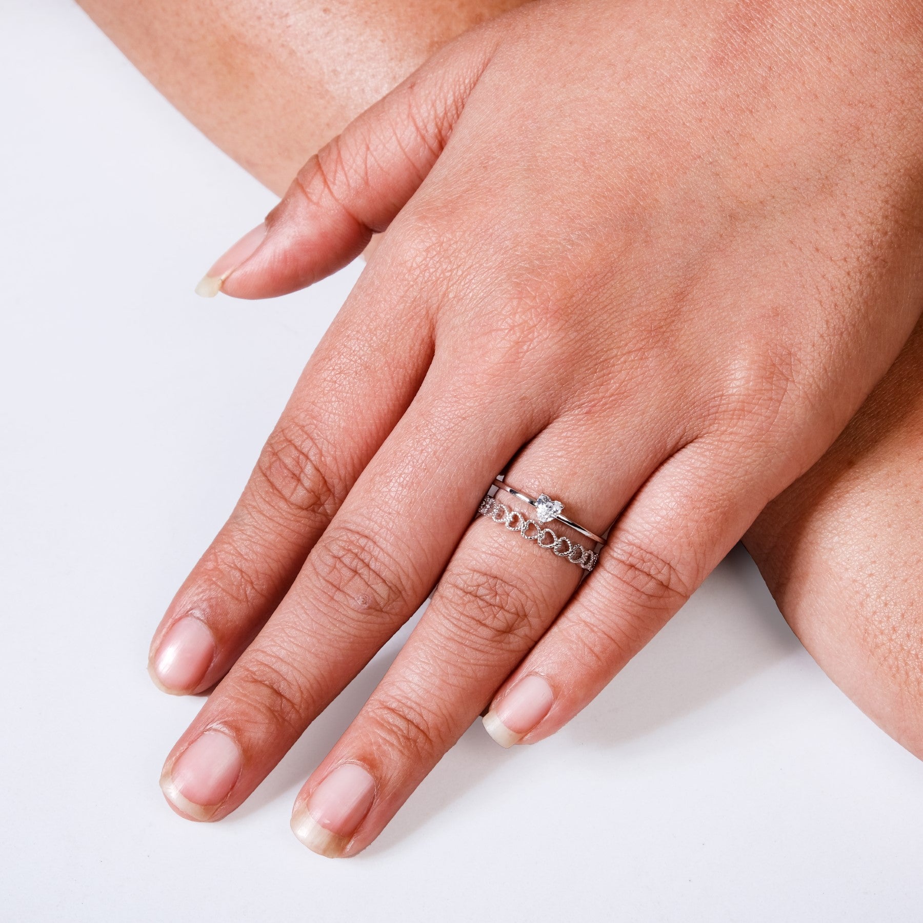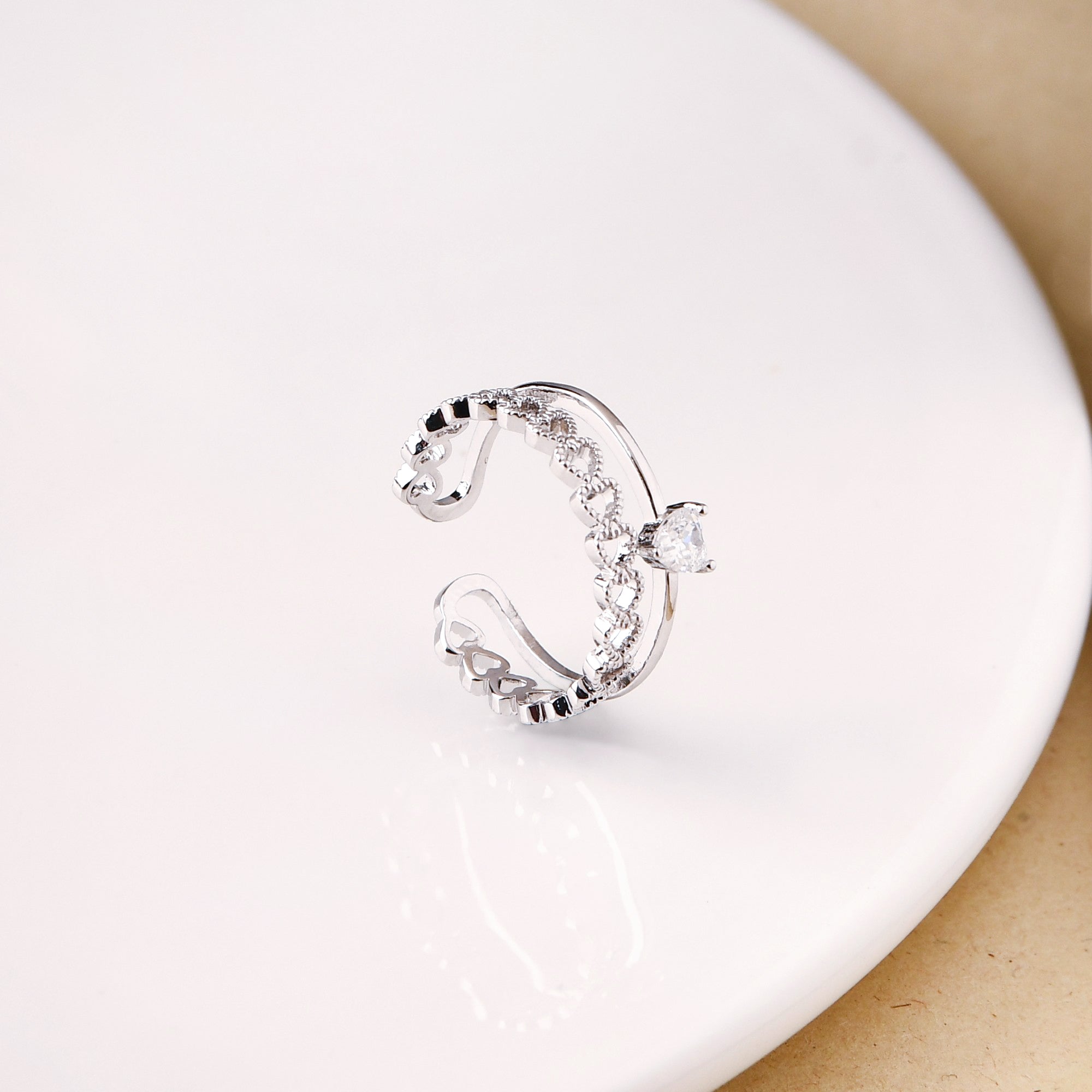 We all are in love with this dainty silver ring that features a charming double-loop design. One loop is delicately adorned with a heart-shaped stone, while the other is made from intertwined hearts, giving it a romantic touch. Adjustable to fit any finger, this silver ring is perfect for daily wear or as a thoughtful gift. Its heart details add a sweet, sentimental element to any outfit.