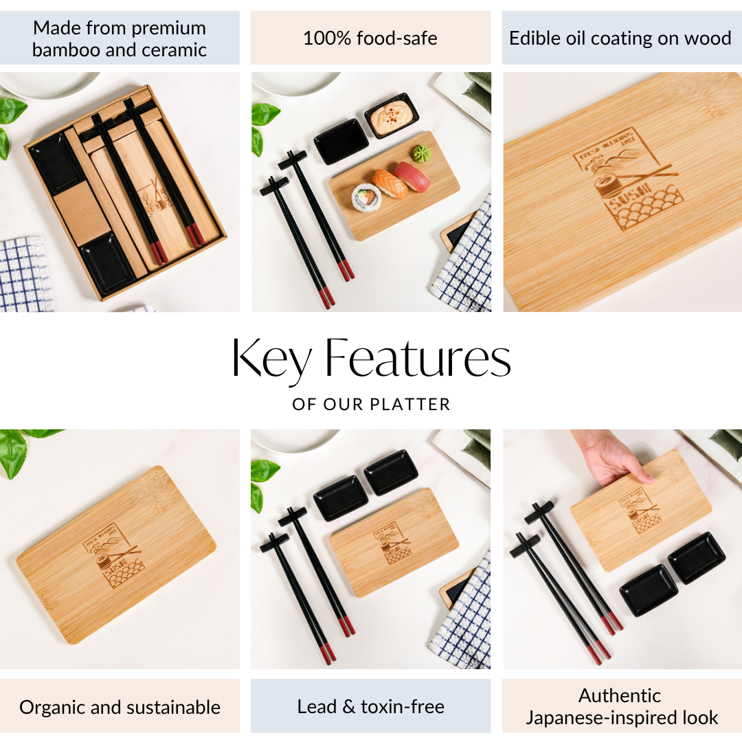 Turn every sushi night into a sensory escape with this sushi kit, where bamboo wood and ceramic meet to craft the perfect Japanese dining experience on elegant serving platters.