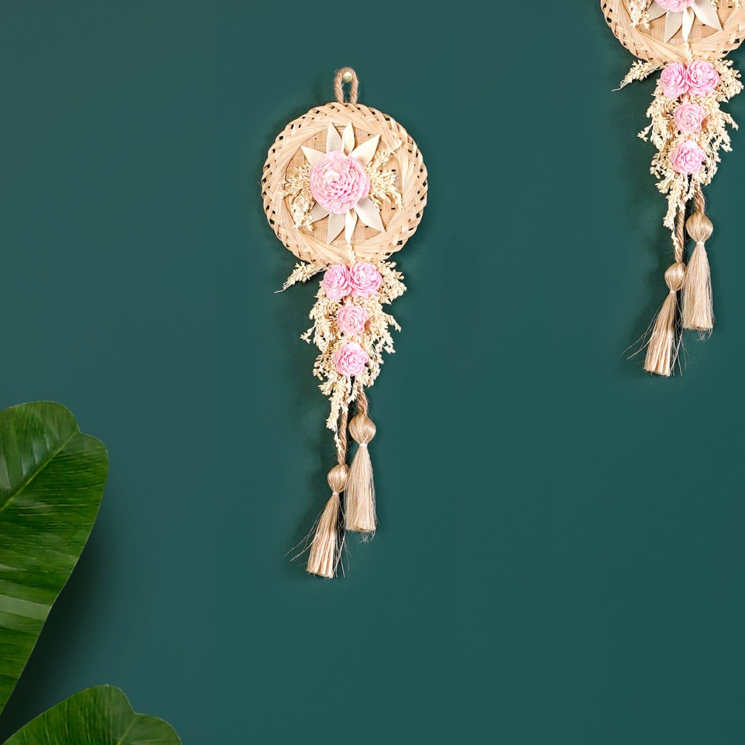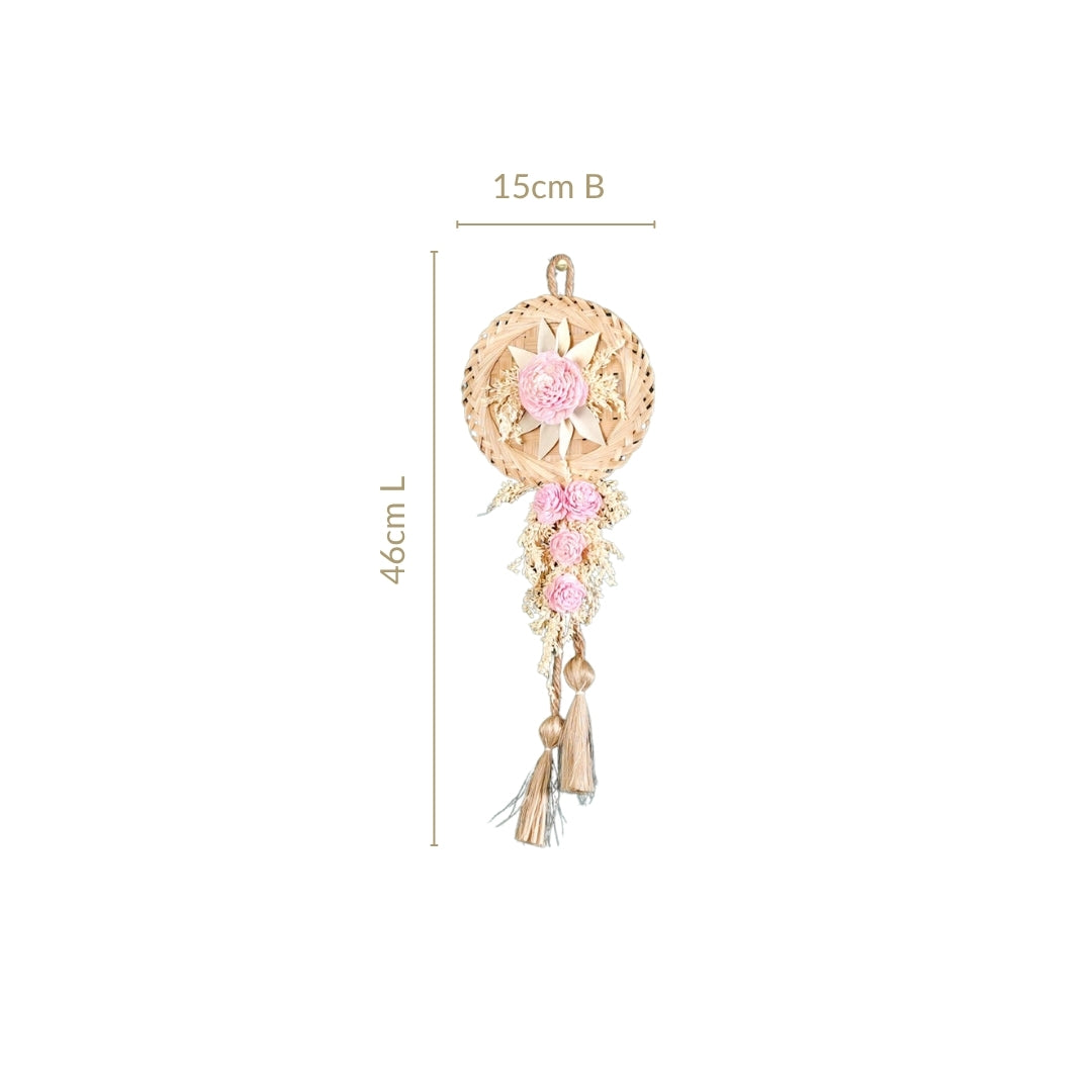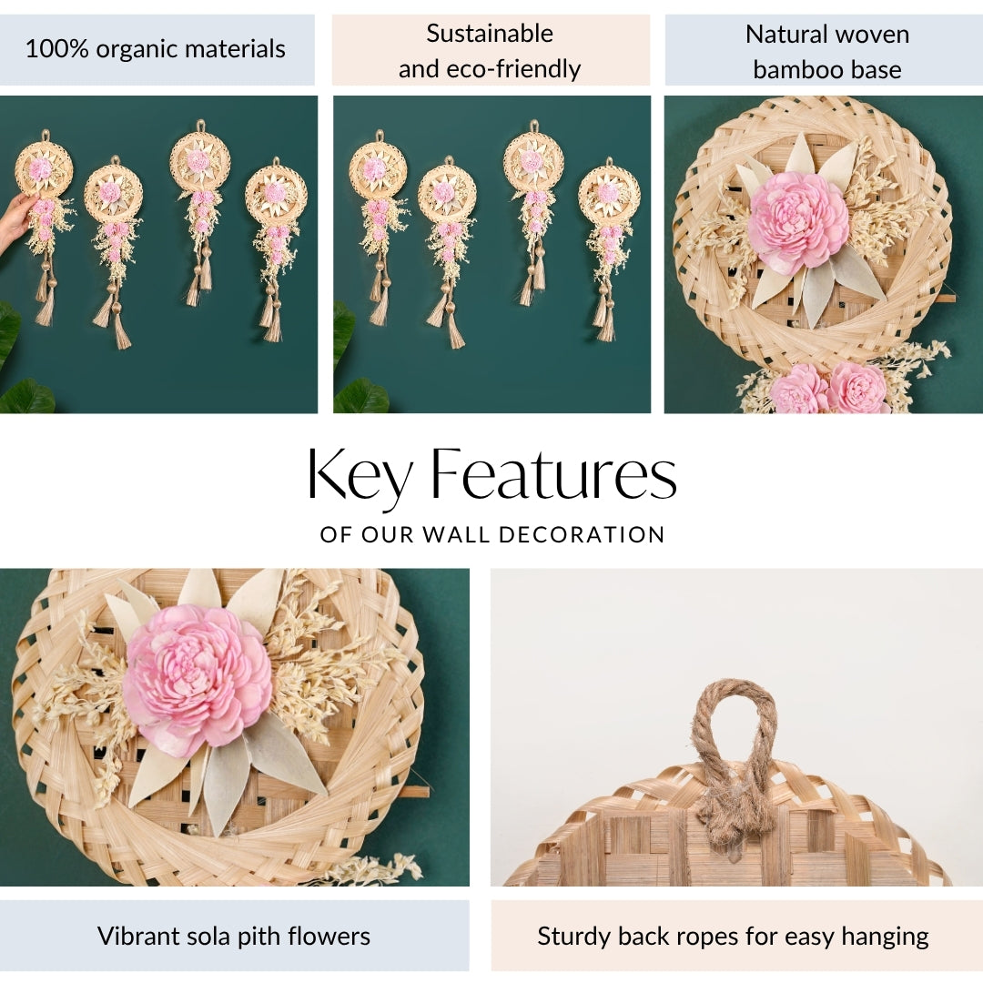 Design: Bring home the essence of nature with our sustainable dried flowers wall decor. Each piece is a charming blend of elegance and eco-conscious craftsmanship, perfect for homes that value both beauty and sustainability. Crafted from eco-friendly materials like sola pith flowers, dried palm leaves, and natural jute, this decor set embraces sustainability without compromising style. The round bamboo base lends earthy structure while the cascading florals and cream-pink tones create a soft, romantic look perfect for modern rustic homes. Designed to bring warmth and personality to your walls, these decor pieces feature lifelike sola wood roses, dried foliage, and soft jute tassels.