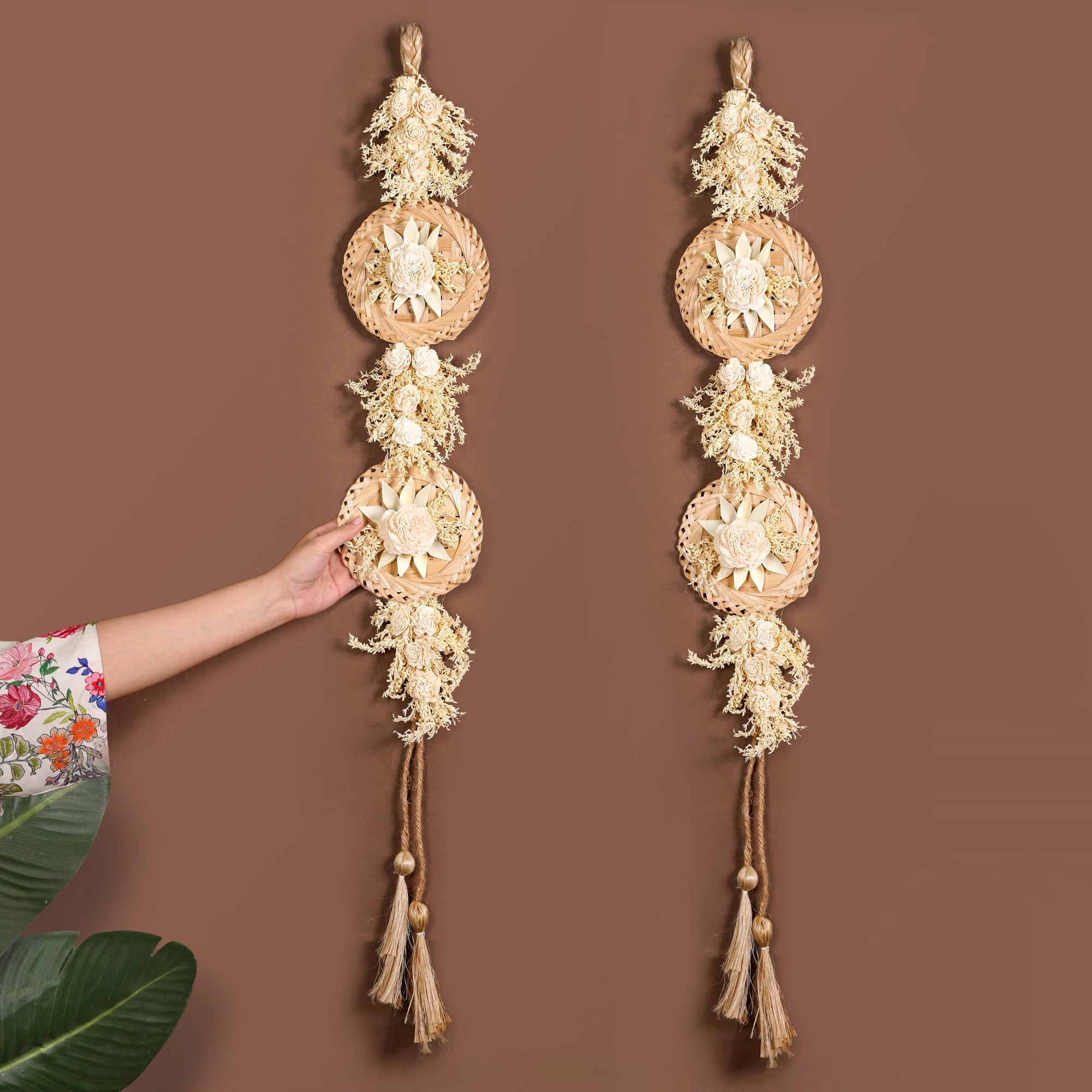 Design: This beautiful wall decor set features a series of circular jute bases, each showcasing soft beige sola pith flowers. The woven bases are connected with flowing bunches of naturally dried grasses and smaller beige sola blossoms. This creates a gentle, cascading design that adds a beautiful, organic texture to your walls. The entire piece is crafted from biodegradable materials, making it a beautiful and sustainable choice. The piece is finished with charming jute tassels at the end for an added touch of rustic elegance.