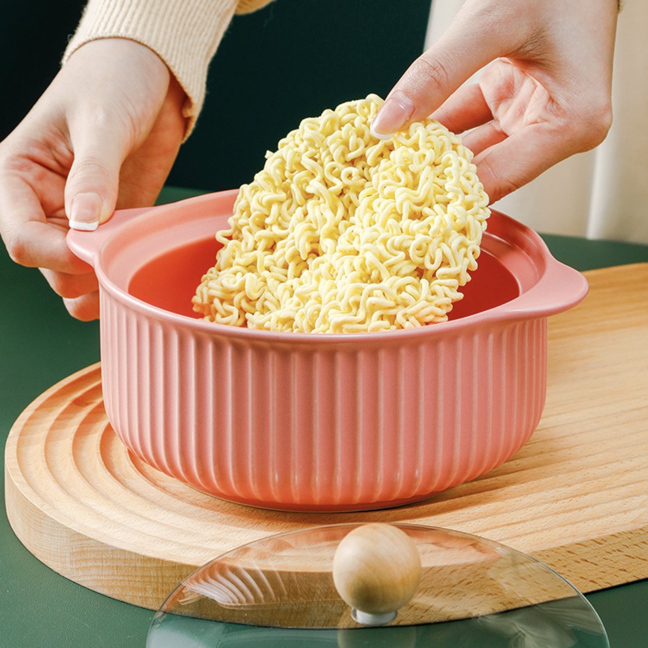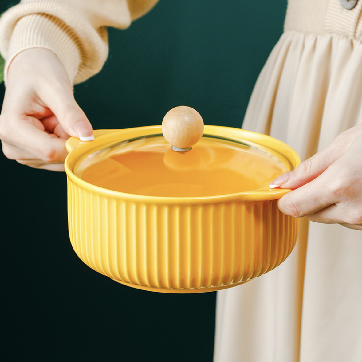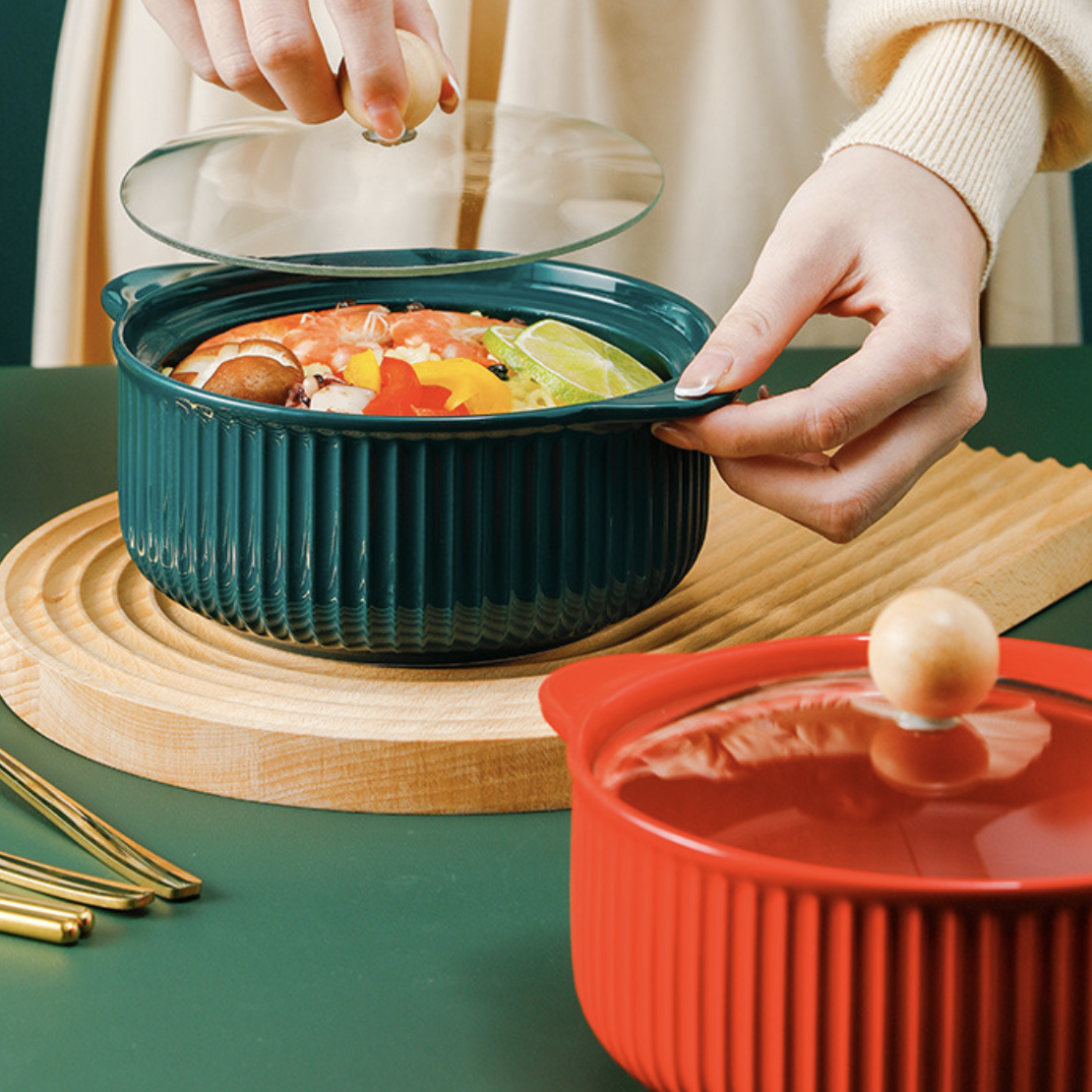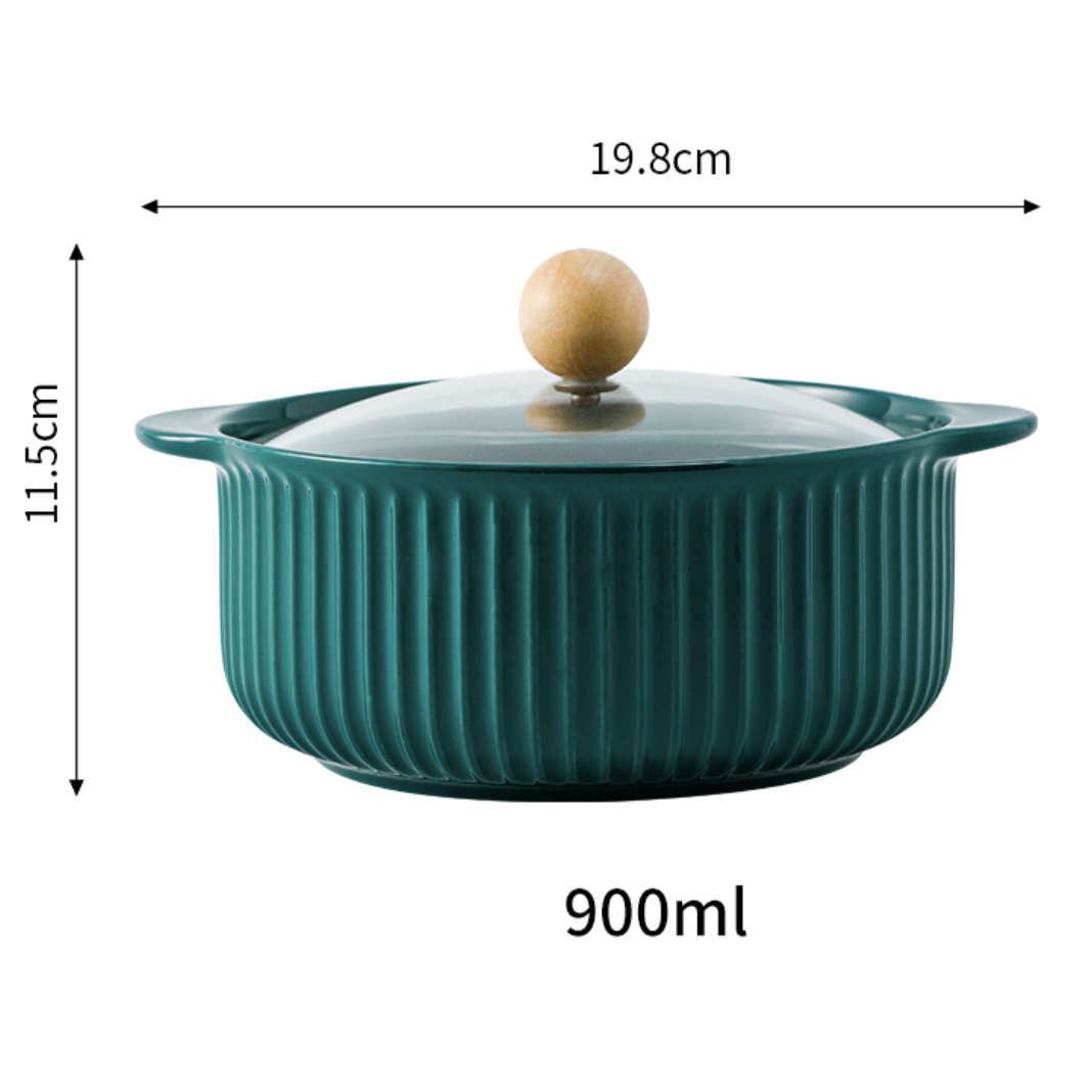 A serving pot made of ceramic that has a handle and a lid can be used to serve a range of foods, including soups, stews, casseroles, sauces, and more. The glass cover maintains flavors and keeps food warm.