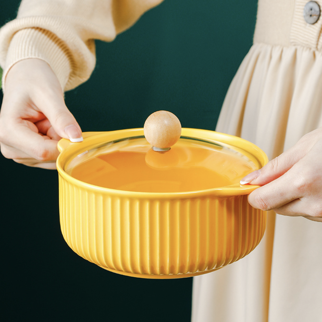 Use oven mitts or heat-resistant gloves to handle the pot and lid carefully when they are hot. Use caution to prevent burns and mishaps since the ceramic and glass surfaces can trap heat.