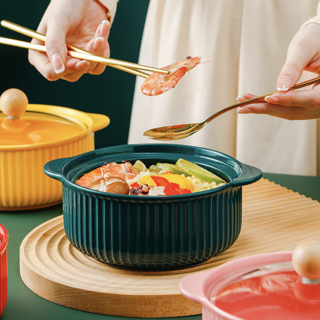 Can I slow cook or braise food in the ceramic serving pot with a glass lid?