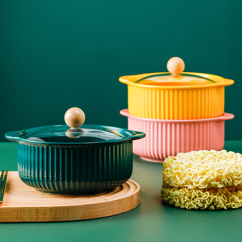 A serving pot made of ceramic that has a handle and a lid can be used to serve a range of foods, including soups, stews, casseroles, sauces, and more. The glass cover maintains flavors and keeps food warm.
