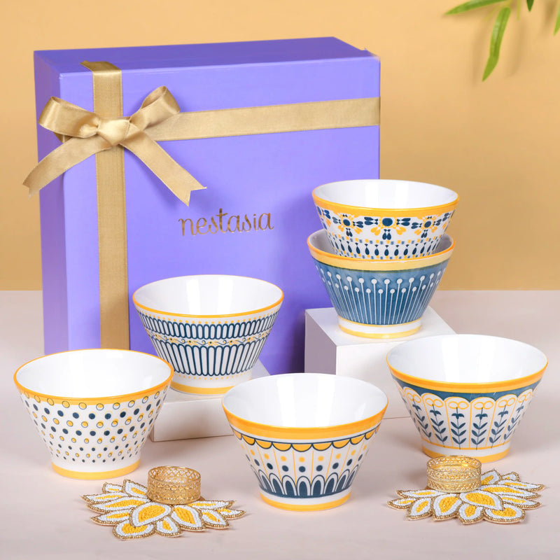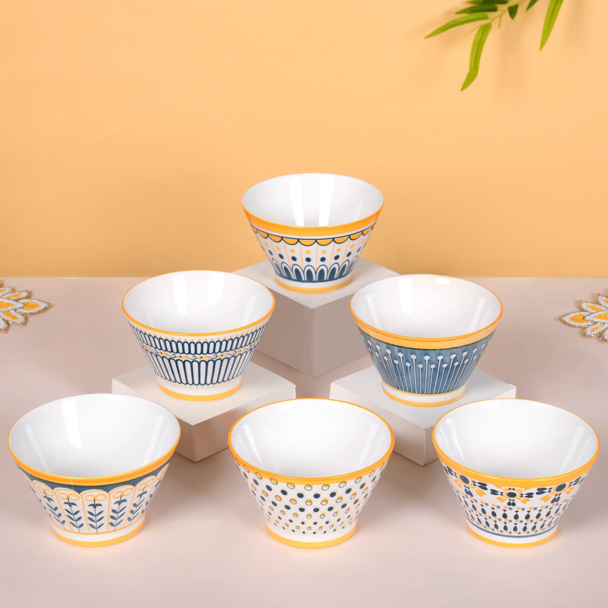 The ceramic ramen bowls are designed to elevate your dining experience during family gatherings and dinner parties. Each bowl features hand-painted artistic designs with vibrant colour combinations of white, blue, and yellow, adding a touch of elegance to your table setting. These bowls are perfect for serving soupy ramen noodles, momos, or tasty appetizers, making them ideal for setting up a sumptuous snack table. Their unique patterns and designs also make them a stunning addition to your table decor.