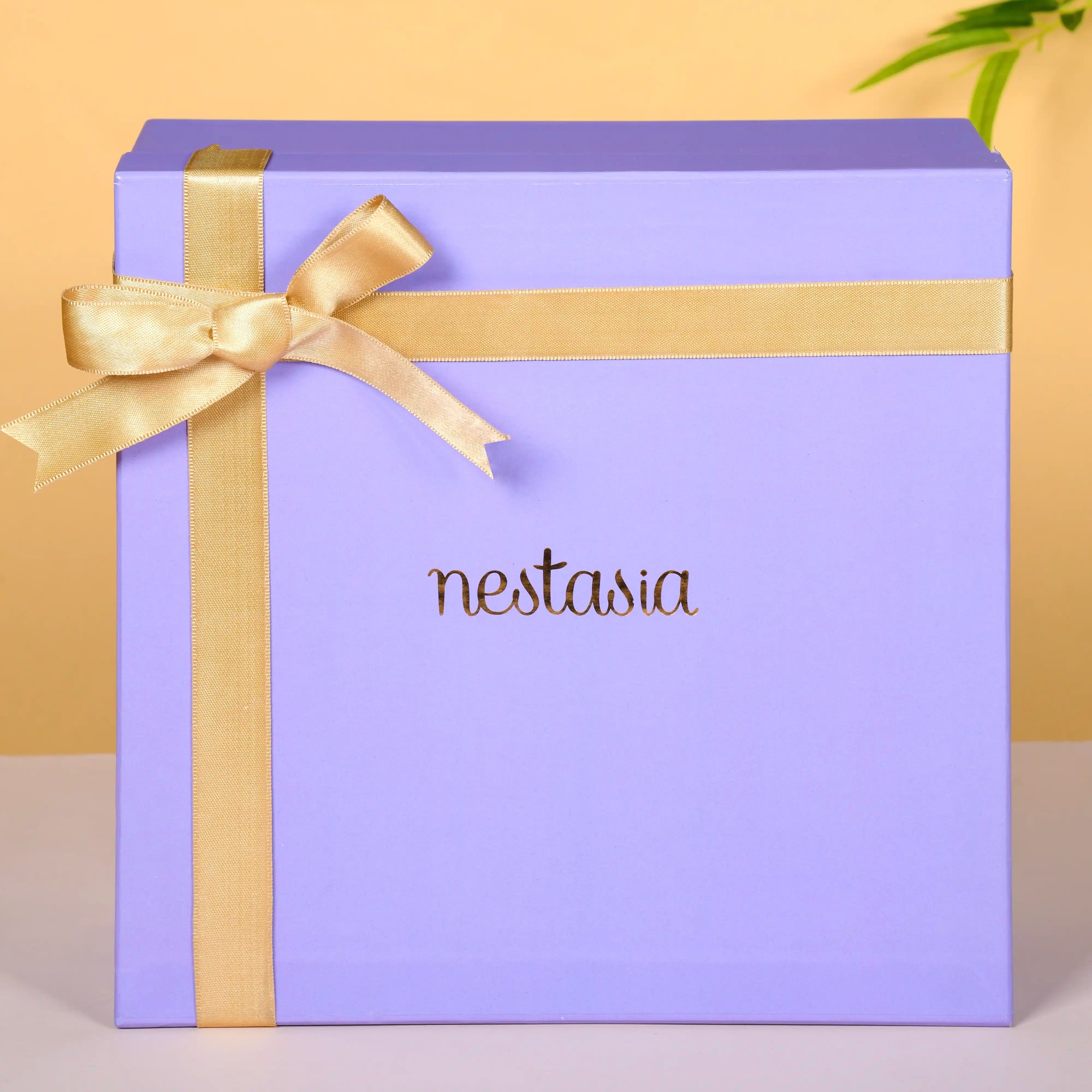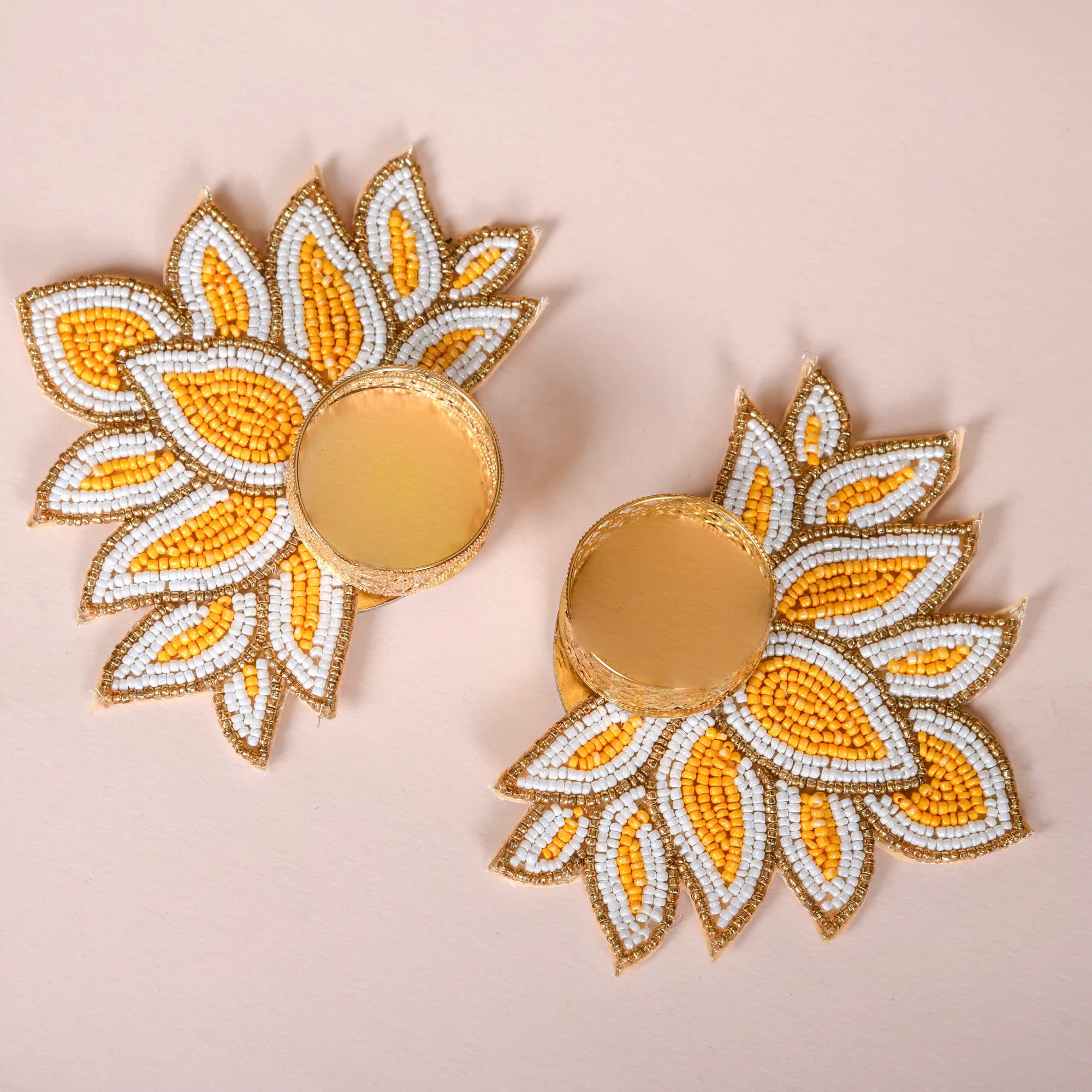 The festive gift hamper is a delightful ensemble that combines charm and elegance. The hamper features two enchanting lotus tealight holders adorned with white and yellow beads, creating a mesmerizing display when lit. Crafted with intricate exterior patterns, the golden metal base of the tealight holders adds opulence to your decor.