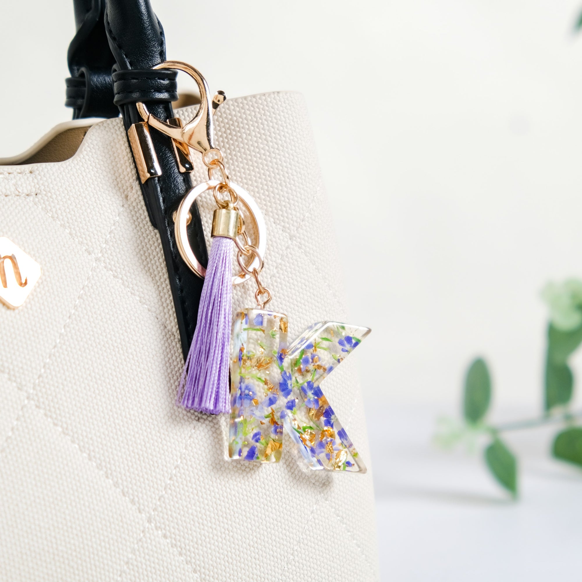 Add a personal touch to your daily essentials with the resin keyring in the letter "K." The keychain features a transparent resin case that beautifully highlights pressed lavender forget-me-not flowers paired with golden flecks.