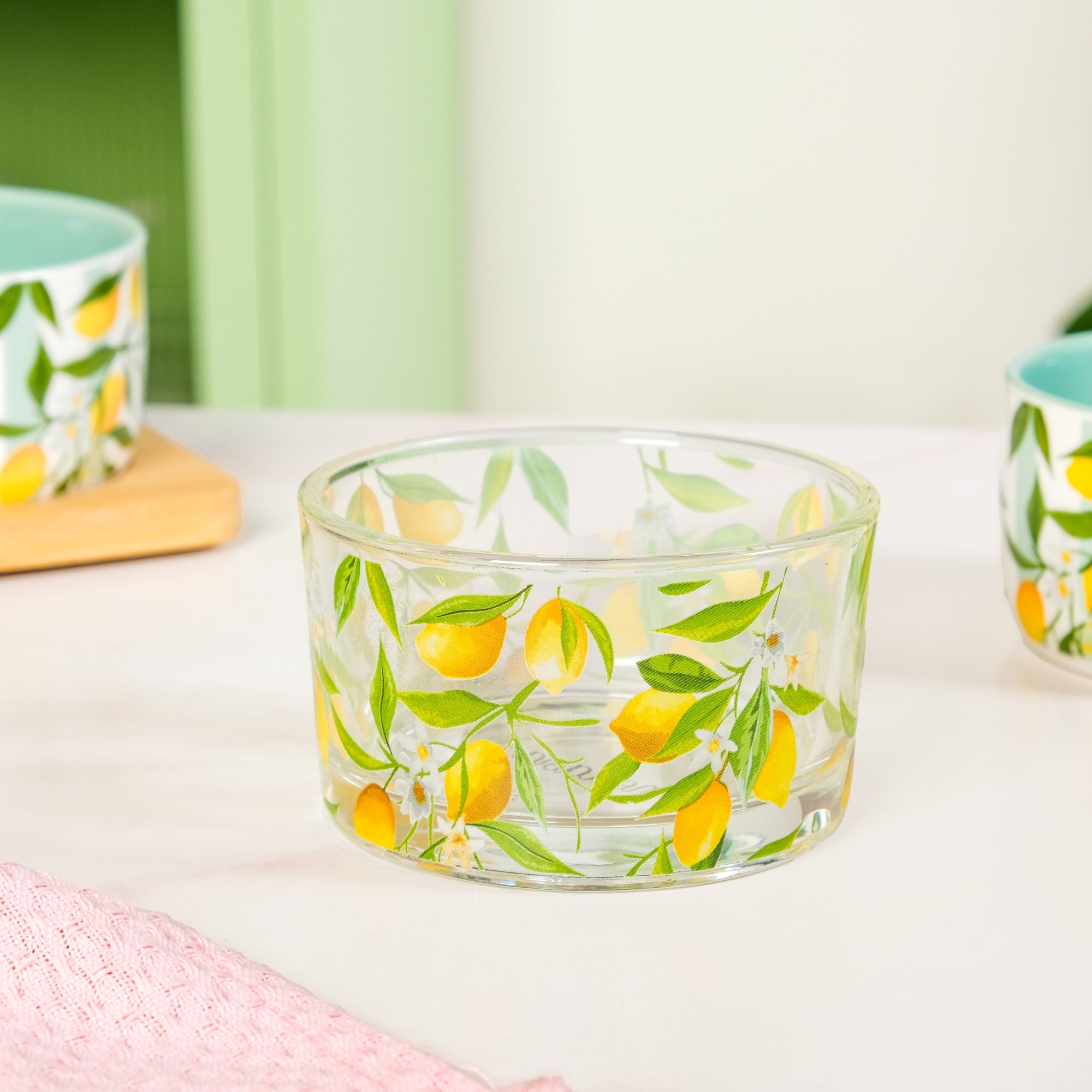 Design: Southern Italian–inspired and rooted in a relaxed coastal theme, this set includes two ceramic bowls and one glass bowl decorated with sunny yellow lemons, crisp green leaves, and playful turquoise-striped backgrounds. Designed for coastal dining and bursting with lemon and citrus freshness, the ceramic bowls feature a striking turquoise interior while the central glass bowl highlights the print beautifully. All three pieces fit snugly into the slender natural bamboo tray, creating a bright, refreshing arrangement perfect for easy entertaining.