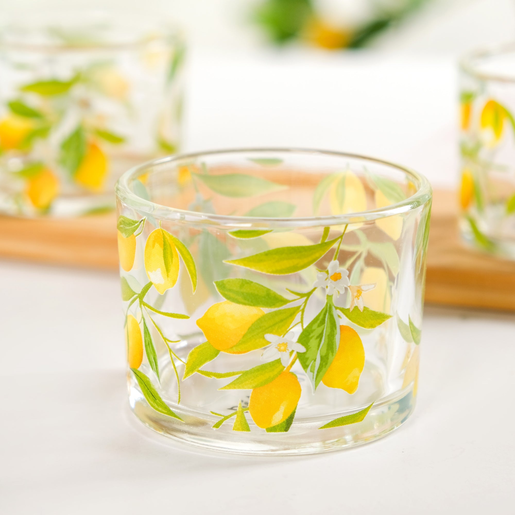 Design: This elegant serving platter set features a rectangular bamboo tray with a smooth, natural finish and a sleek handle for easy carrying. Infused with a relaxed coastal theme, it holds four round glass bowls adorned with vibrant yellow lemon prints and lush green leaves, bringing citrus freshness and lively charm to your table. The transparent glass showcases the contents beautifully, while the zesty lemon motifs add a Southern Italian refreshing touch to every dining and serving moment.