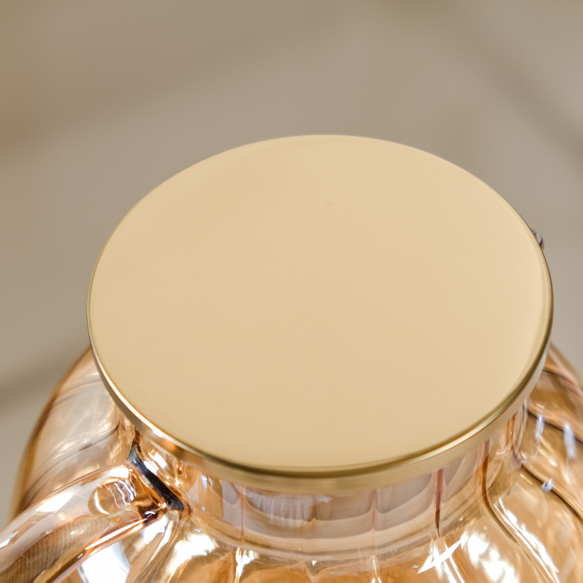 Design: The jug’s graceful, rounded body is enhanced with vertical ribbing that adds both texture and visual depth. Made from amber-tinted borosilicate glass, it exudes a vintage appeal. A sleek and shiny golden steel lid features strainer holes and a precise pouring slot, along with a silicone gasket. while the short spout and sturdy rounded handle ensure effortless pouring.