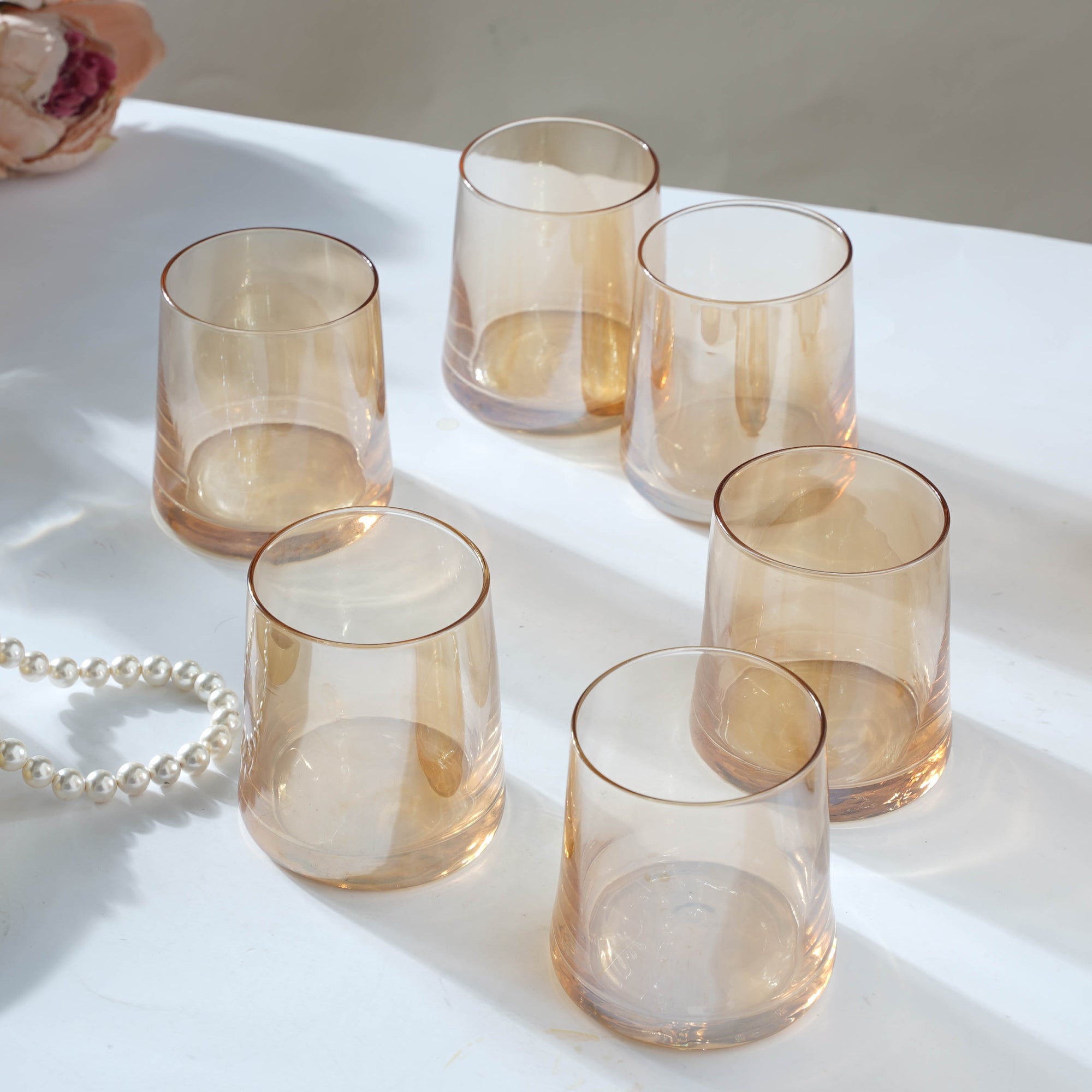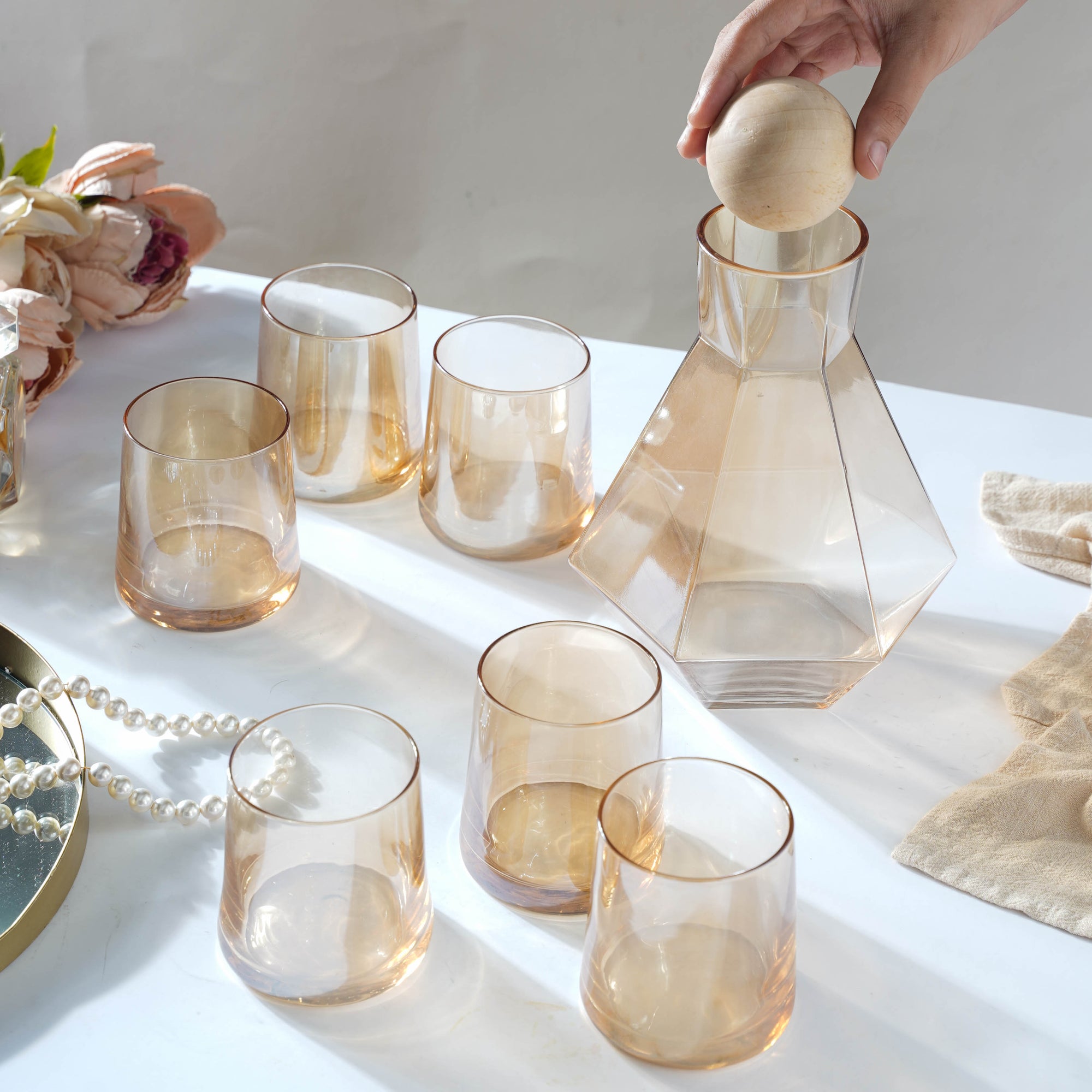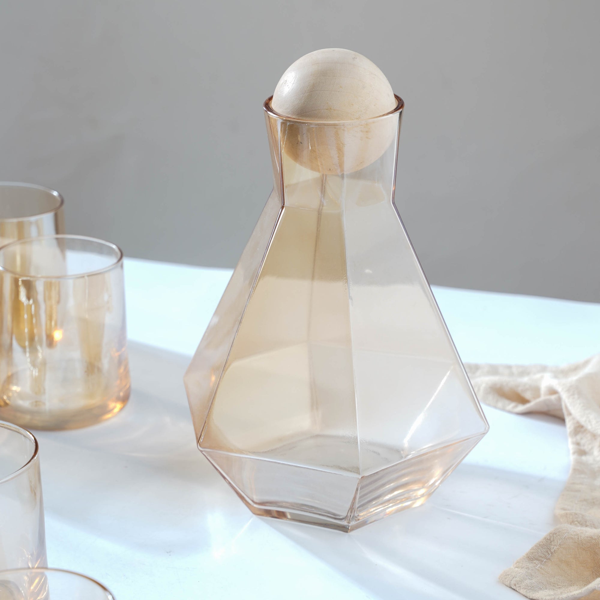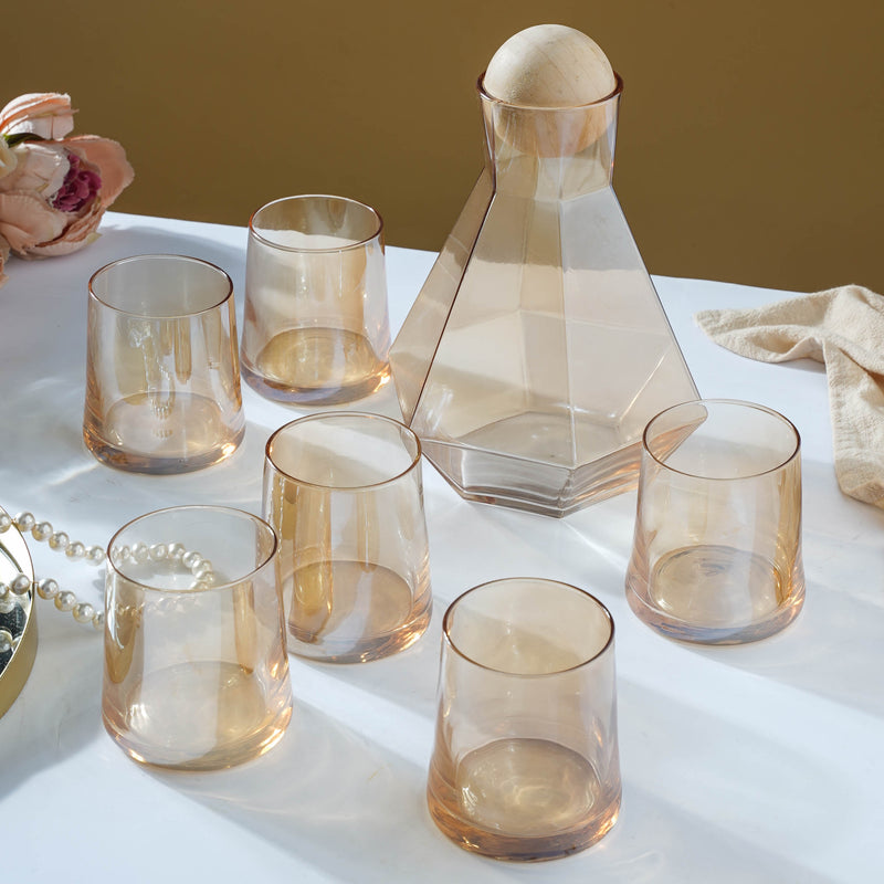 The sight of a stunning jug and matching glass cups may bring a smile to most people's faces. The amber-colored hexagonal jug and glass set give the tablescape a classic and refined touch. The jug and glass set's inner and exterior surfaces are beautifully glazed and make for a pleasing look. The drinkware set's neutral colors make it ideal for pairing with any snack plates from Nestasia's extensive collection of plates and platters.