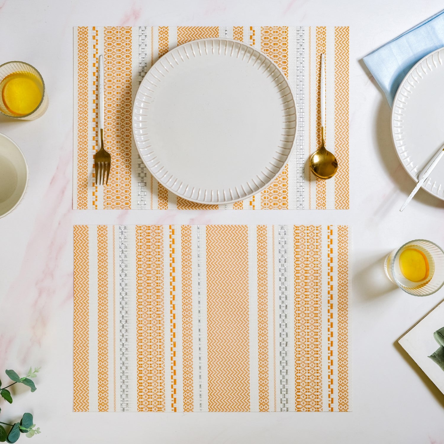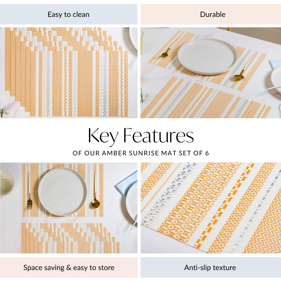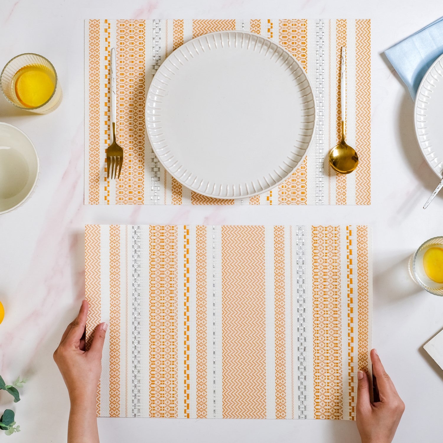Design: The set is designed with modern geometric patterns, making it the perfect addition to any contemporary dining setting. Crafted from durable PVC, these dining table placemats offer both style and practicality. Their textured surface ensures they stay in place, preventing any slipping during meals. This set includes six placemats, providing ample coverage for a larger dining area while remaining easy to store.