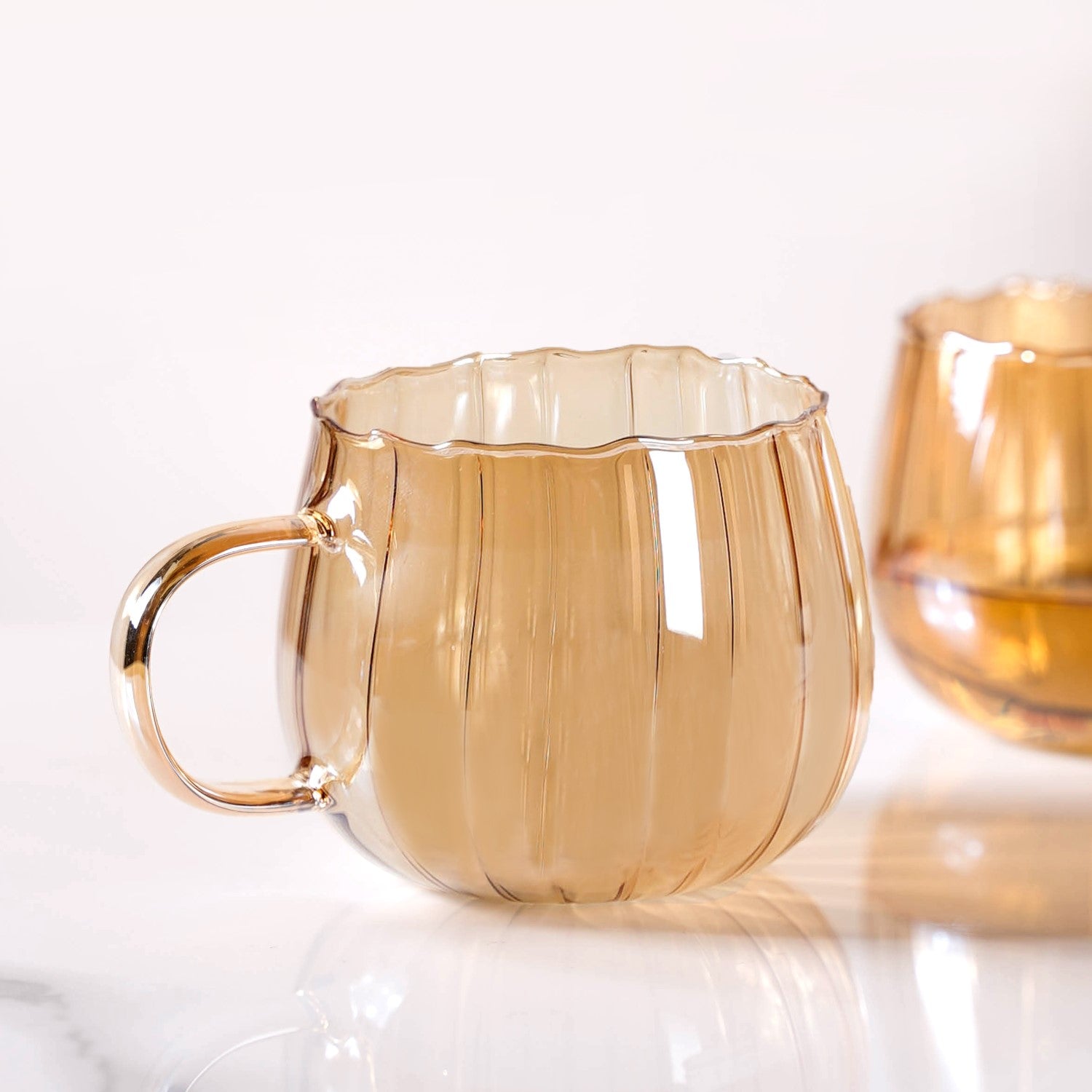 Design: The outer surface of this cup is smooth and nontextured, but has a distinctive pumpkin-like texture finely carved on the inside. With a smooth exterior and artistic pumpkin-textured interior, the cups are perfect for both formal and casual settings. Made from premium, amber-tinted translucent borosilicate glass, this cup is known for its exceptional clarity and durability. The cup features a sturdy handle that offers a firm grip and is lightweight for daily use.