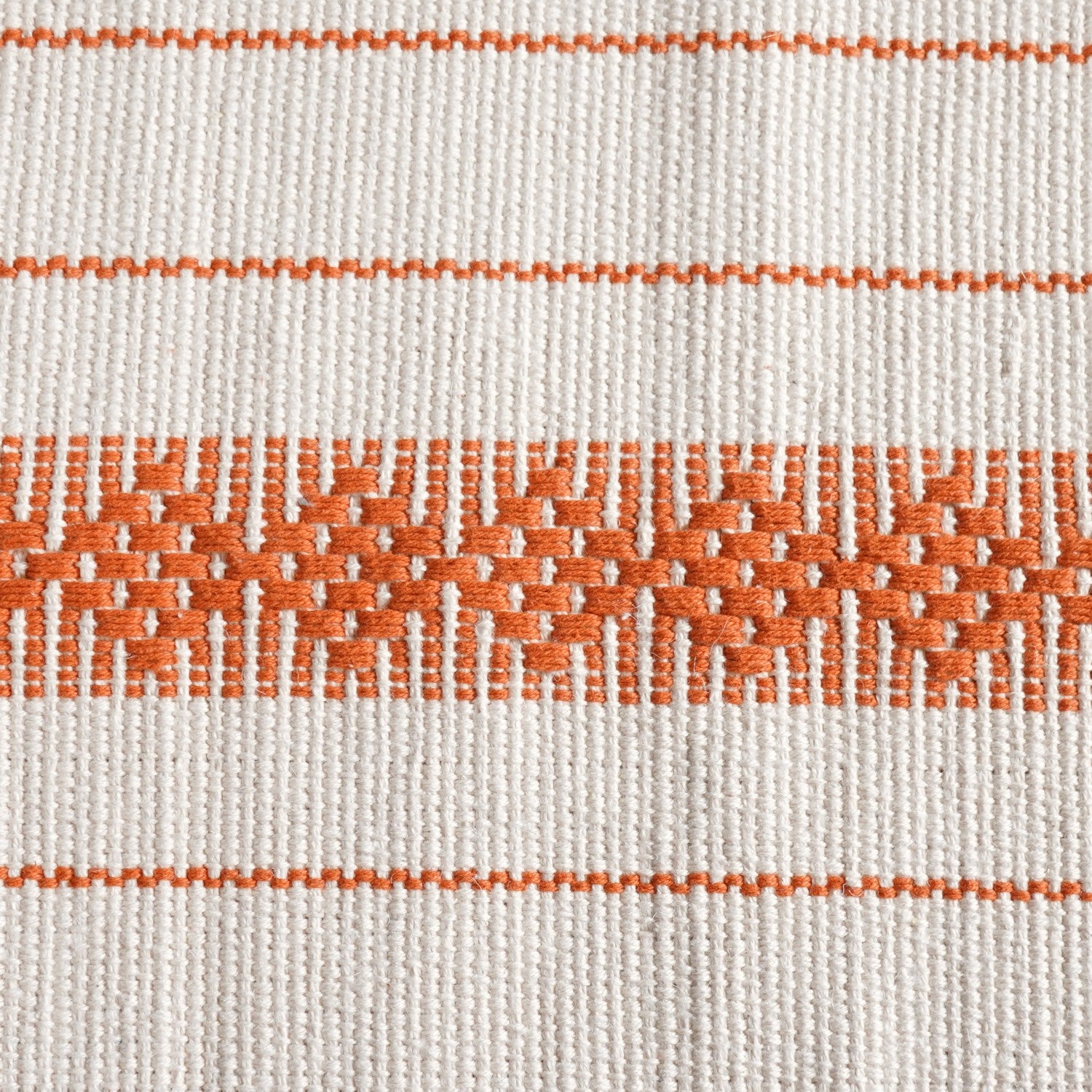 Design: Crafted with a white woven base and warm terracotta accents, this placemat features a striking central geometric panel flanked by slim parallel stripes. The textured hand-loom effect adds depth, while chunky tassels on each corner form a cohesive look. Its balanced colour play and intricate weave make it a standout addition to both casual and festive table settings.