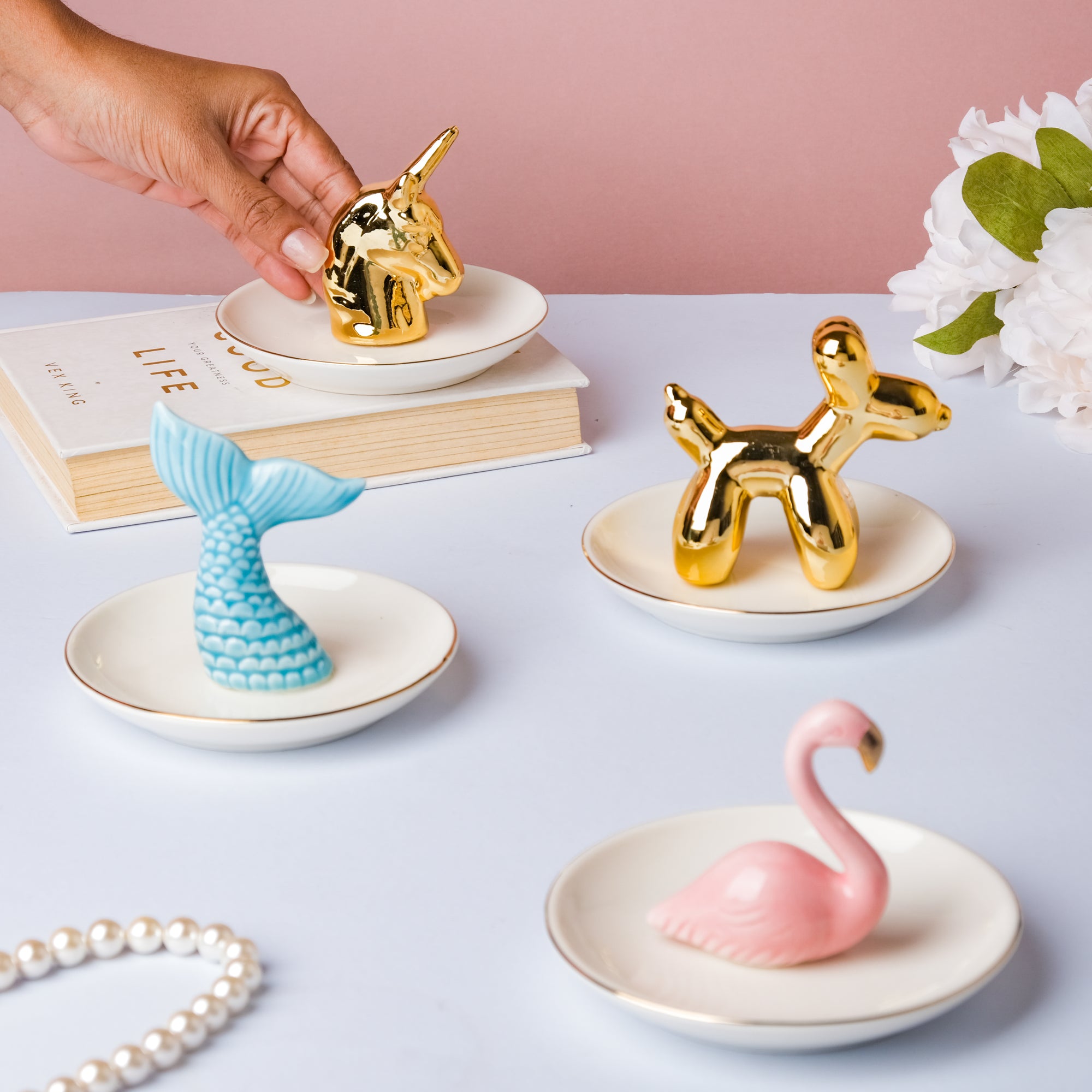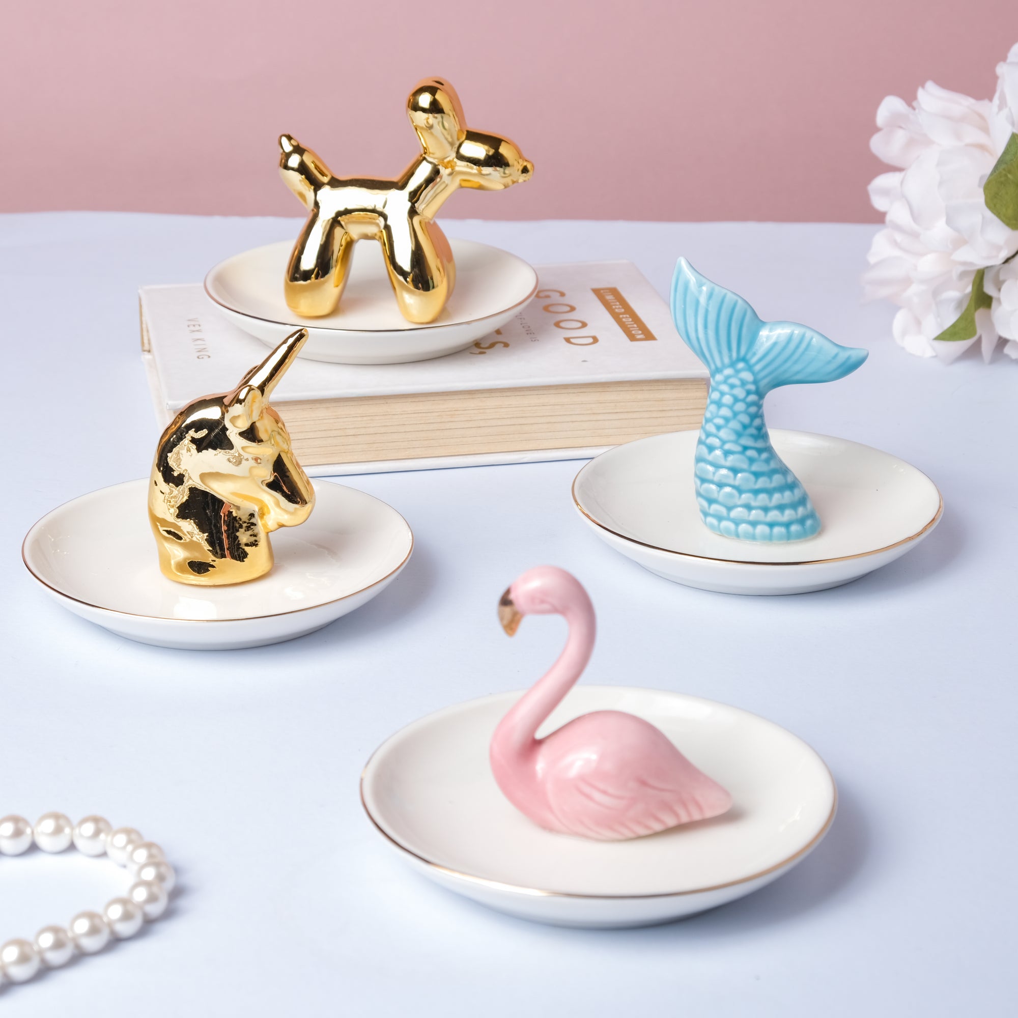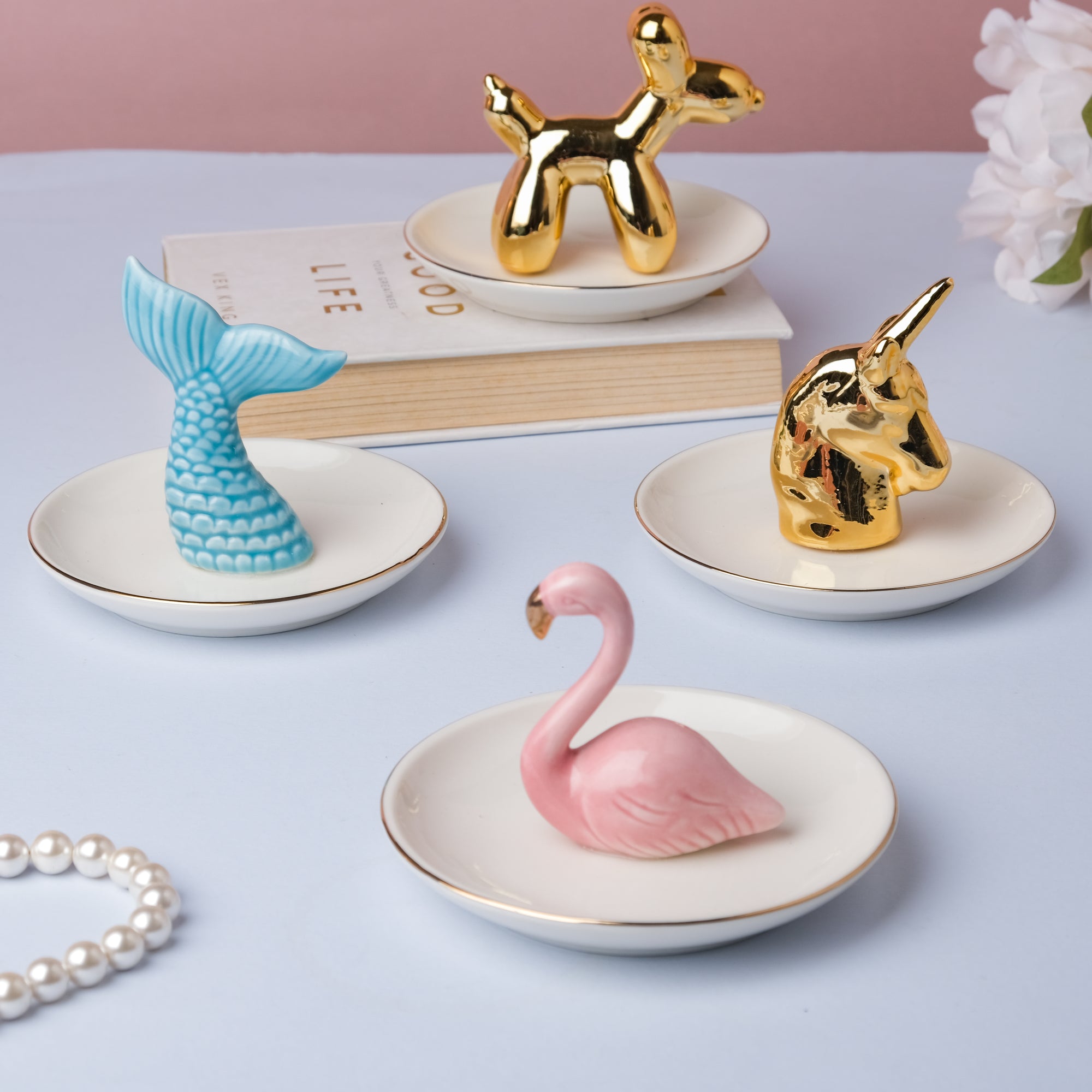 The animal-themed trinket tray may also be utilized as a decorative item on a coffee table, dresser, or study table. The flamingo trinket tray is pink, gold, and white in color, while the fishtail décor piece is white, gold, and blue. White and gold are the color combinations of the amusing balloon dog and unicorn trinket dish. The round ceramic trinket dish has a gorgeous gold ring around the edge. Each design is unique and has been precisely carved with a clear gloss finish on the surface. Place the dish by the front door of the house to place coins and keys. Jewelry, pins, and rubber bands may all be stored on the tray. The raised rim of the plate prevents any of its contents from falling off the dish. Nestip: Pair the variants together for a perfect décor setup. Size: Dog- 8.5cm H x 13.5cm diameter Unicorn- 7.5cm H x 13.5cm diameter Flamingo- 9cm H x 13.5cm diameter Fishtail- 8cm H x 13.5cm diameter Color: White and gold; white, pink, and gold; blue, pink, and gold Material: Ceramic Products included: 1 trinket dish Style: Dog- JNS24A33 Unicorn- JNS24A34 Flamingo- JNS24A35 Fishtail- JNS24A36