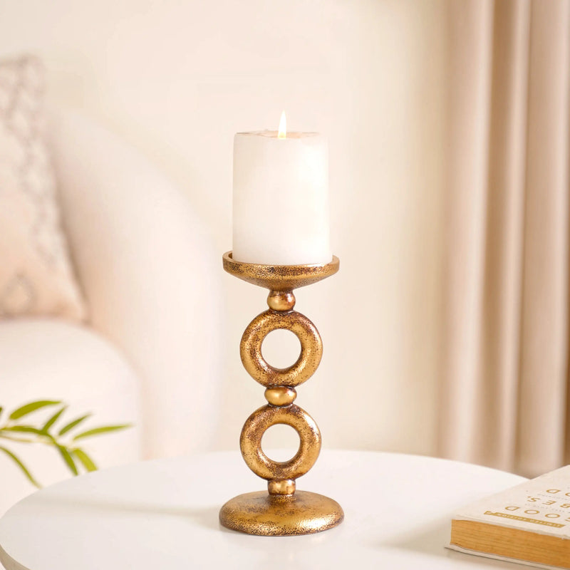 Elevate your surroundings with our enchanting rustic golden candle stand. Its captivating design, adorned with rings, forms a visually striking masterpiece. The antique allure of the rustic golden hue infuses your space with a unique blend of warmth & character. The candle stand has timeless elegance, complementing diverse interior styles. As your candles find their place upon this holder, their dancing flames weave an enchanting aura, casting a captivating, cozy glow. Whether adorning a dining table, gracing a mantel, or enhancing any room, our candle stand adds an exquisite touch of rustic opulence to the space.