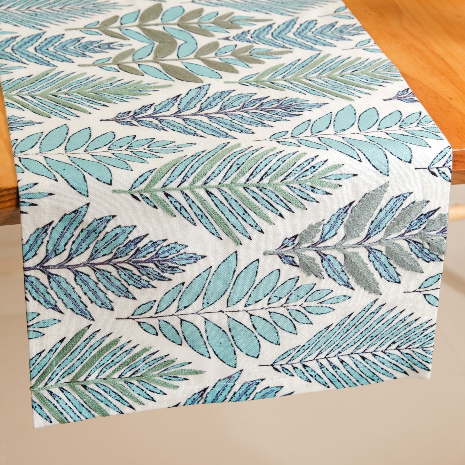 Aqua Fern Embroidered Cotton Table Runner 202x33cm
