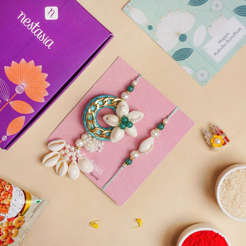 Aqua Shell Lumba Rakhi Set For Bhabhi And Brother