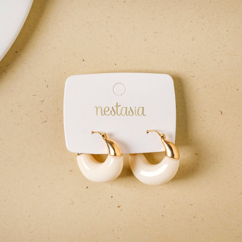 These huggies are designed to make a statement in the most understated way! The sleek, curved arc hugs your earlobe gently, creating a simple yet eye-catching silhouette. Featuring a polished gold clasp and a smooth resin body in classic white, these earrings have a clean, timeless look that pairs beautifully with any outfit. The crisp white finish adds a fresh and sophisticated touch, making them a go-to accessory for both everyday wear and special occasions.