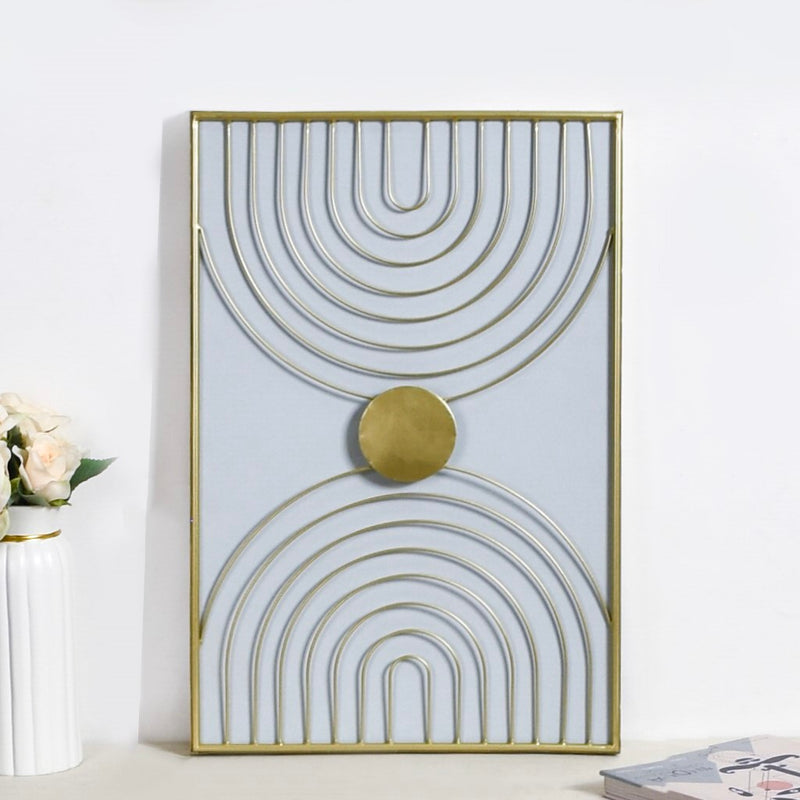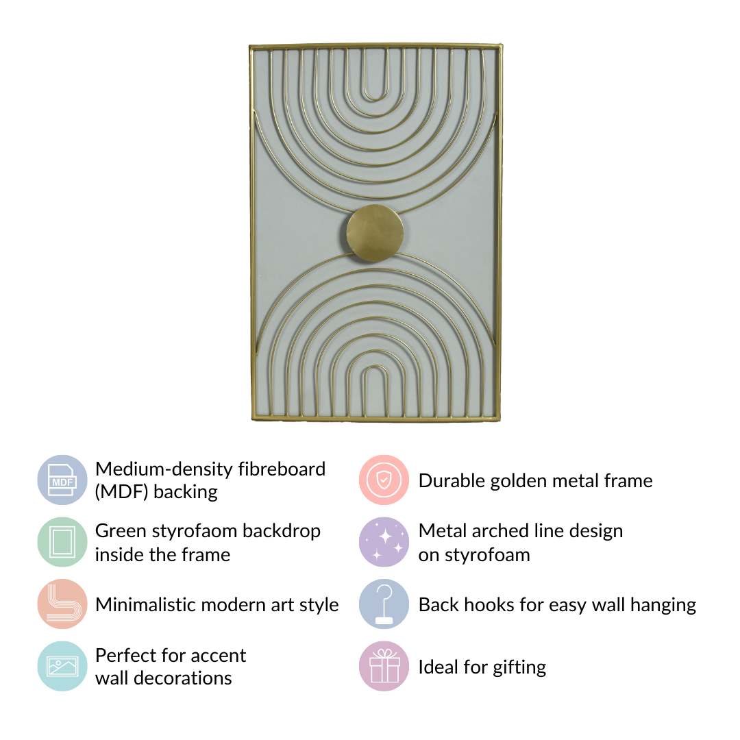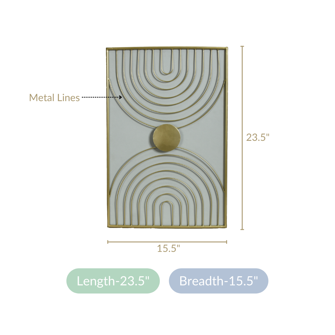 Crafted painstakingly from premium quality metal, the wall art features arched lines that resemble the bands of two rainbows passing through a centrally located sun. The restrained colour palette and the use of clean lines and geometric shapes embody the spirit of modern minimalism.