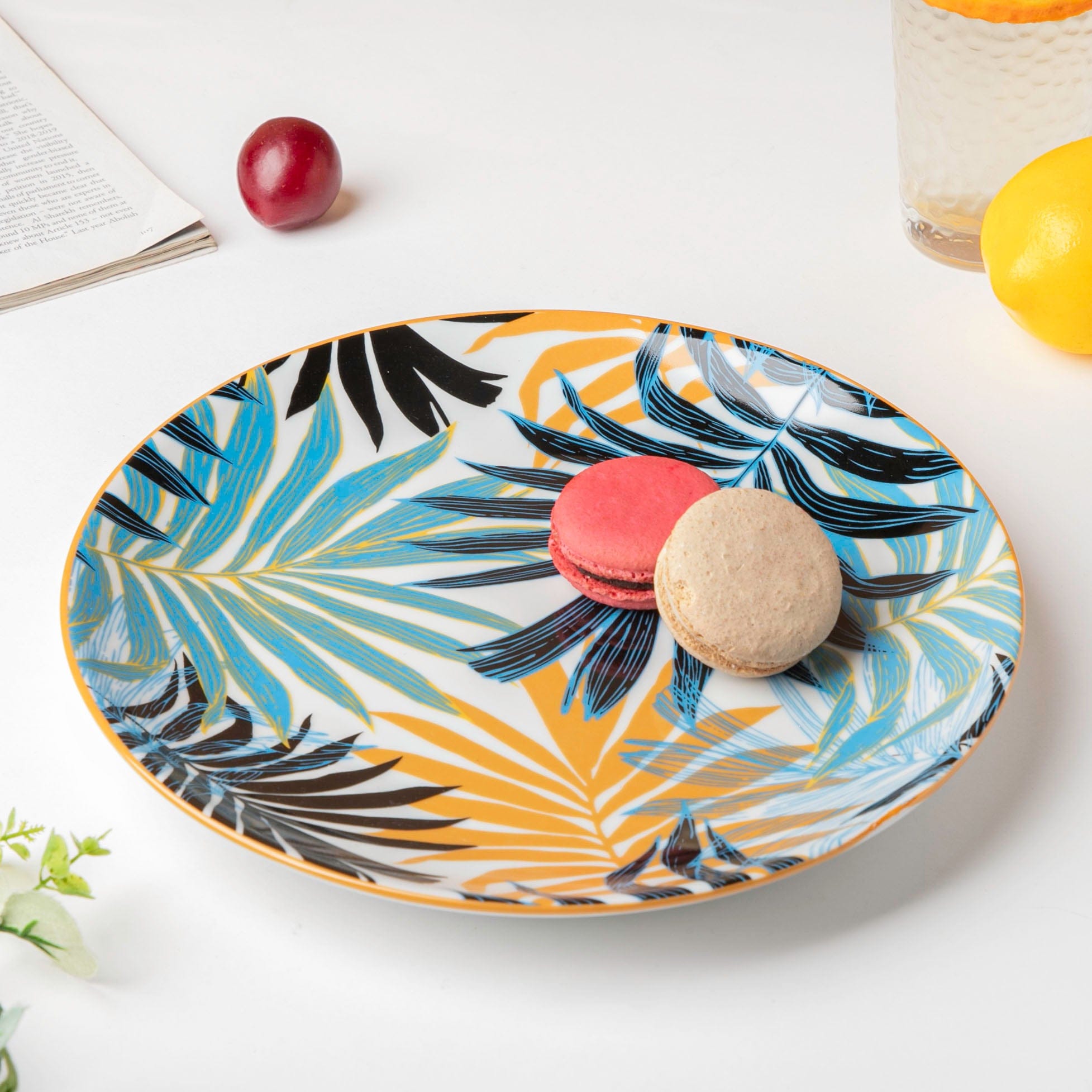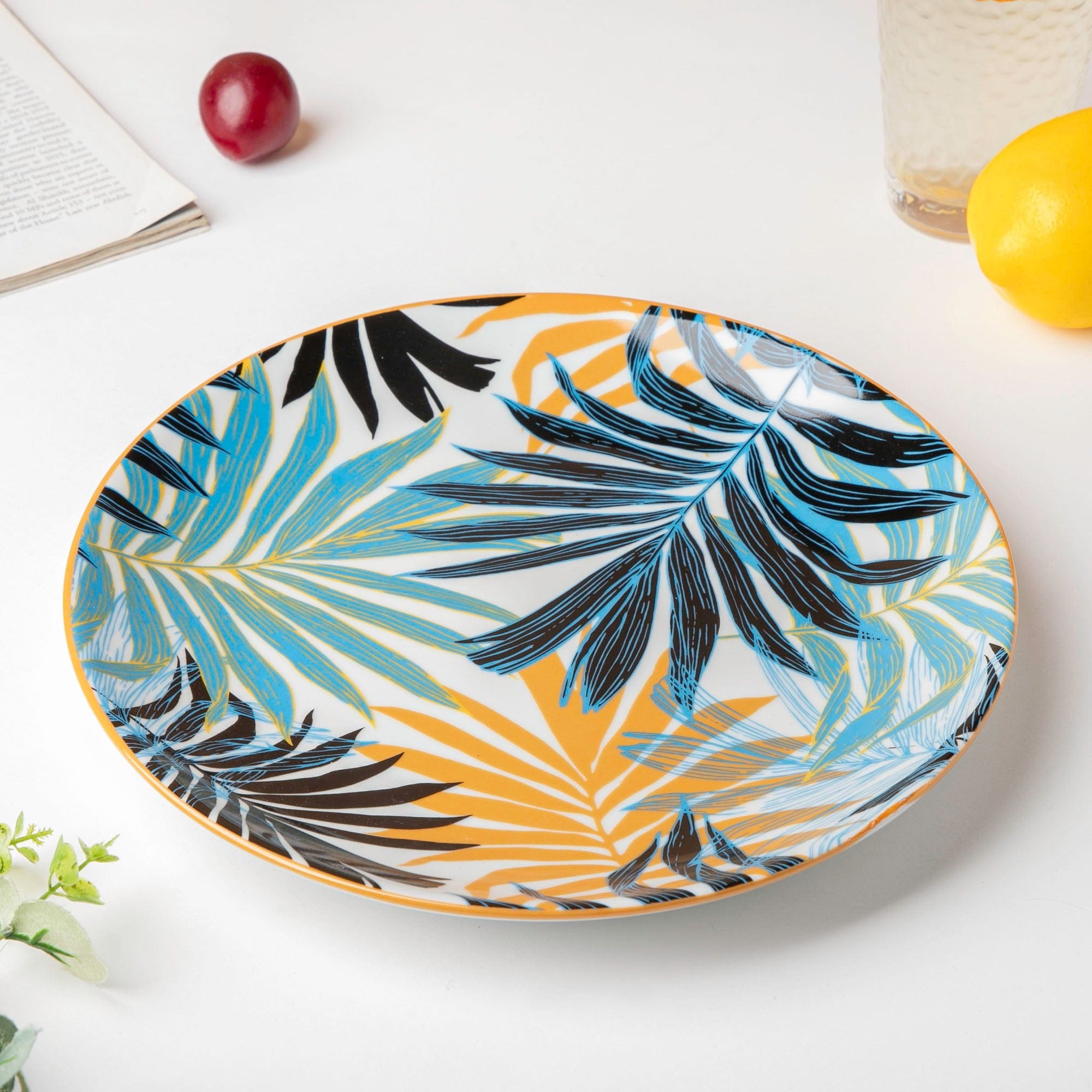 Transport straightaway to a tropical paradise with leaves printed on the round ceramic dinner plate. With a semi-matte finish, the dinner plate is a fine example of decal artwork and precision. Perfect for luncheons or outdoor dinner parties, the plate of sturdy ceramic construction is crack and chip-resistant. Just the addition of the ceramic dinner plate to the table will instantly brighten up the spread.