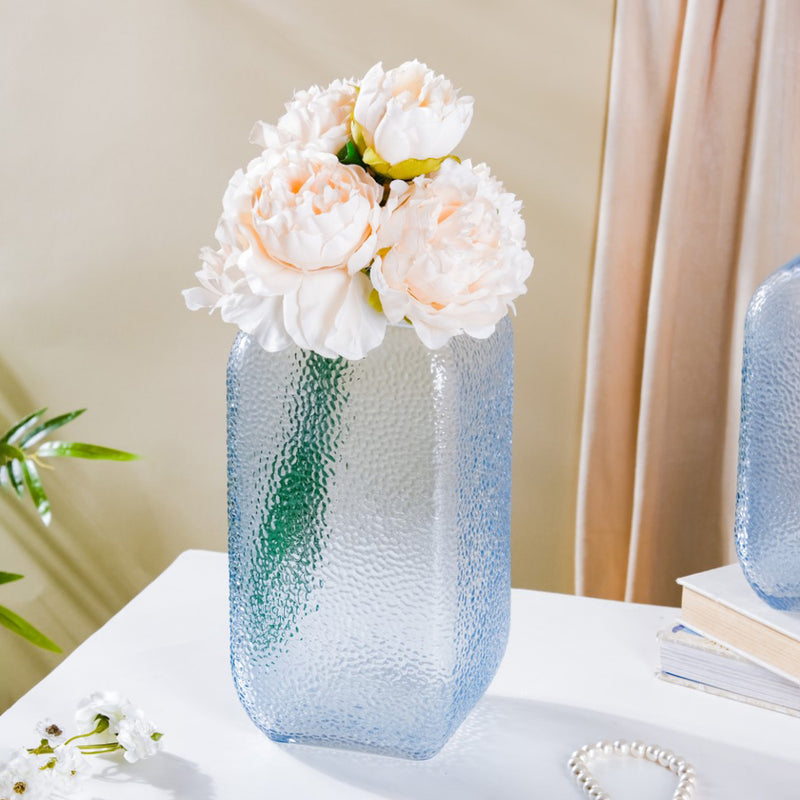 Glass vases are the most versatile room decor element. Vases in the art deco style convey a timeless glitzy grandeur into any room of your house. The pebble design hand-blown glass vase is the perfect decor for every housewarming, anniversary, and festive occasion. Nestip: You can use the vase to hold a flower bouquet. Size: 9cm L x 9cm B x 25cm H Color: Blue, translucent Material: Glass Products included: 1 vase Style: G03M21G06