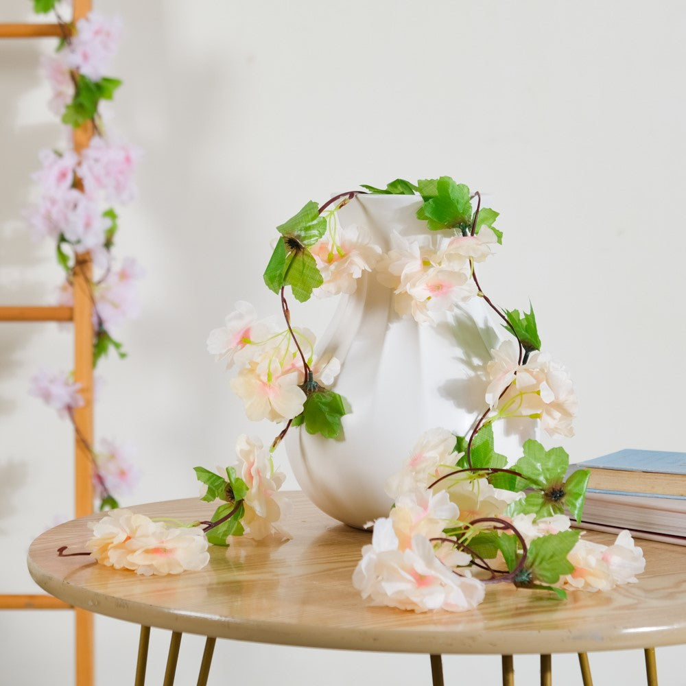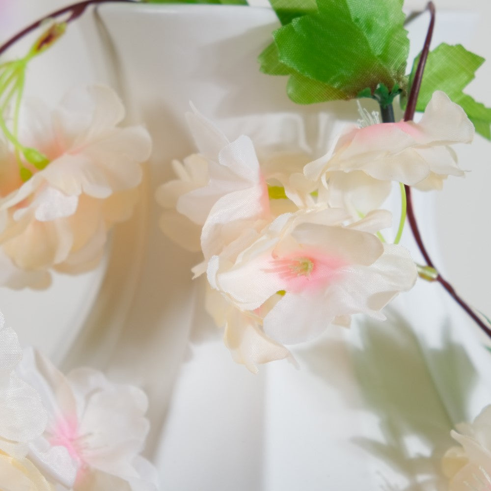 Those who enjoy having greenery within their home will benefit from the artificial flower vine that remains fresh and vibrant throughout the year. A special table setting can be made for a birthday party, anniversary party, housewarming party, or even just a dinner party with friends by combining the artificial sakura floral and leaf vine with artificial or real flower stems. The vibrant blossoms contrast with the vine's green leaves and create a beautiful decor accent.