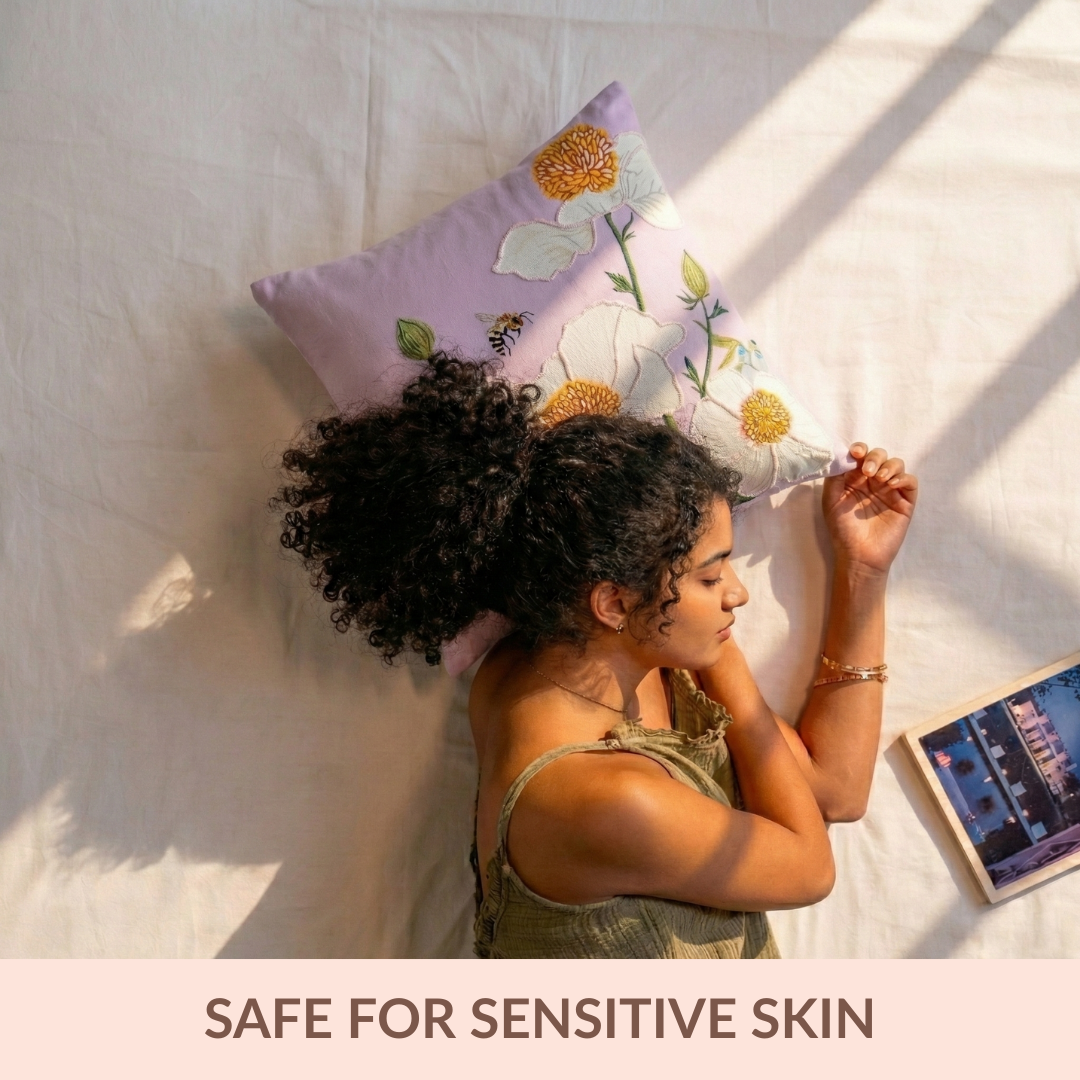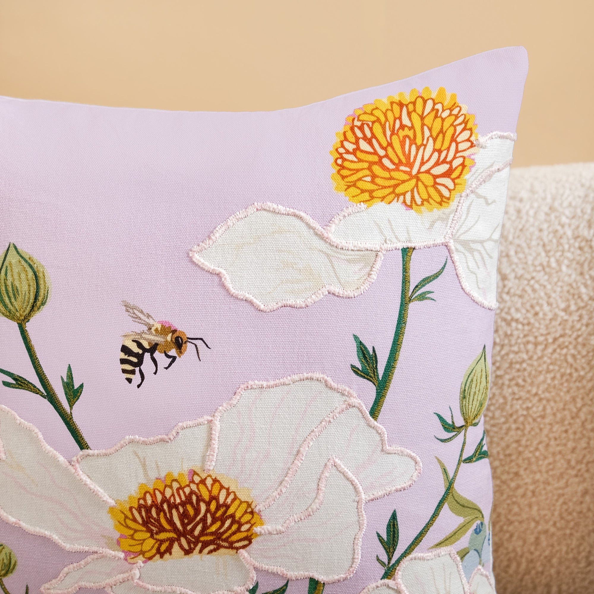Design: Set against a calming lilac base, this printed cushion cover showcases a delicate floral garden on the bottom right, complete with a tiny bee hovering over the flowers. Plush highlight embroidery adds texture and depth, making each flower and the bee come alive, while the muted palette keeps the overall look soothing.