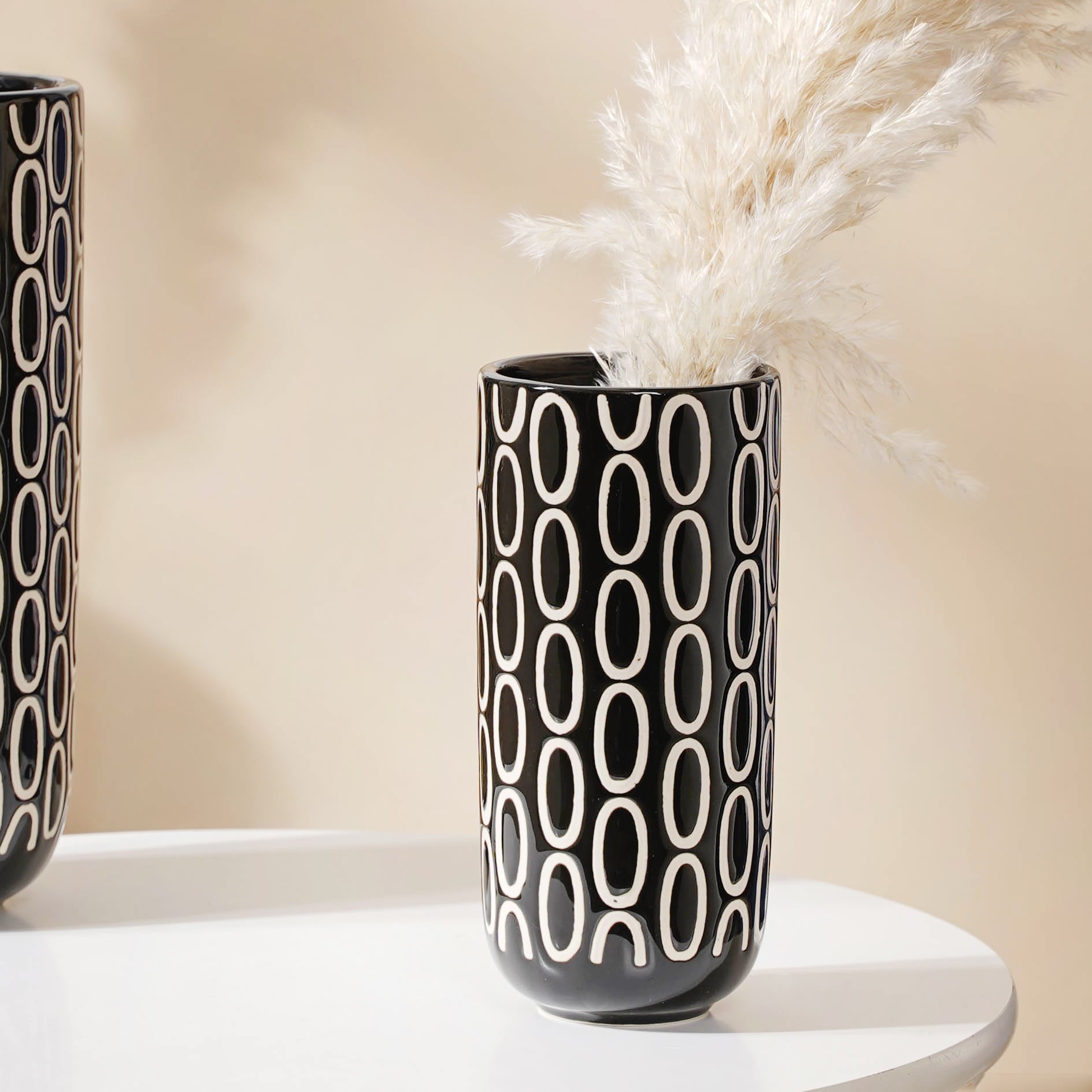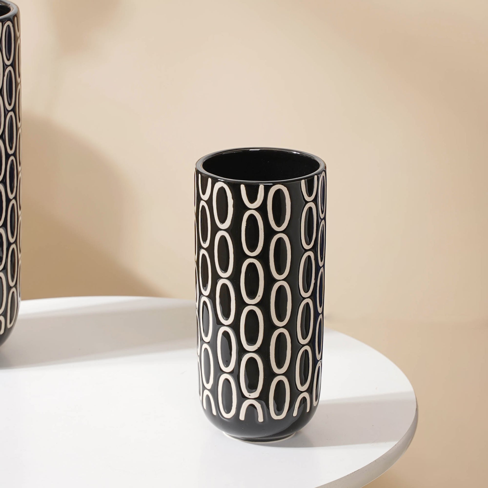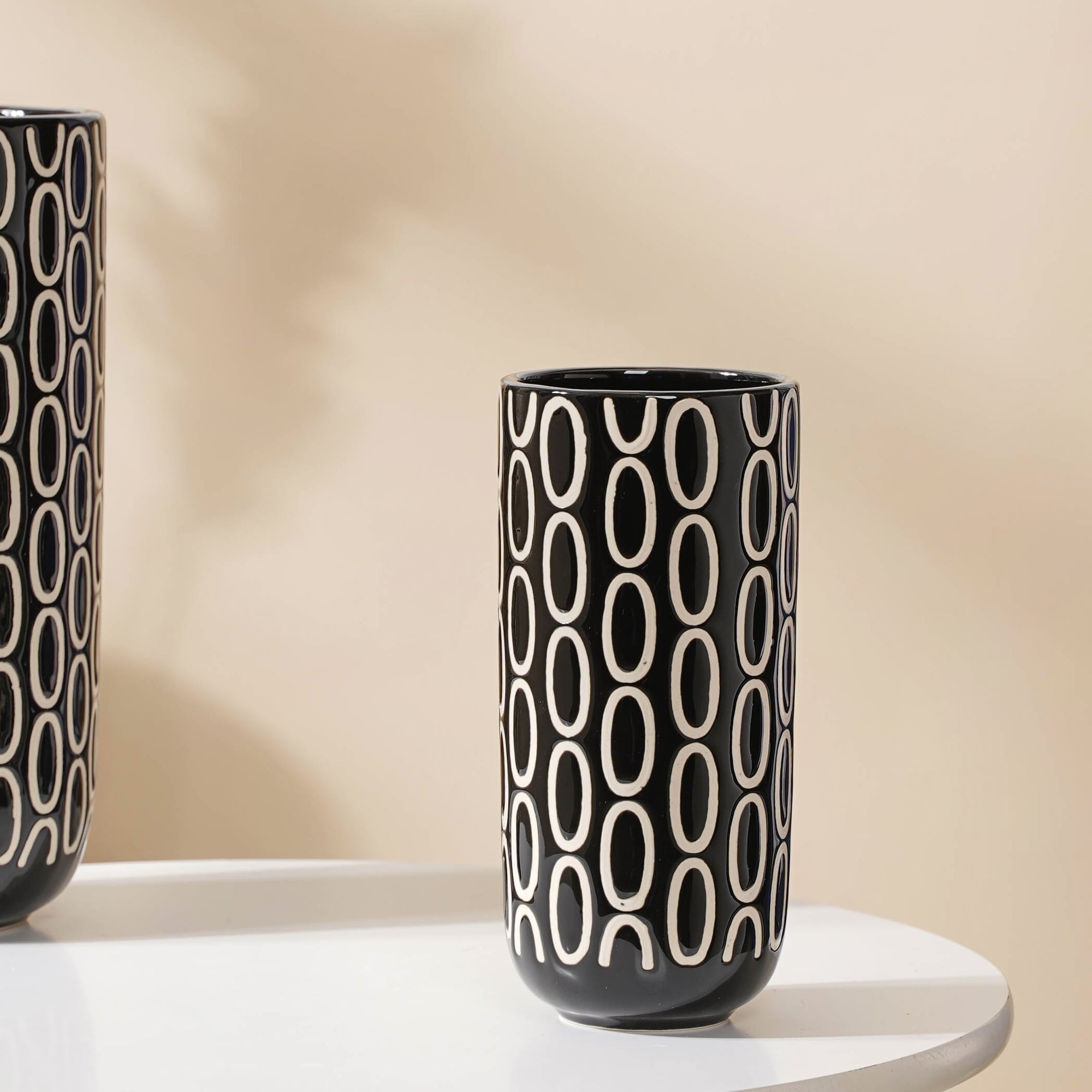 The pot is structured like one tumbler, having white-lined spheres filling the entire black body. It's fashioned like a short drinking glass, with plenty of room for flower petals. In any stylish setting, the vase is a stunning and eloquent compliment.
