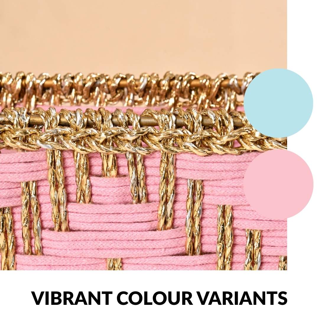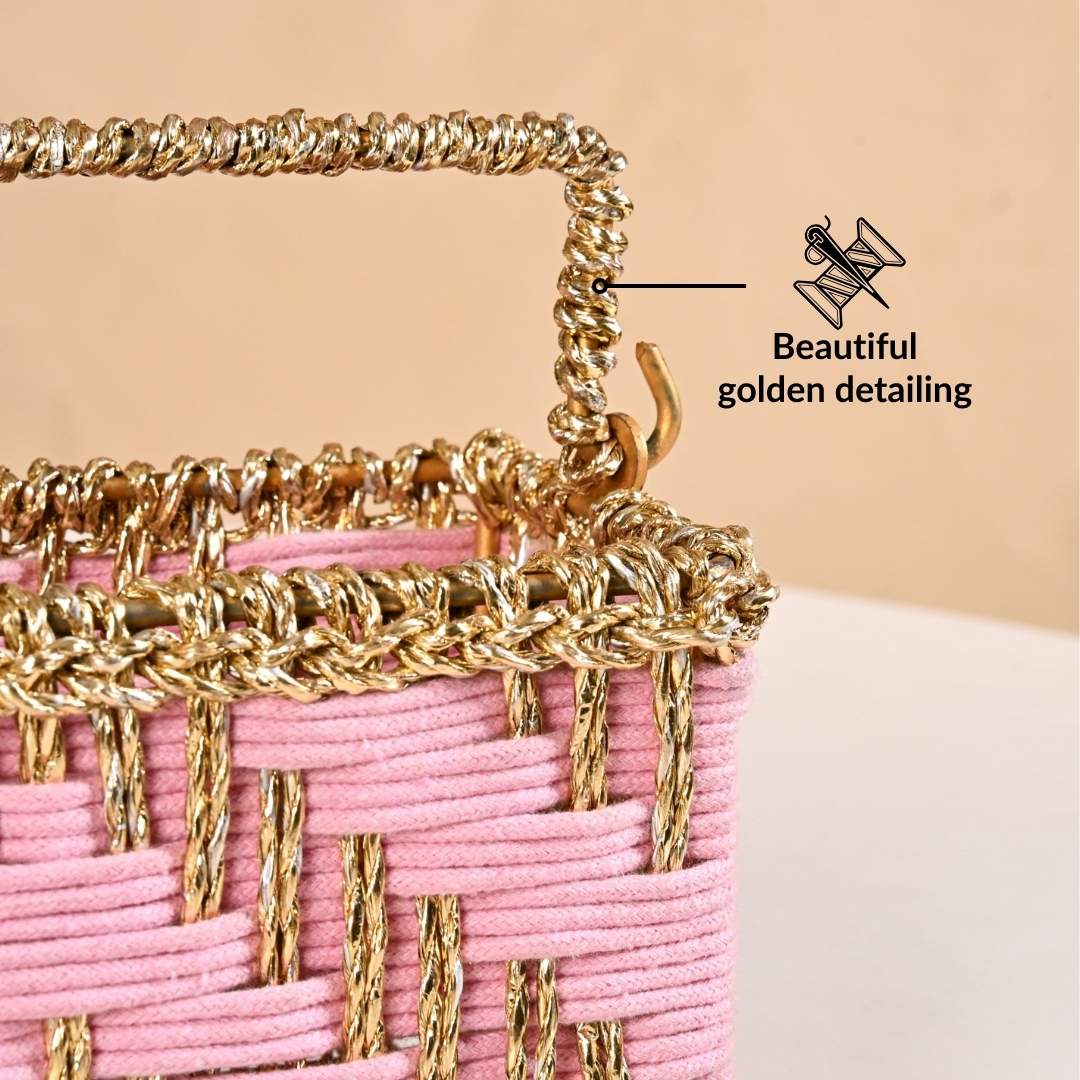 Design: This basket is handwoven in solid pink cotton yarn with metallic gold thread accents. It has a rectangular shape with a reinforced rim, an open-weave texture, and a single attached handle.