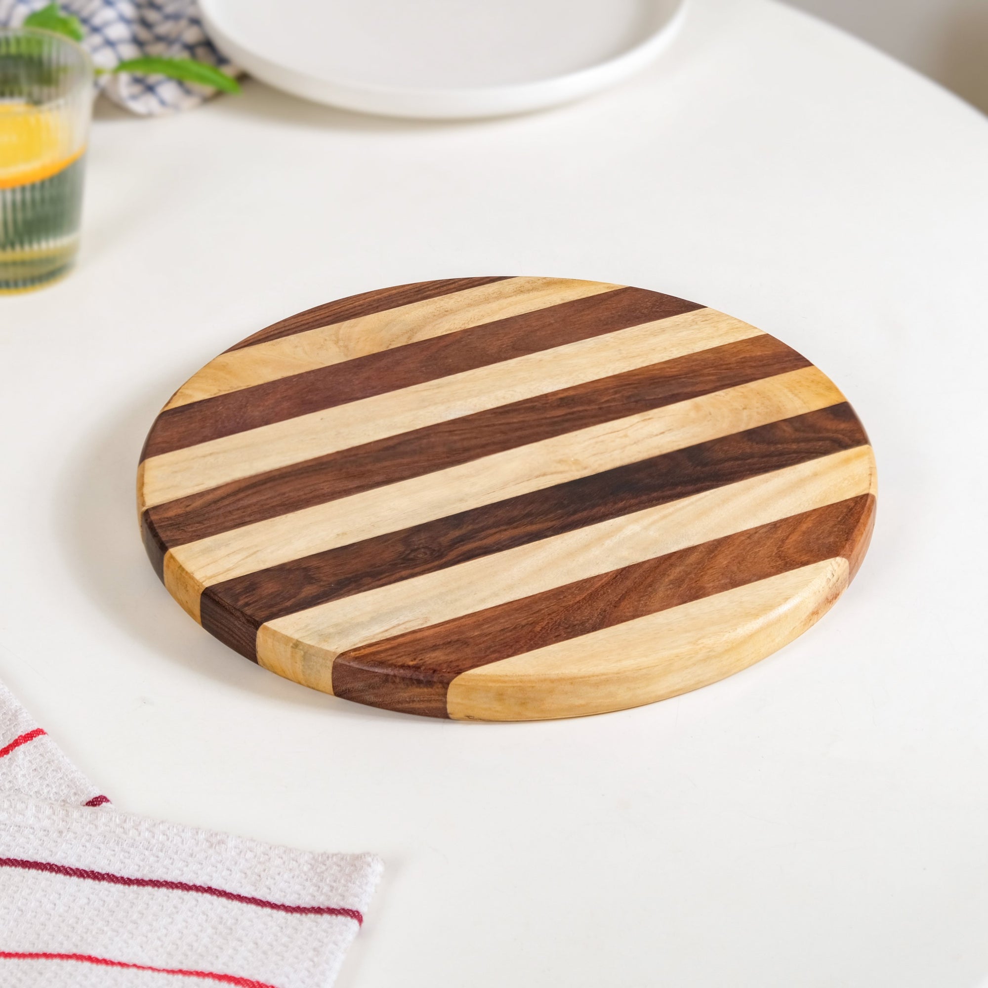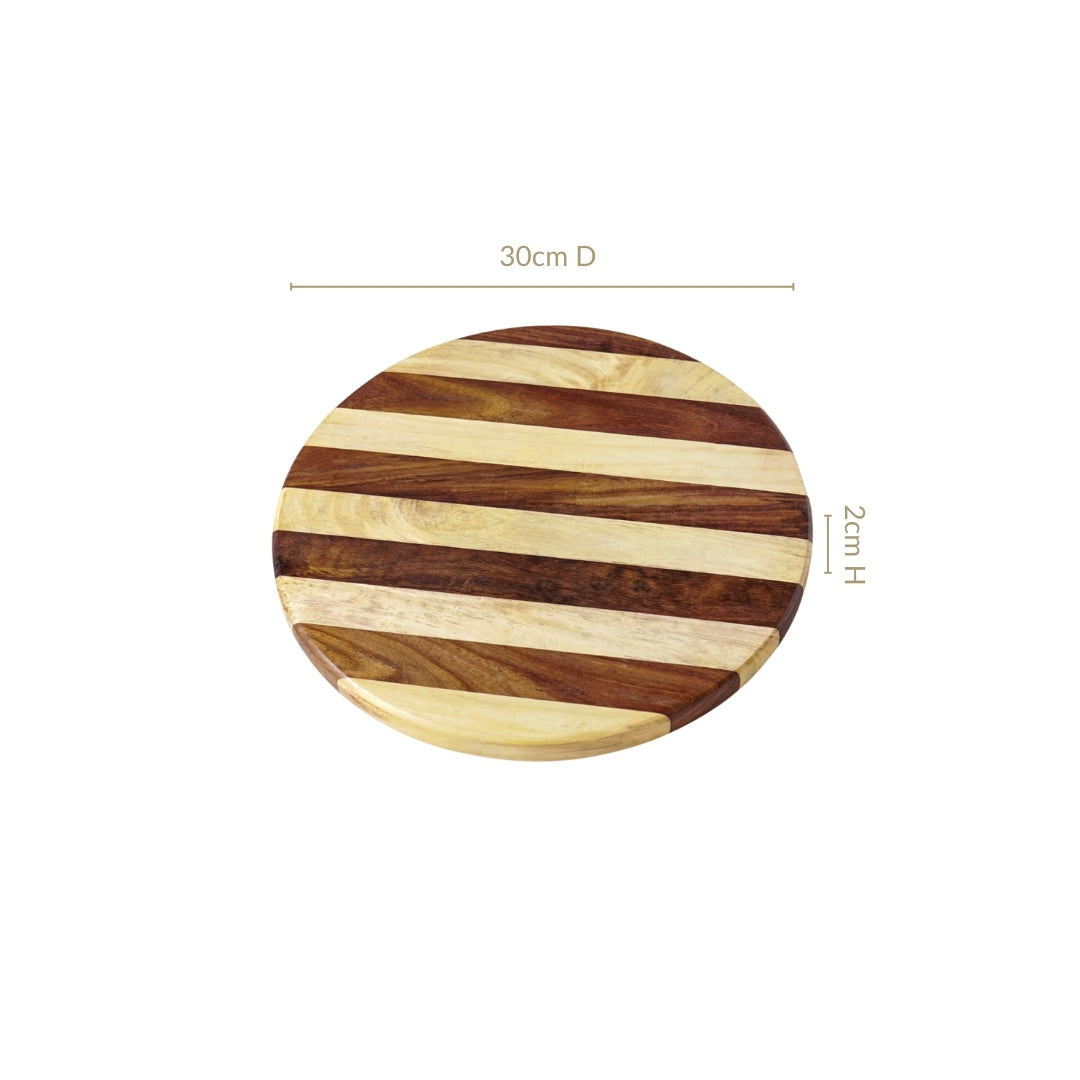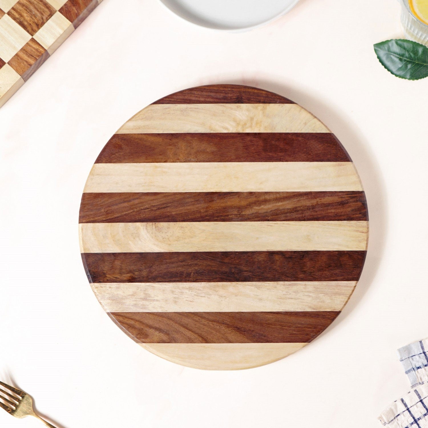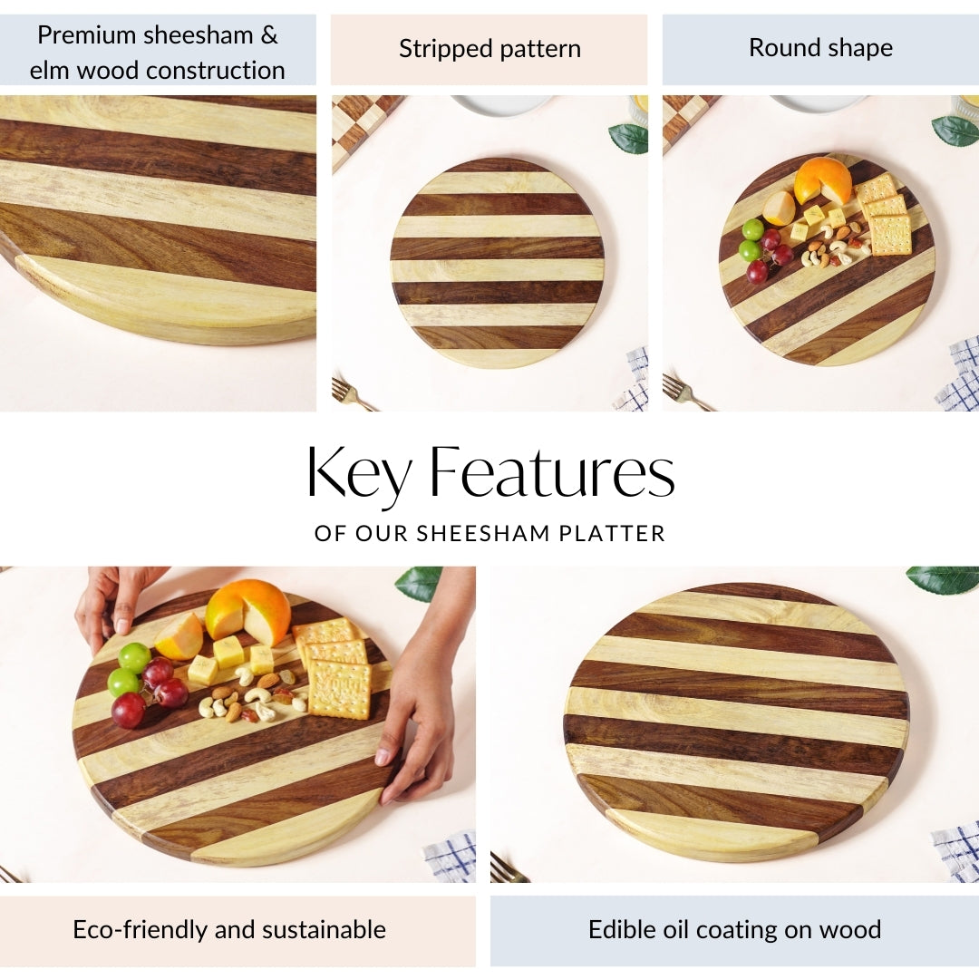 Design: Perfect as serving platters for appetisers, desserts, or mains, it doubles up as a refined cheese platter for social gatherings. Designed in a classic round shape, the platter features alternating strips of dark and light grains, creating a bold striped effect. The smooth, polished surface enhances its elegance, while the warm, earthy tones of Sheesham bring rustic sophistication. A striking yet practical piece, it complements modern and traditional dining setups alike.