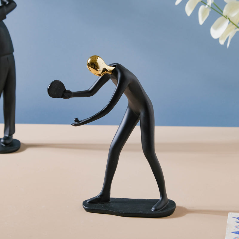 To celebrate the glory and lineage of every kind of sport, the sleek black and gold showpiece features a figurine playing table tennis. The handcrafted black resin decor object makes a unique and eye-catching decorative piece. The strong body posture and tall build of the athlete provide a modernistic element to the home. The body language and fine composition of the resin showpiece will surely be the highlight of the room.