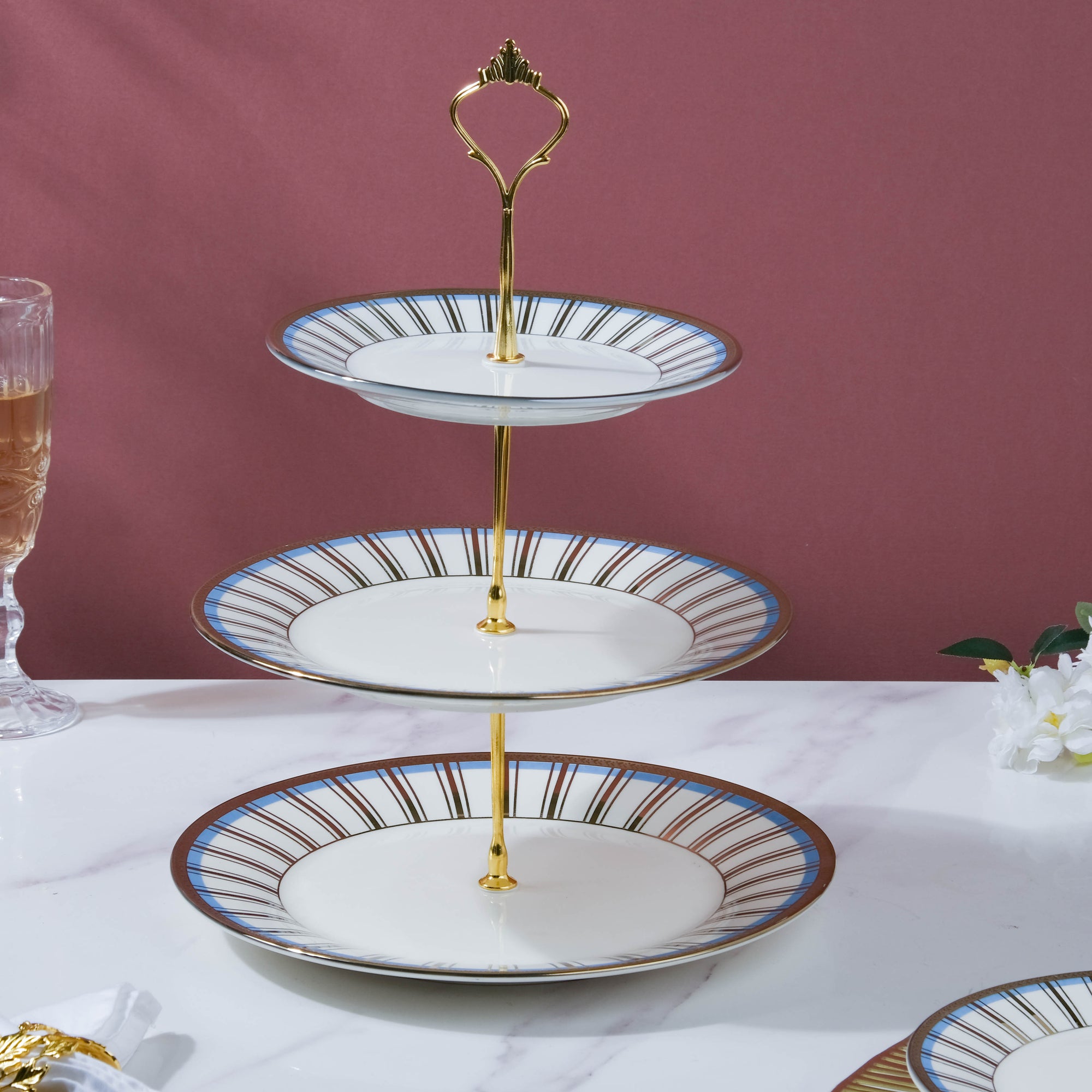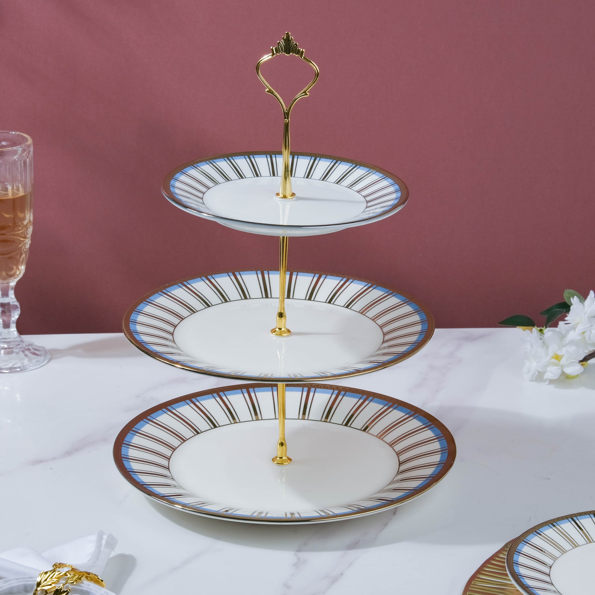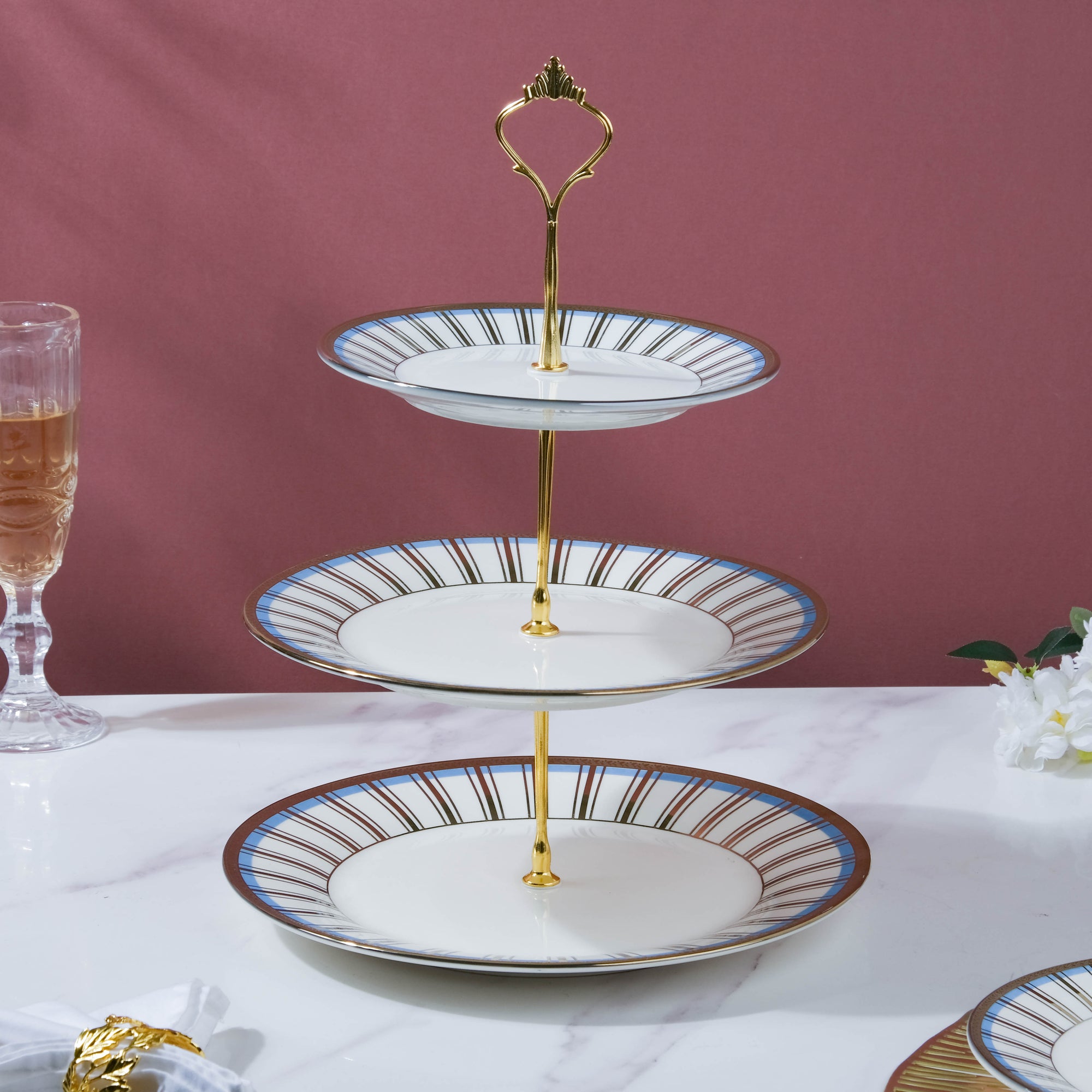 Display delectable desserts and snacks with ease in the 3-tier display stand. The stand may be placed as the table centerpiece to display homecooked delicacies or fresh fruits. The 3 ceramic plates feature gold detailing that elevates the table setting while ensuring that all the dishes can be presented with utmost creativity. The stand makes a serving look aesthetic and organised that is easy to pick and place. Nestip: Use the plates for placing tea lights for a festive decor. Size: 13.7” H (Plate 1 - 10.6” D x 1” H, Plate 2 - 9” D x 1” H, Plate 3 - 7” D x 0.7” H) [35cm H (Plate 1: 27cm D x H-3cm H) (Plate 2: 23cm D x 3cm H) (Plate 3 H-2cm H x 18cm D)] Color: White, blue and gold Material: Ceramic Products included: 1 metal stand, 3 plates Style: CFDH83C23