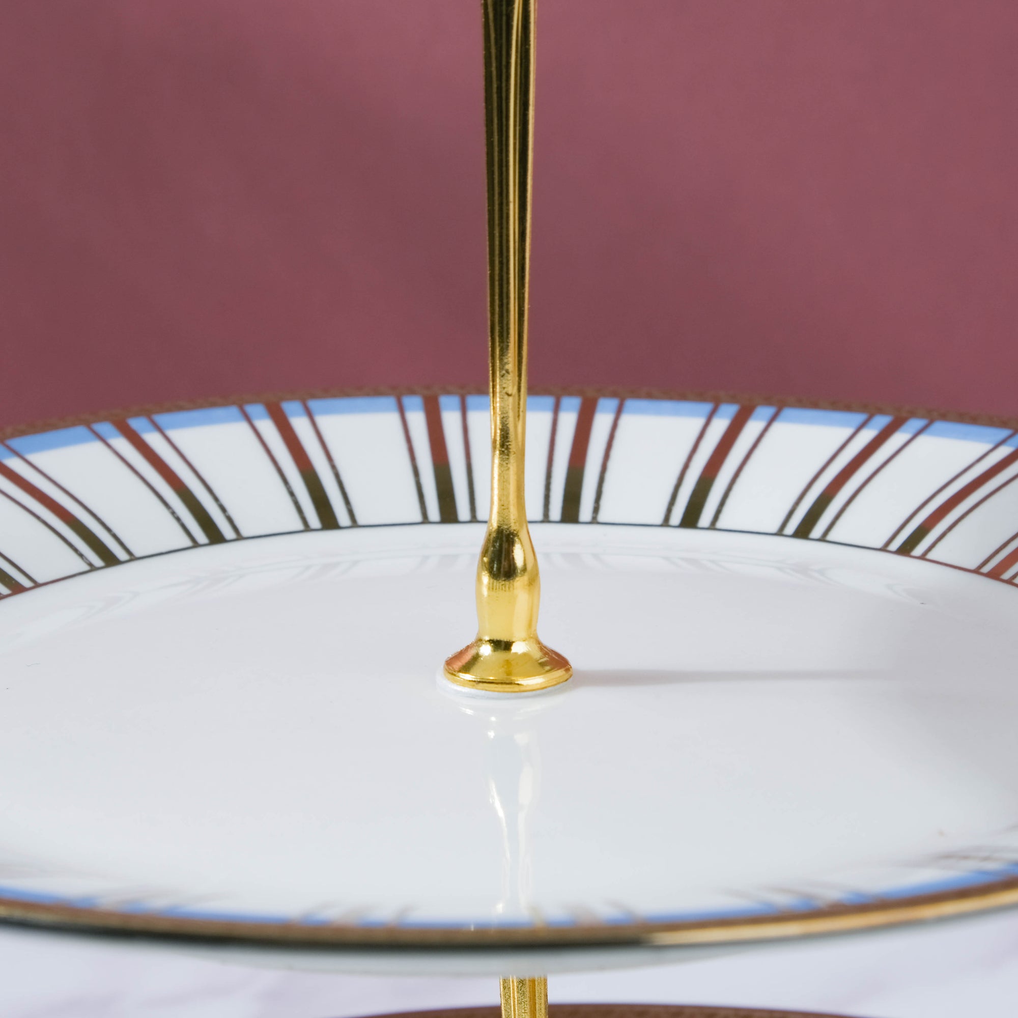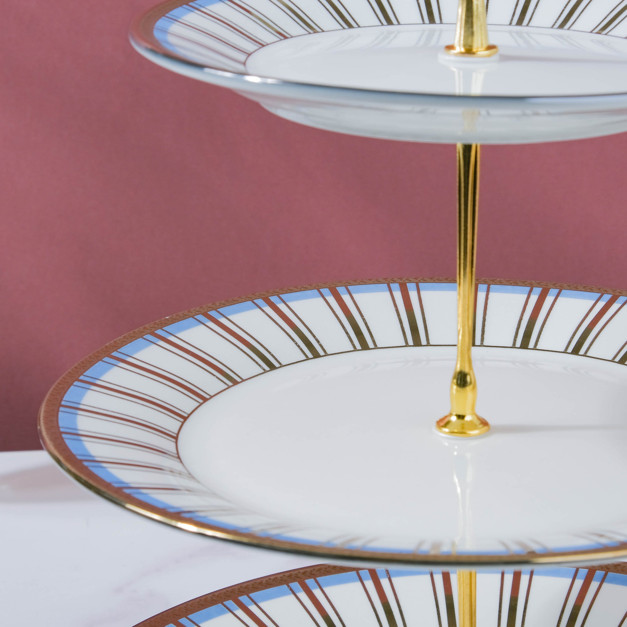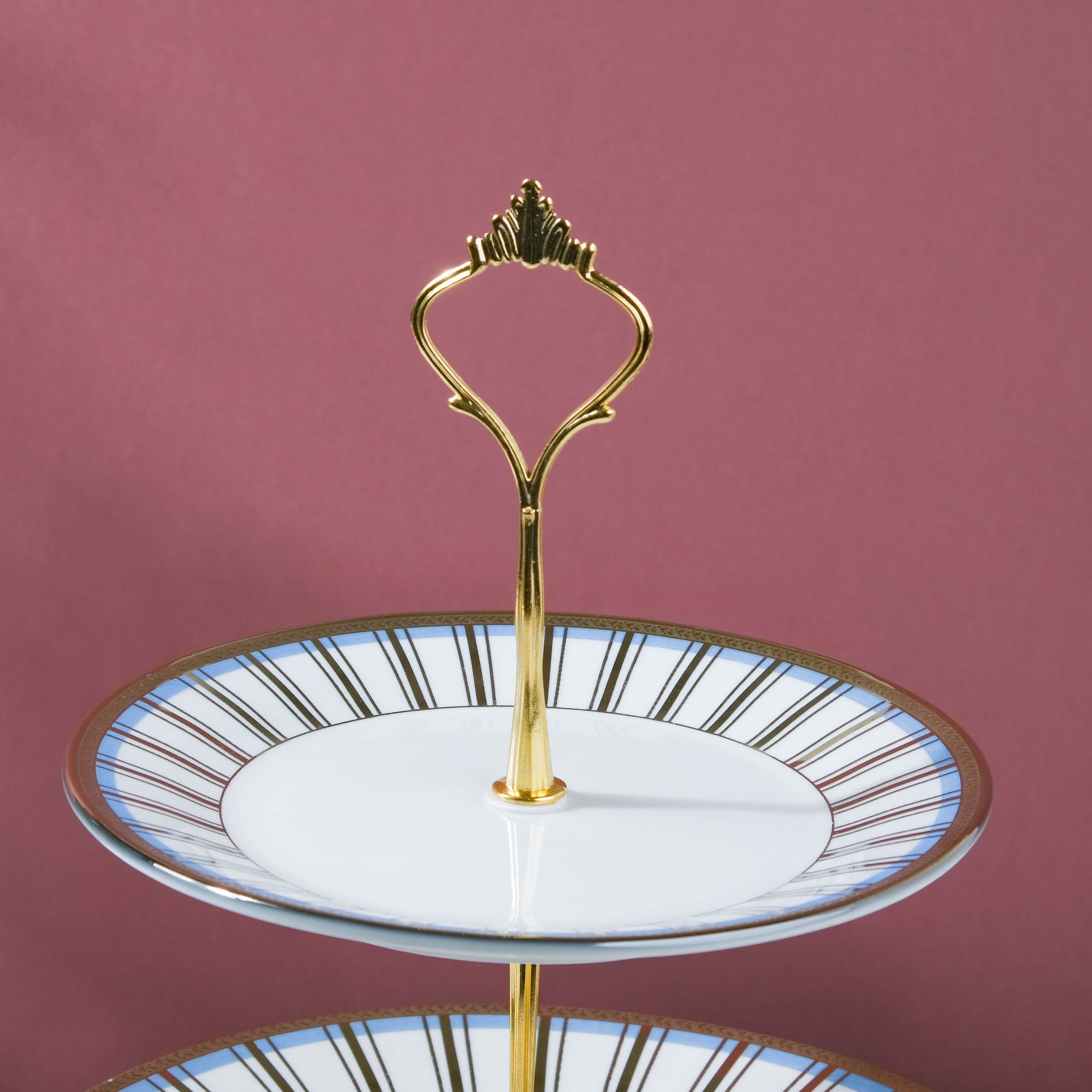 Display delectable desserts and snacks with ease in the 3-tier display stand. The stand may be placed as the table centerpiece to display homecooked delicacies or fresh fruits. The 3 ceramic plates feature gold detailing that elevates the table setting while ensuring that all the dishes can be presented with utmost creativity. The stand makes a serving look aesthetic and organised that is easy to pick and place. Nestip: Use the plates for placing tea lights for a festive decor. Size: 13.7” H (Plate 1 - 10.6” D x 1” H, Plate 2 - 9” D x 1” H, Plate 3 - 7” D x 0.7” H) [35cm H (Plate 1: 27cm D x H-3cm H) (Plate 2: 23cm D x 3cm H) (Plate 3 H-2cm H x 18cm D)] Color: White, blue and gold Material: Ceramic Products included: 1 metal stand, 3 plates Style: CFDH83C23