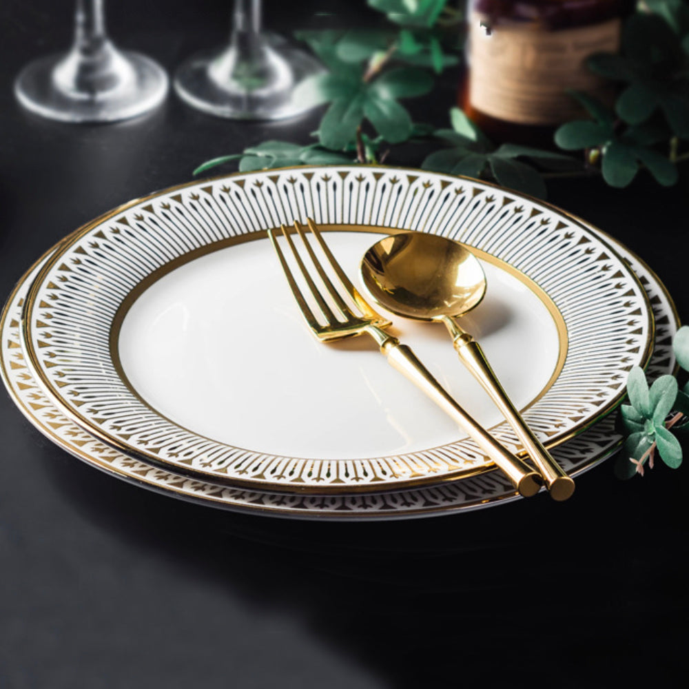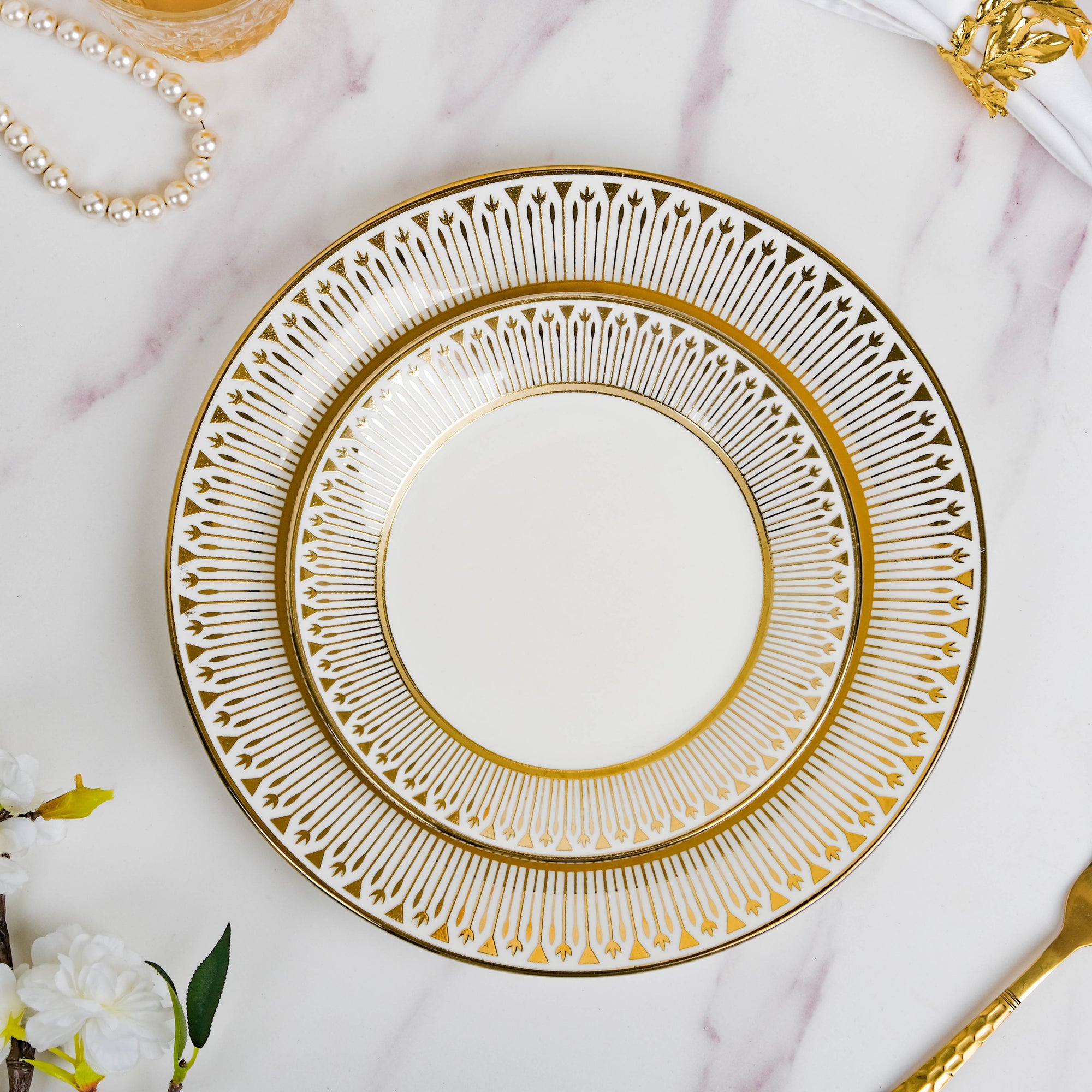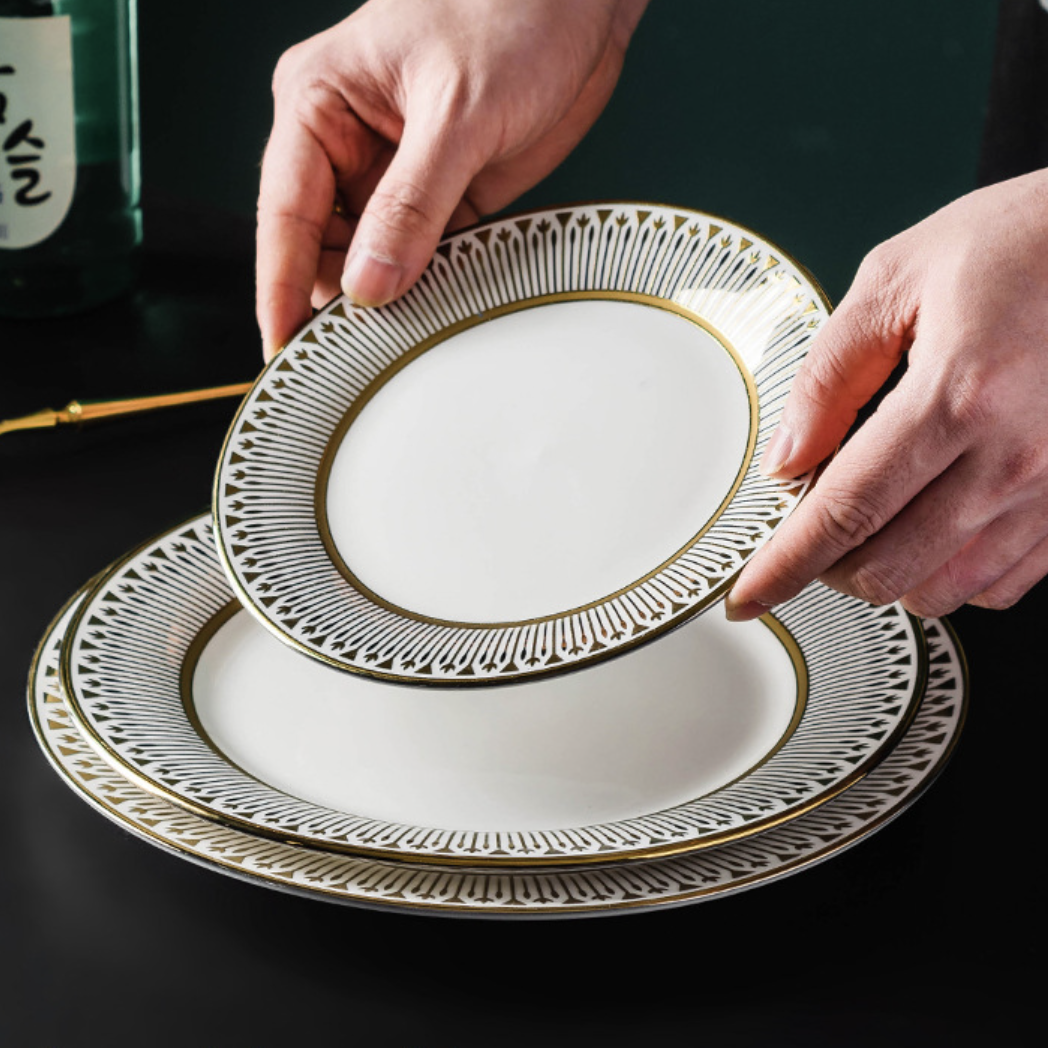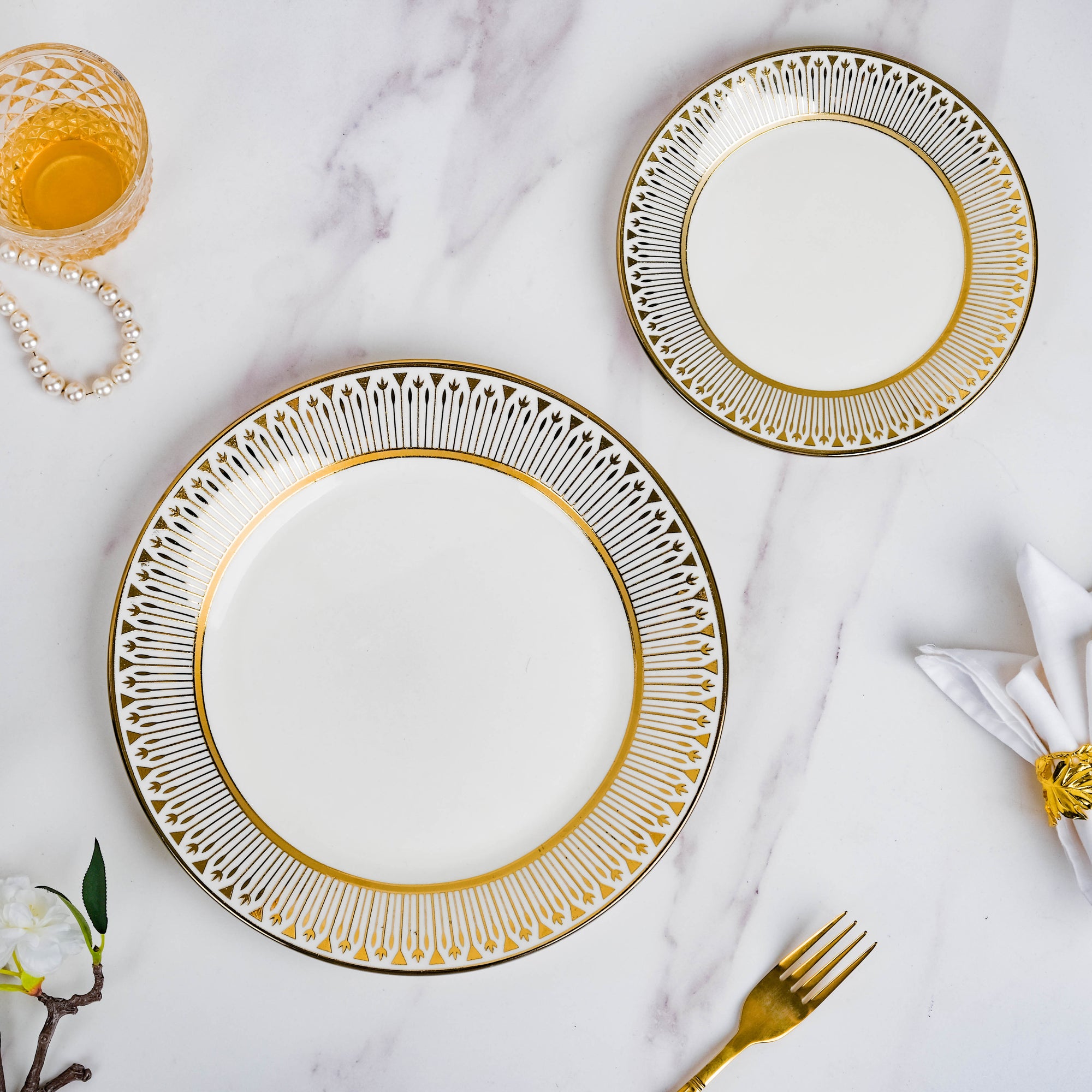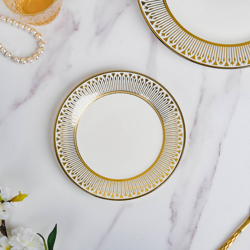 The ceramic dish with its gold and royal blue patterns defines opulence and durability. The plate is sumptuous and has been manufactured with high-quality, chip-resistant ceramic that is sure to provide the finest dining or snack-time experience. The stark glazed white of the ceramic is perfect in contrast to the lustrous gold, making them stand out on the table. Nestip: Pair the plates with classic trays for serving guests in style. Size: 7.2” D x 0.7” H (18.5cm D x 2 cm H) Color: White and gold Material: Ceramic Products included: 1 plate Style: CFDH83C31