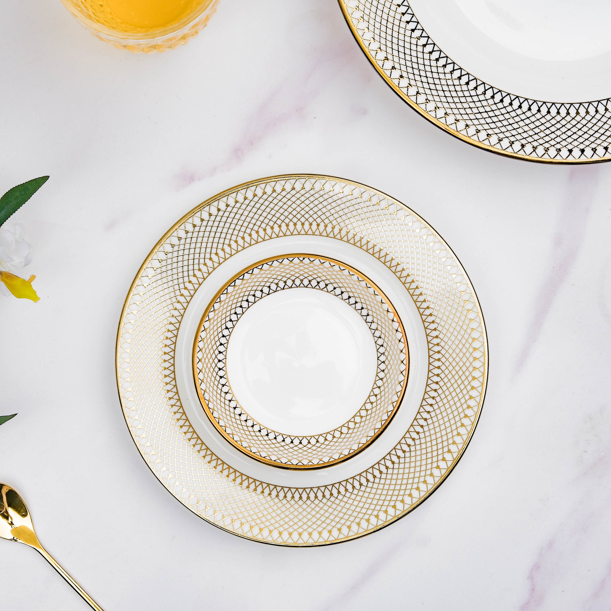 The ceramic plate has a raised rim with intricate gold patterns. The plate adds to the luxurious vibe on the tablescape. A sophisticated combination of lustrous gold and stark white glazed ceramic, the utilitarian dish is a must for the dinner table setup. It may be used as a side plate or to serve nuts, nibbles, and snacks during an evening get-together with warm beverages. The plate is ideal to be showcased on the table during festivities or formal dinners.