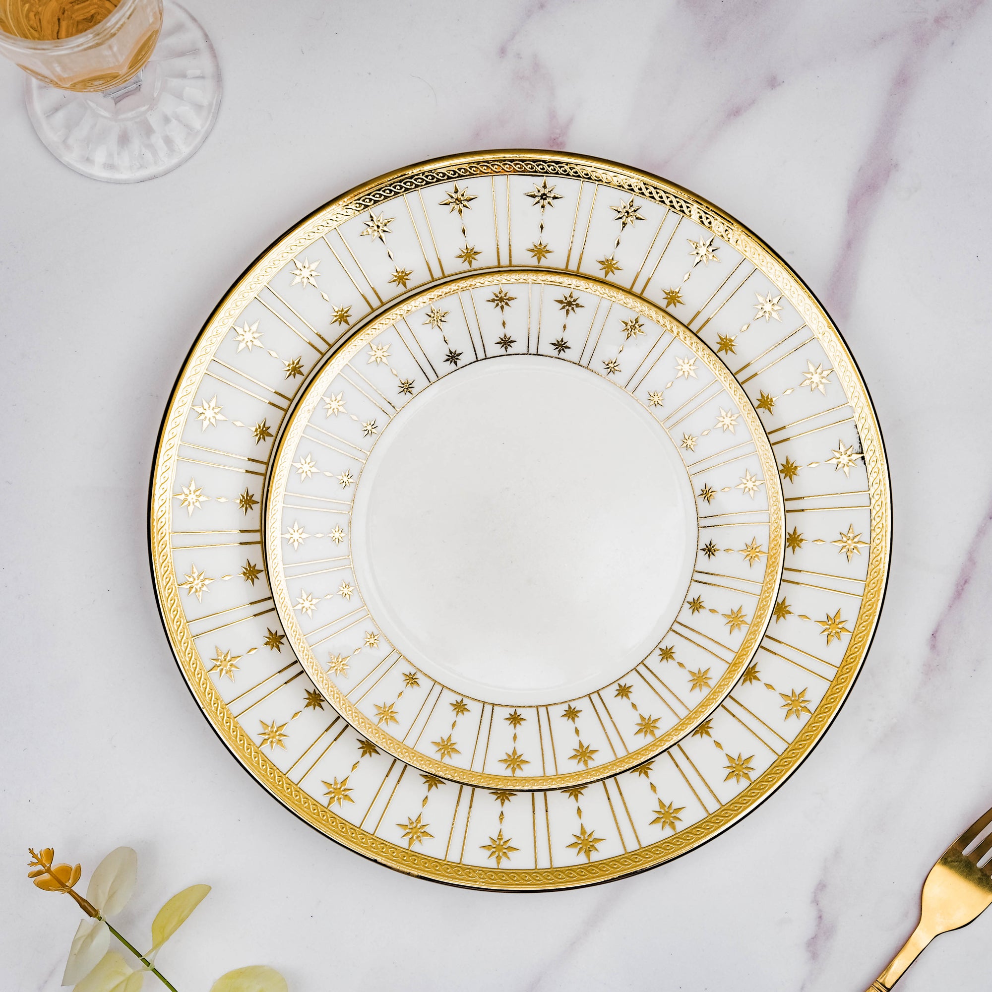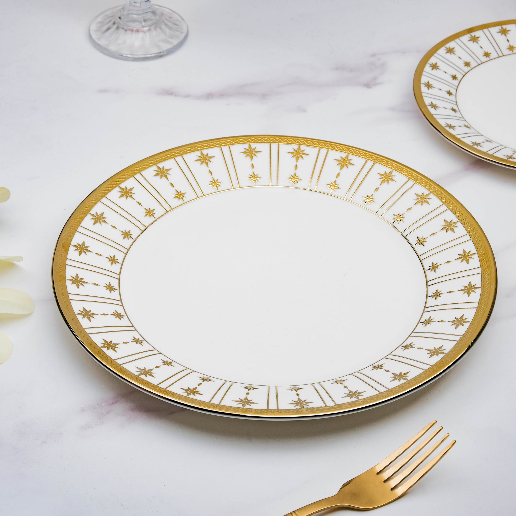 Create a luxurious dinner setting with the intricately designed dinner plate. The combination of white with lustrous gold adds to the plate's premiumness. Serve food in perfect style when guests arrive at home or one decides on a surprise luncheon with family. Made with fine quality ceramic, the plate will suit all dining needs and create a gorgeous appeal. Nestip: Clean the plate with a soft sponge to avoid scratches on the gold detailing. Size: 10.4” D x 1” H (26.5cm D x 3cm H) Color: White and gold Material: Ceramic Products included: 1 plate Style: CFDH83C34