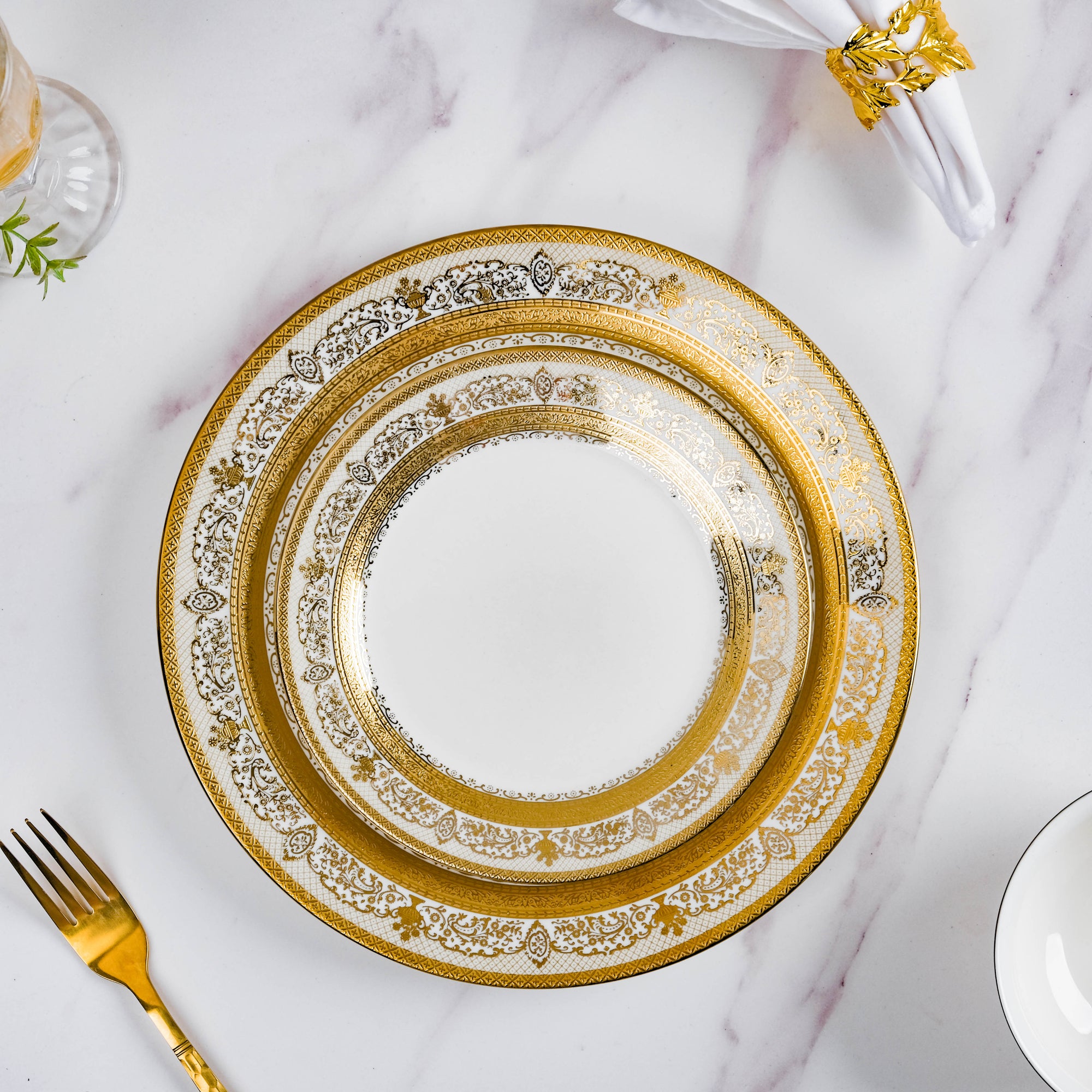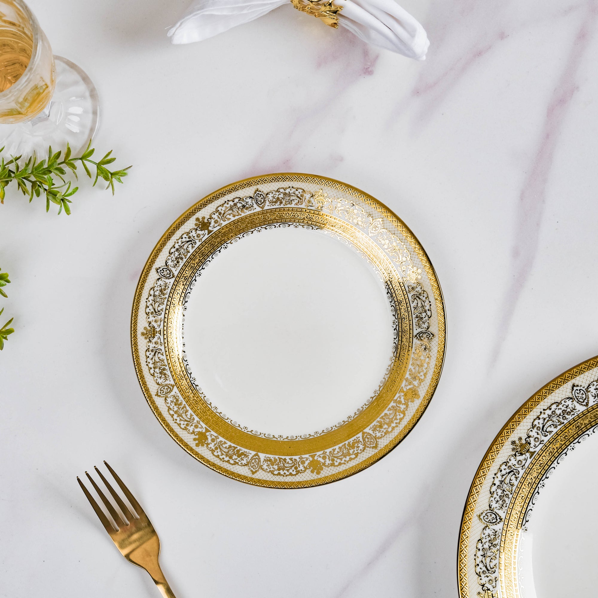 The exceptional ceramic snack plate defines elegance on the table. The brilliant white ceramic glaze enhances the ornate gold encasing the surface of the circular plate. The plate adds a luxurious touch to the table setting and can be used to serve noodles, pasta, or fries and fritters. The intricate floral designs on the plate's rim transports one back to an enchanting royal dinner setup.