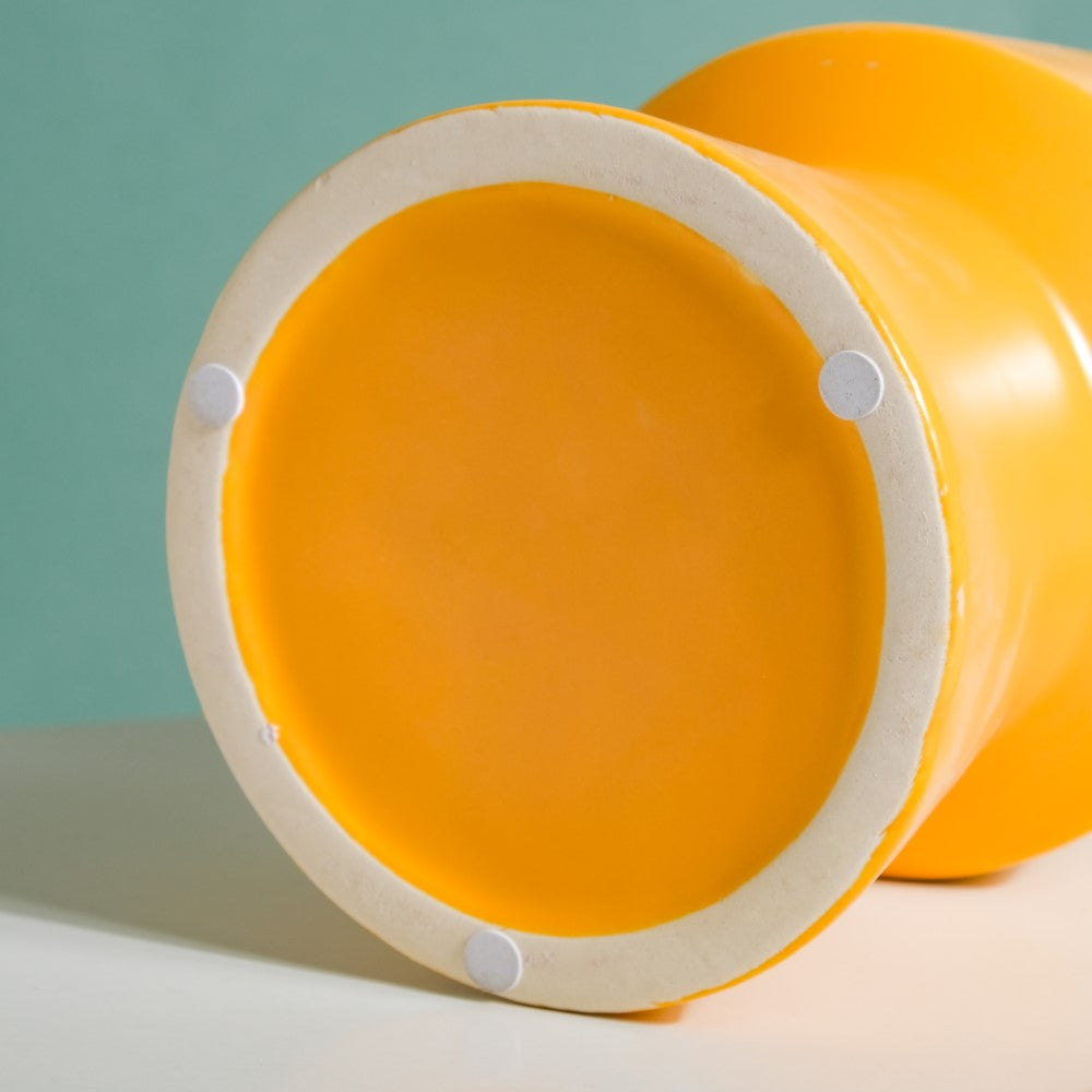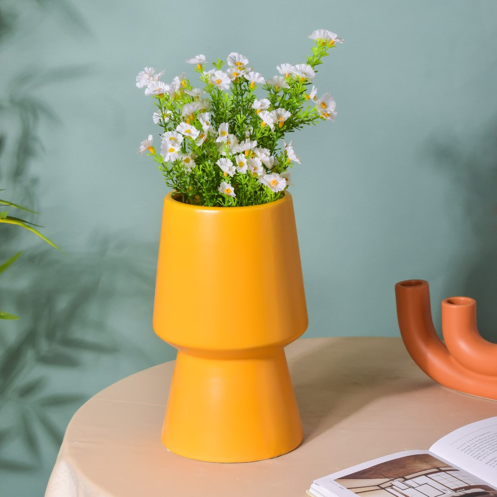 The sunny tone of the ceramic tall vase makes it a vibrant addition to any minimalist household or modern home decor. The 9-inch flower vase will surely stand out amongst other ceramic pots due to its smooth finish, matte surface and premium quality assurance. It's perfect to be used as a decoration for a party or a formal dinner setup. The yellow flower pot will look beautiful as a flower vase for the bedroom, living room, near the window, or on the coffee table. Features: -Premium quality -Handcrafted, artisanal -Solid colour -Semi-matte finish -Foam base -Scratch resistant -No outlet -With stand -Perfect for gifting Nestip: The yellow ceramic flower vase can be gifted to a friend for a housewarming. Size: 14cm D x 24cm H Colour: Yellow Material: Ceramic Products included: 1 vase Style: Vnov155