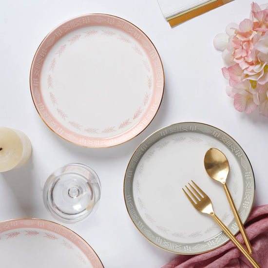 The ceramic plate is available in two colour variants with pink and grey textured borders.