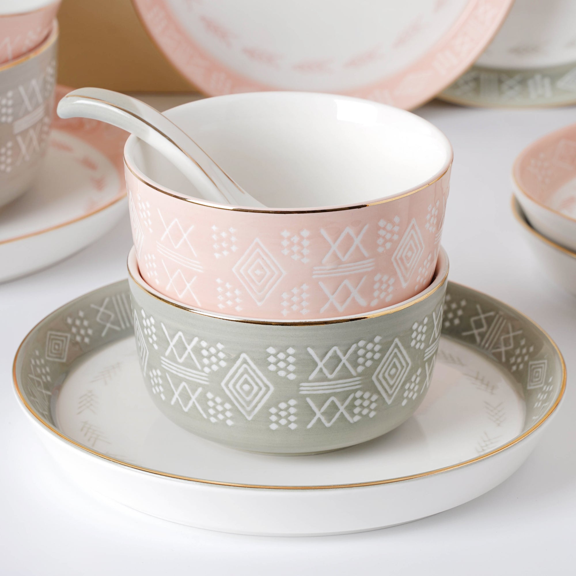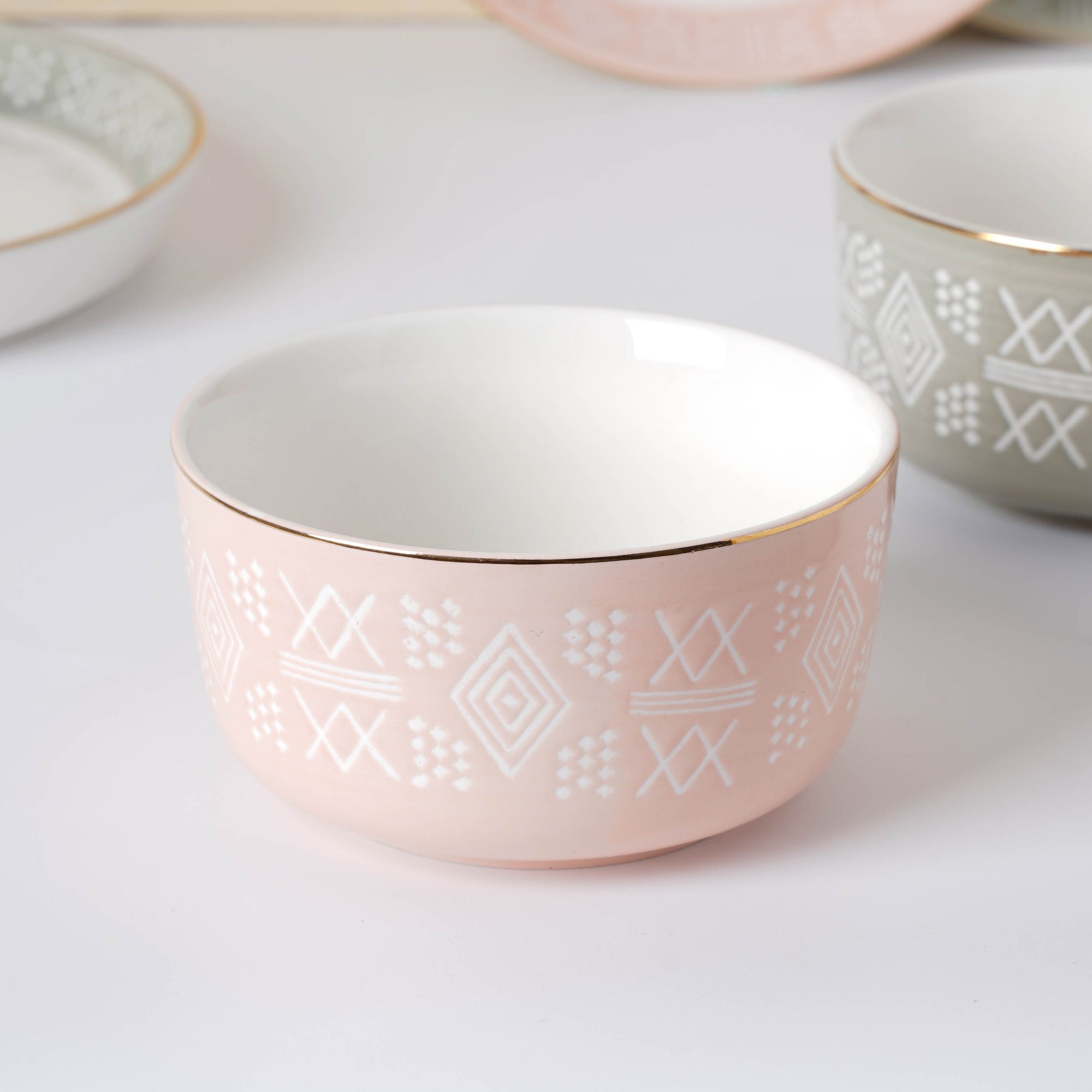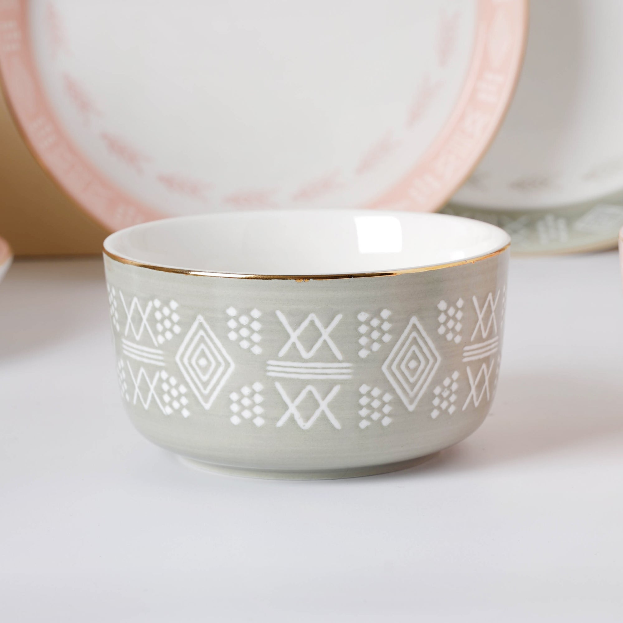 White side bowl or soup bowl that comes with a pink or grey border and a fine gold lining along the rim is from the Azo collection. The border of the ceramic bowl has an intricate design that can elevate the look of the dinner table serving along with the food. Create a snack bowls set or use the ceramic side bowl to serve fruits or vegetables with curry. One can also use the white side bowl as a dessert bowl for serving ice cream and more. Pair the soup serving bowl with the soup spoons from the collection if it is being used to serve soup or breakfast. Create a side bowl set or a soup bowl set with the ceramic bowls and create a lasting impression on guests.