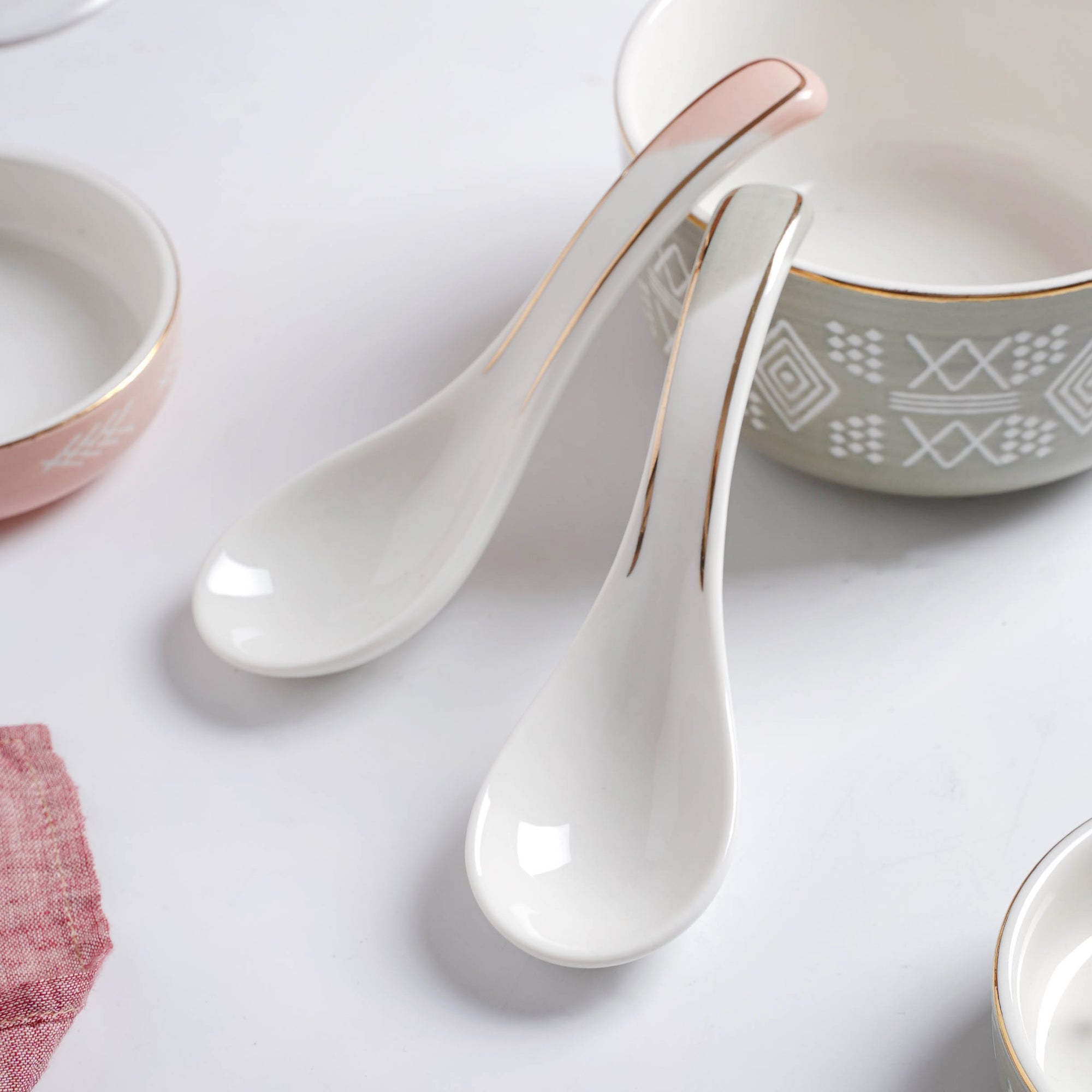 White soup spoon with a fine gold lining along the edges of the spoon looks elite. Pair the soup spoons with the soup bowl or the side bowl from the collection and serve hot soup to family or guests. One can also use it as a spoon for cereals at breakfast. The ceramic soup spoon is available in 2 colour variants to choose from. Create a soup spoon and bowl set for gifting friends and family.