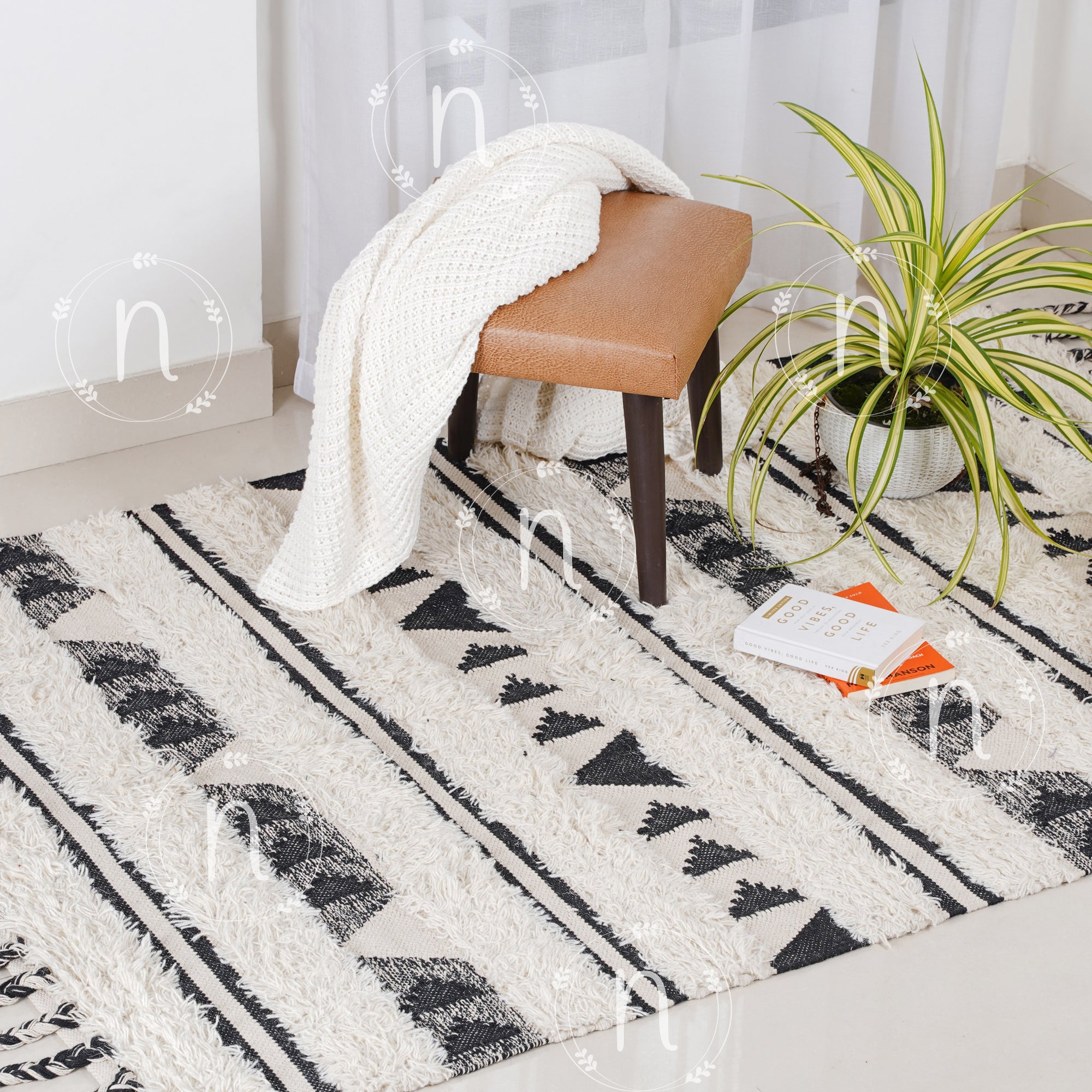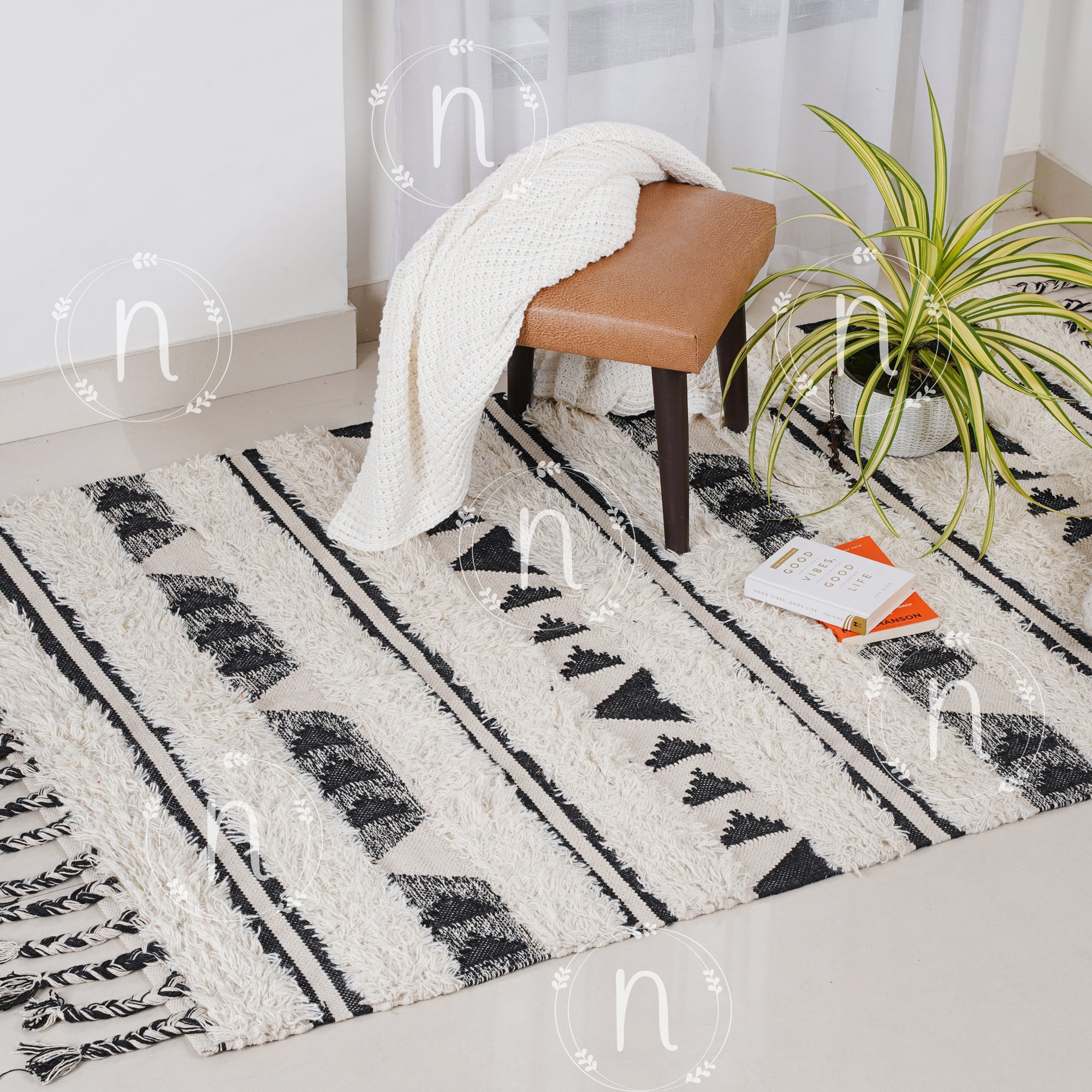 Geometric black and white Aztec pattern rug is a textured rug to elevate the decor of any space and make it look boho chic. The patterned handwoven knotted rug is a classic option to add to any living room or dining space area, and it gives off a Bohemian vibe.