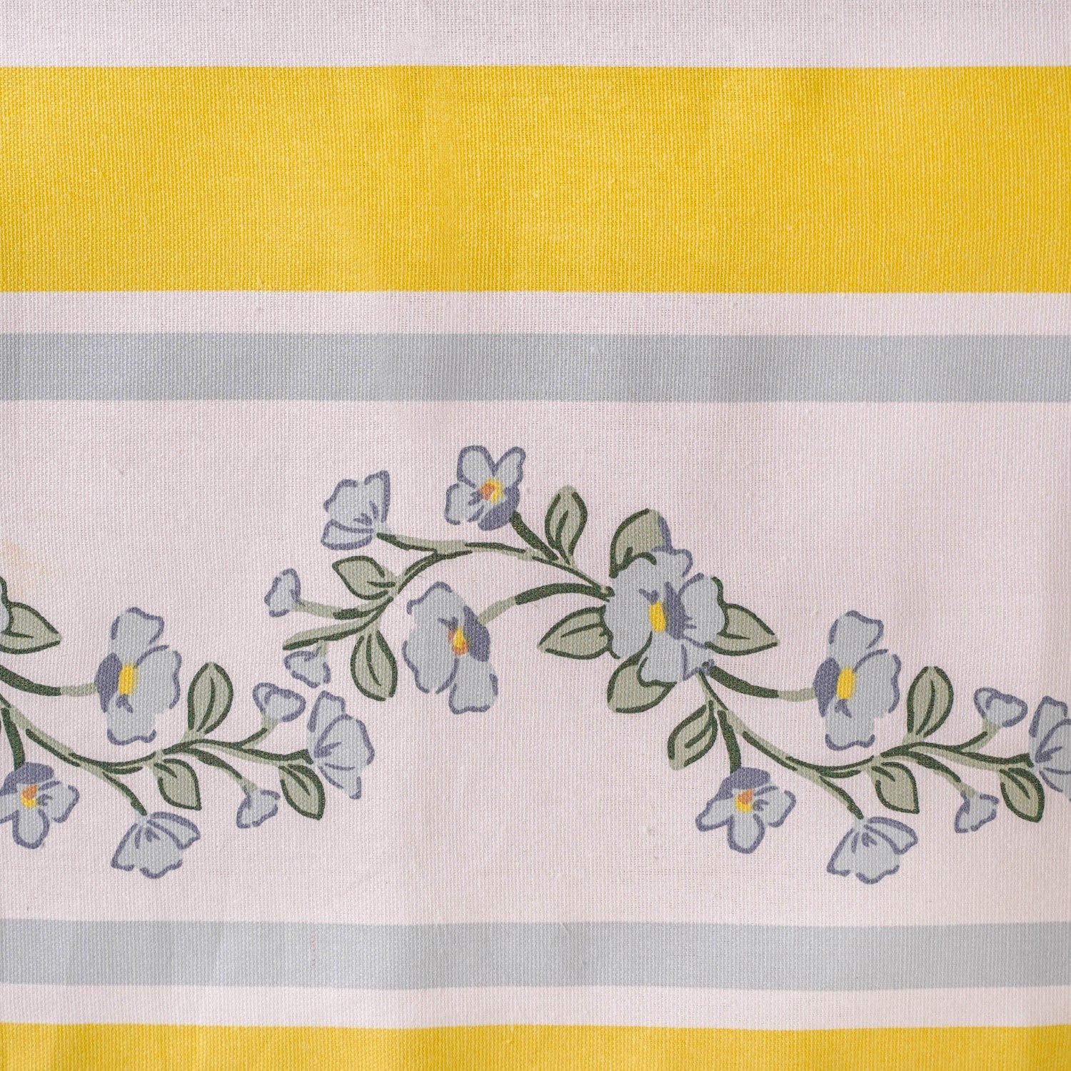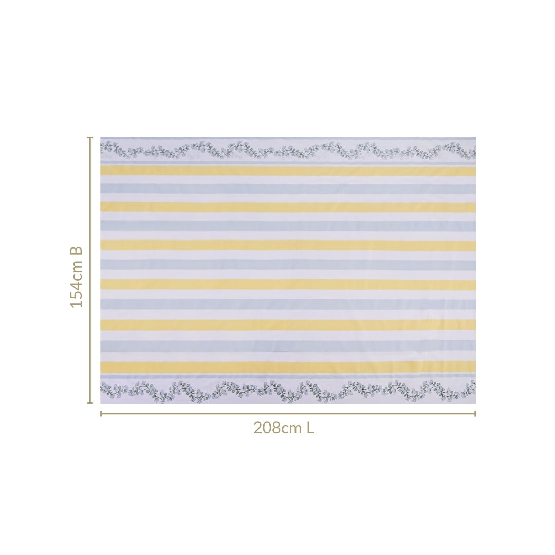 Design: Crafted from high-quality cotton, the Azzurro dinner table cloth features a classic white backdrop adorned with delicate blue flowers and green stems, accented by vibrant yellow and dark green stripes. The intricate design adds a sophisticated touch while maintaining a fresh, inviting look. Its soft yet durable fabric drapes elegantly over the table, providing a seamless blend of style and functionality. Whether paired with a matching table runner or complemented by solid-coloured napkins, this table cover creates a harmonious dining atmosphere.