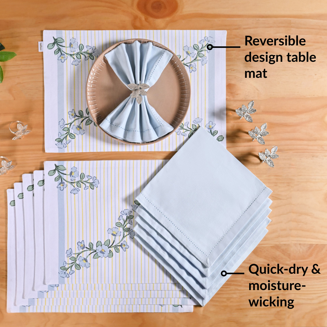 Design: This table linen hamper features a set of six table mats adorned with delicate floral and botanical motifs on a crisp white base. Subtle vertical accents in soft yellow and light blue add visual interest without overwhelming the design. The set is complemented by solid light blue cotton napkins and is finished with leaf–shaped brass napkin rings. All elements come neatly packed in an elegant hamper box, making the set visually cohesive and gift-ready.