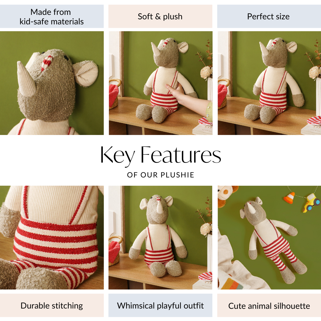 Design: This plush rhinoceros is shaped as a soft fleece buddy with a distinctive large horn featuring red stripes. It wears a smooth cotton shirt and trousers, with firmly attached red and white striped suspenders. The textured plush body contrasts with smooth cotton parts, and the bottom half features striped cotton material. The toy is firmly stuffed with resilient polyfill material. Its sturdy limbs and head are well-stitched, while large, rounded floppy ears complete the rhino’s charming look.