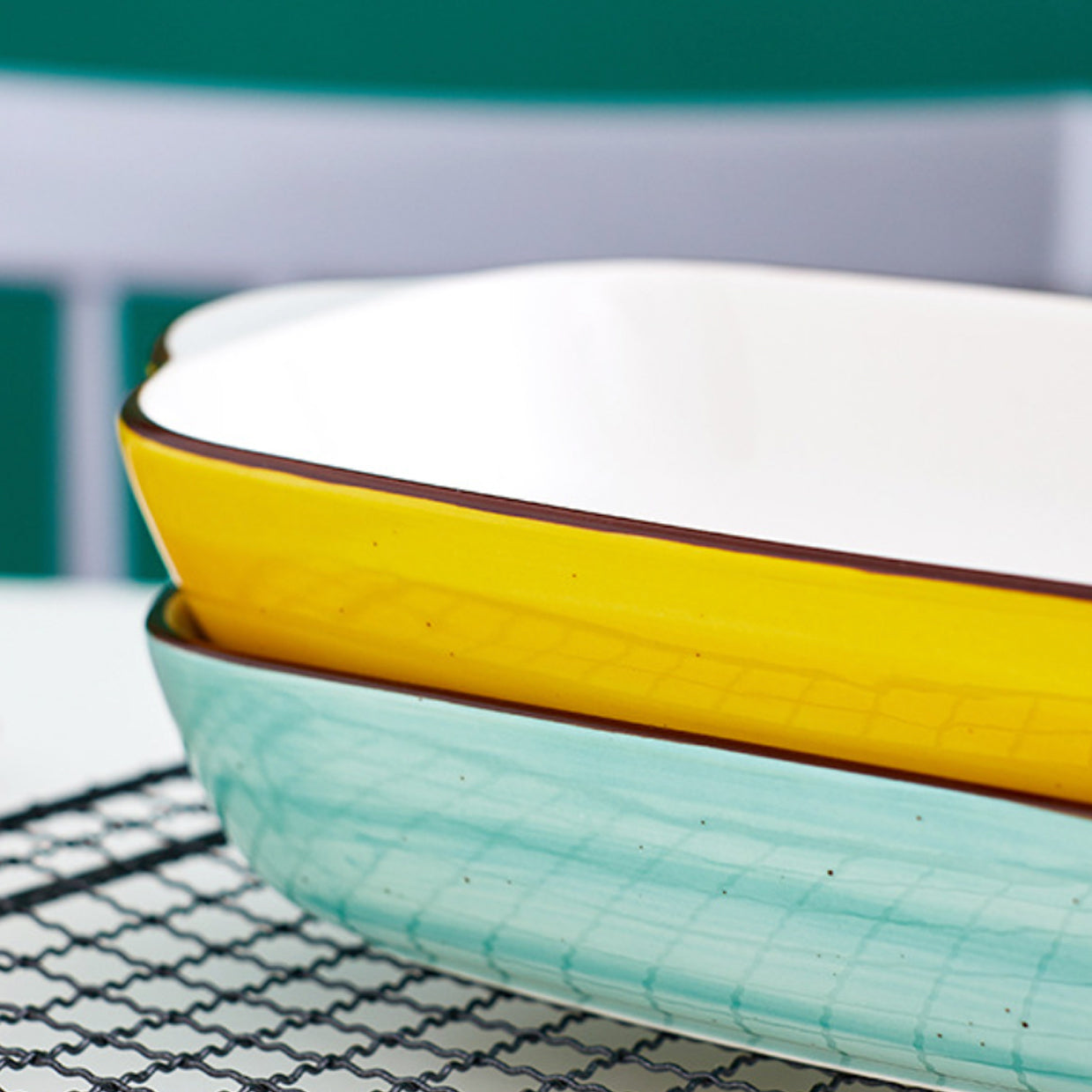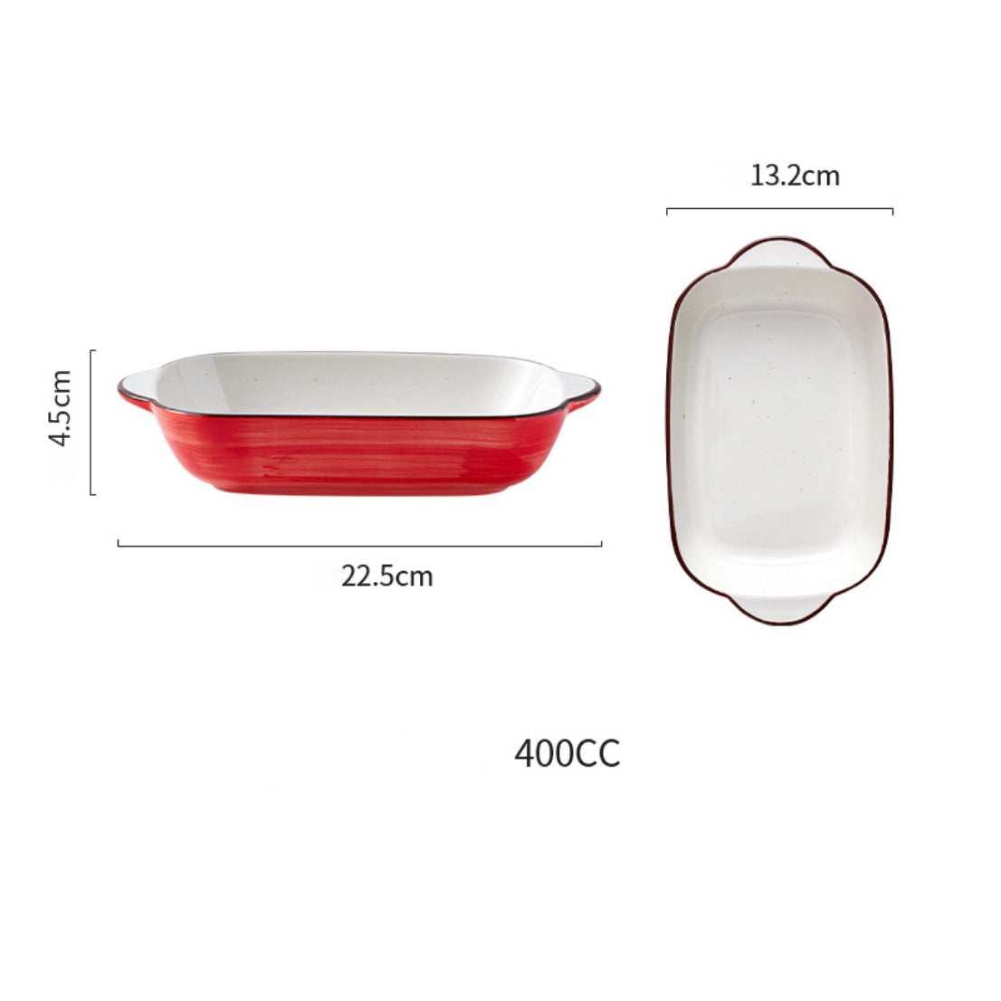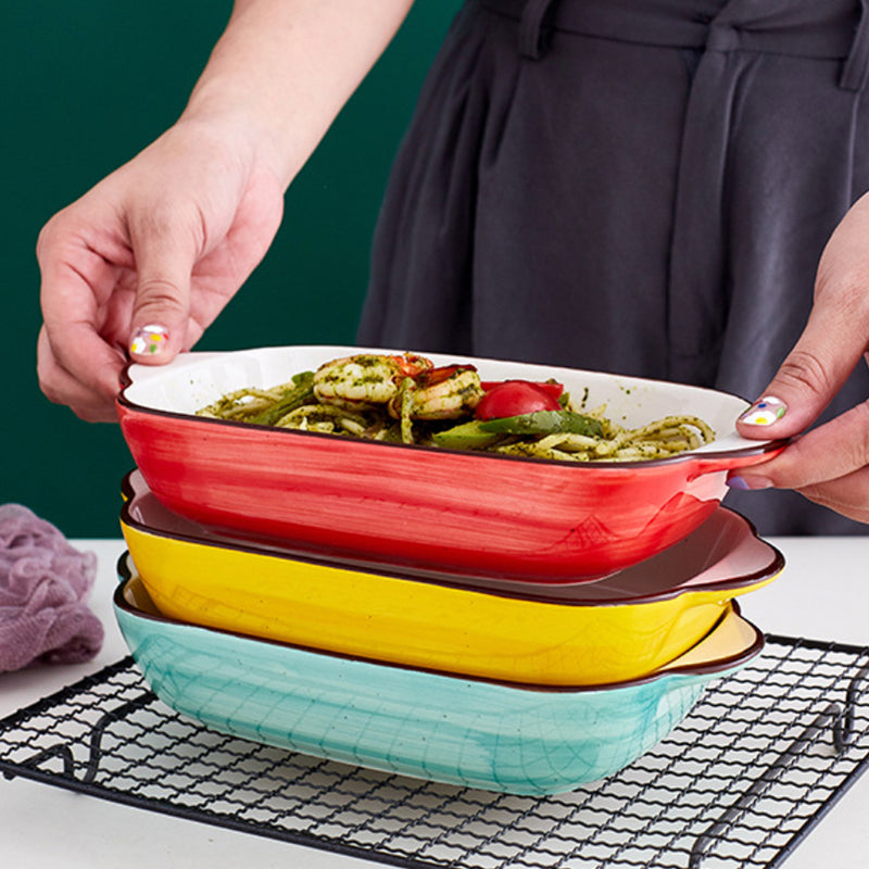 Baking dish for microwave that comes with a white inner surface and a bright outer surface with colour variants to choose from. The ceramic bakeware comes with handles that make the baking dish easy to hold and serve. Bake dishes like au gratin, baked potatoes, mushrooms, vegies, bacon and chicken, mud pie, cookies, brownies or simply use the bowls with handle to serve snacks and sides. The trays have speckled surface that is microwave and oven safe.