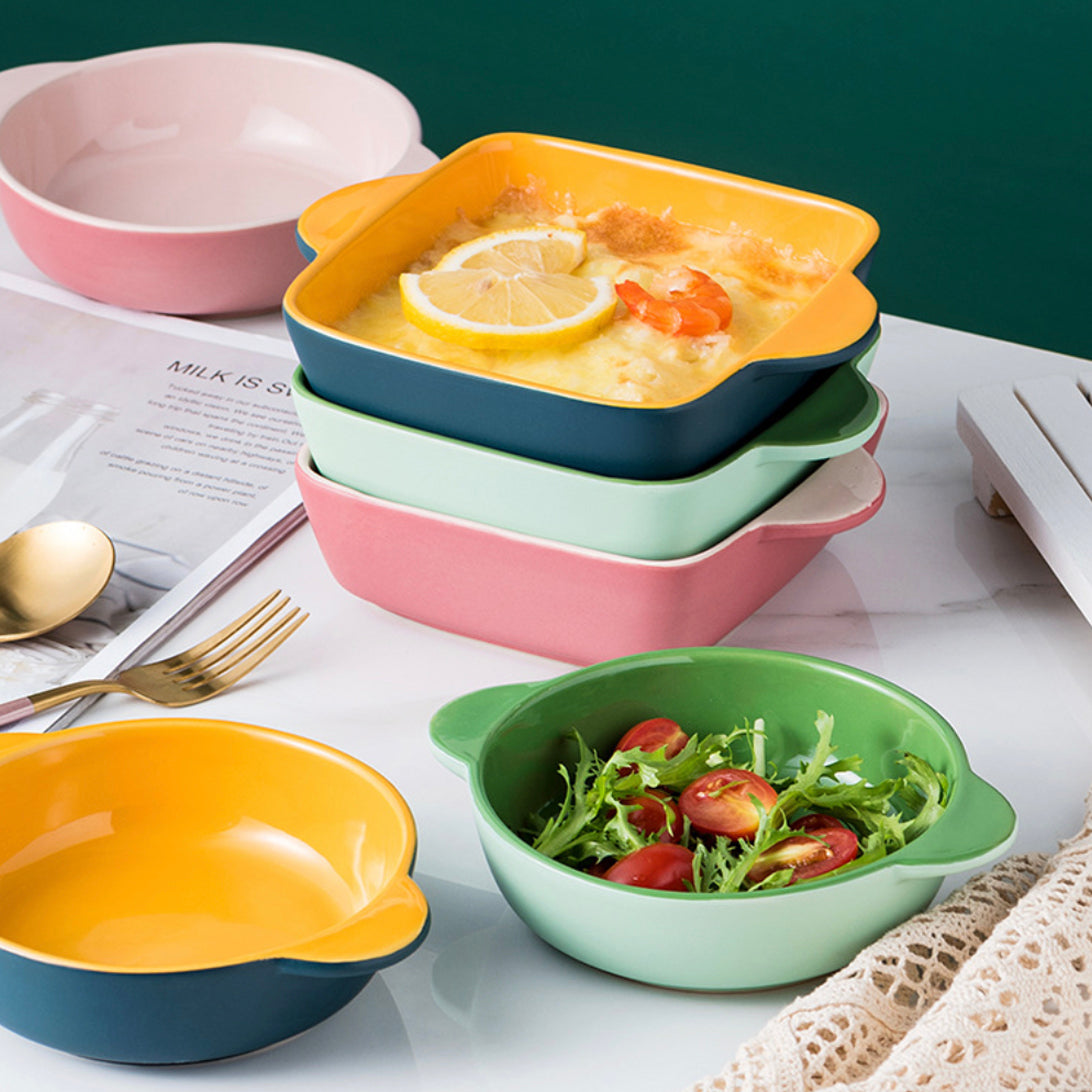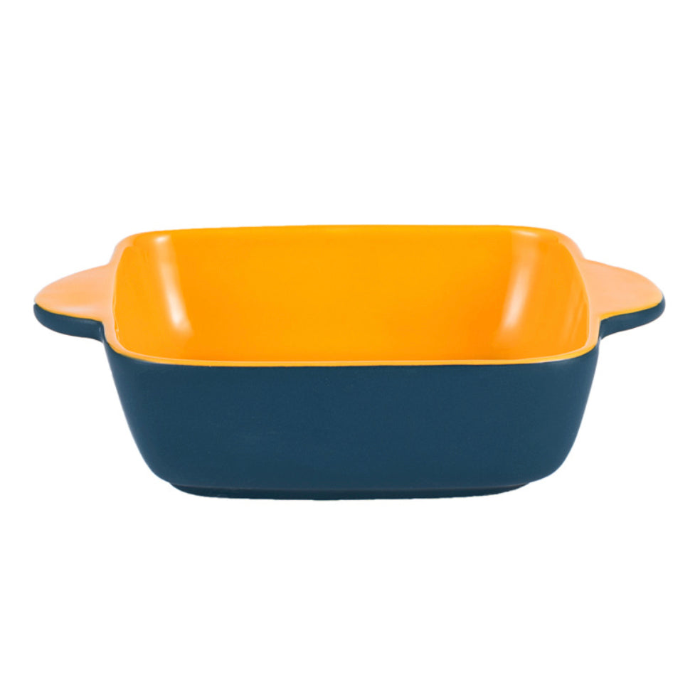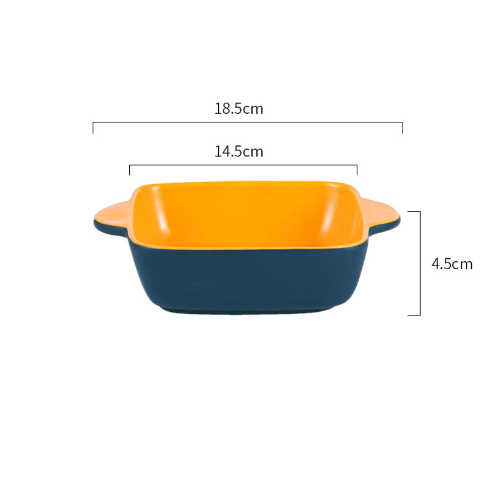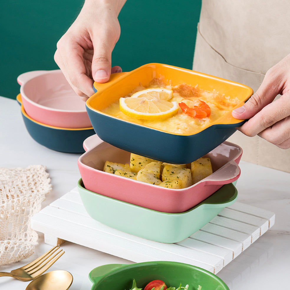 Baking dish for oven in a square shape that is made in ceramic and comes in colour variants. The baking dishes have different colours on the inner surface and outer surface that can make a table serving pop with bright hues. The microwave safe bowls are great for baking or grilling that can also be used for serving directly. Bake pastas, lasagna or grill kebabs and vegies or toss up a salad or snacks in the baking bowl with handles.